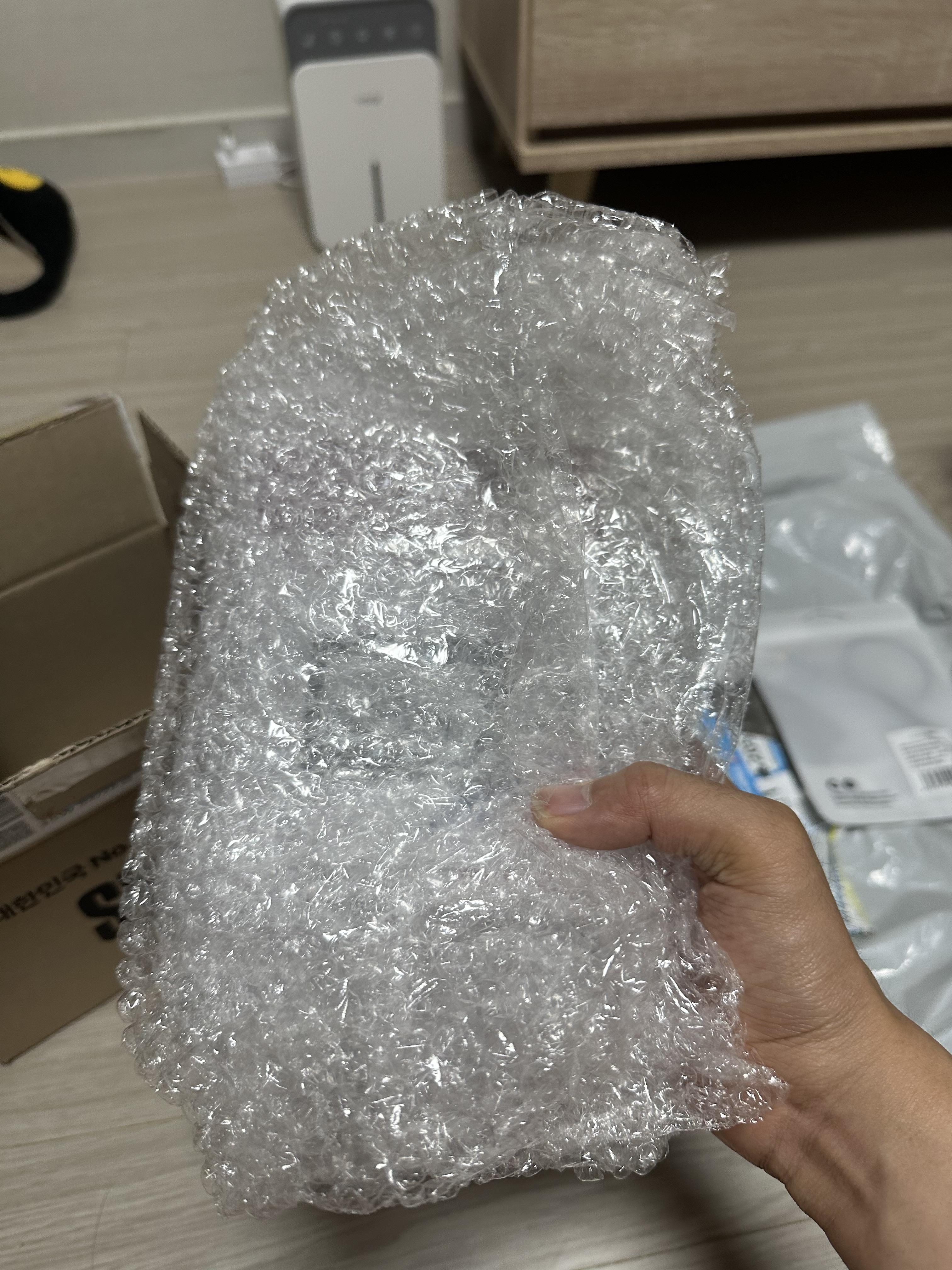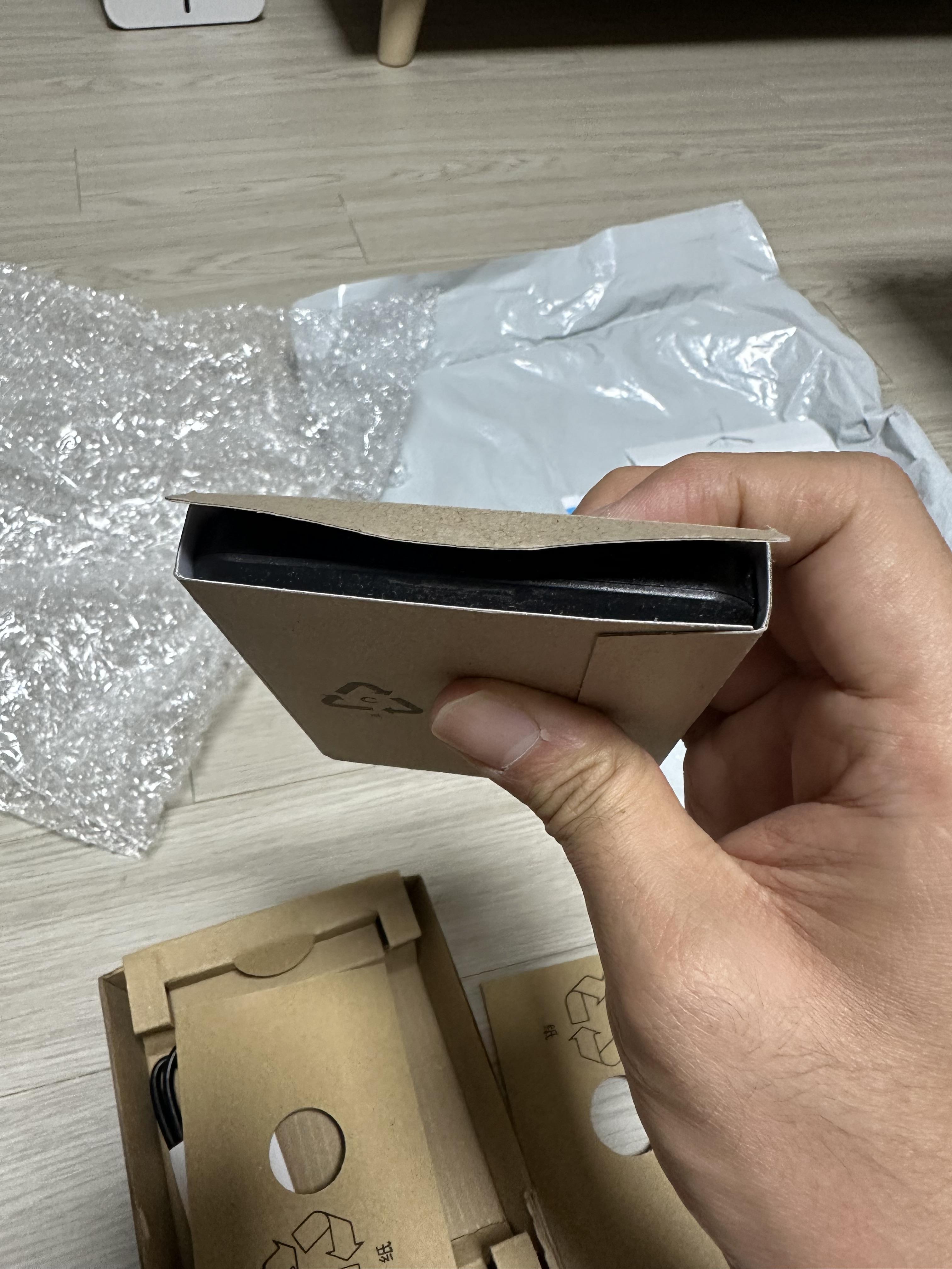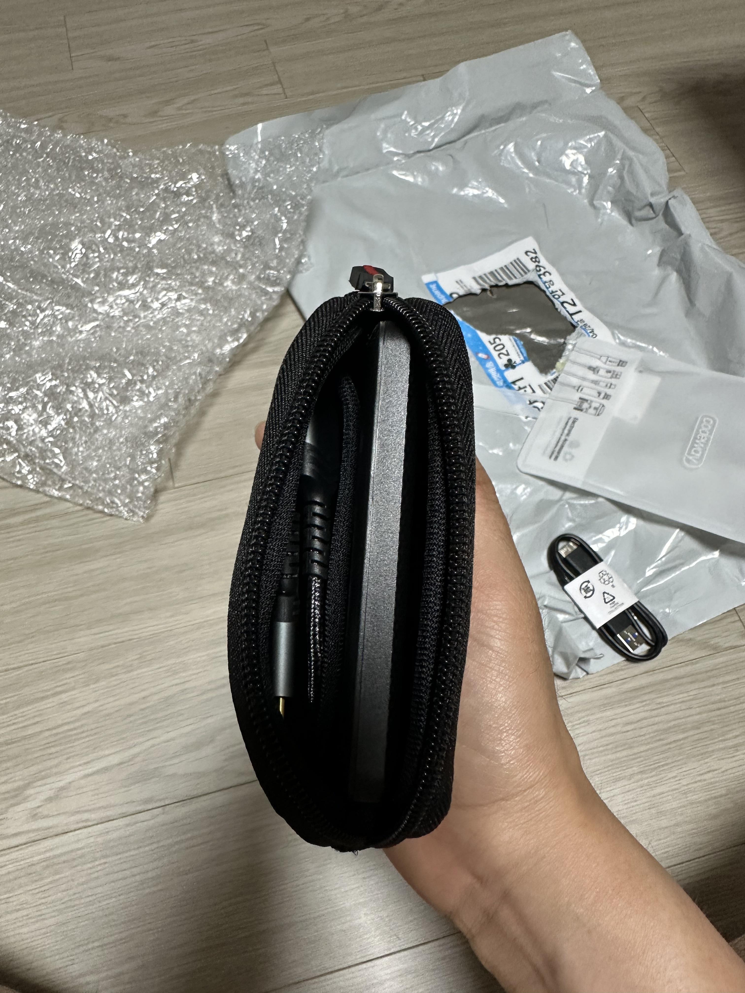 쿠팡 상자에서 도시바 외장하드를 꺼내었습니다. 상자에서 꺼낸 도시바 외장하드는 뽁뽁이라고 불리는 에어캡으로 한번 더 포장이 되어있었습니다. 아무래도 외장하드의 경우 충격에 민감하고 특히 개봉 후 사용하면서 중요한 데이터를 넣었다면 충격에 더 민감하고 망가질 경우에는 문제의 소지가 있겠죠. 도시바 외장하드의 에어캡을 벗기니까 상자에 앞뒤로 볼 수 있는 곳에 파우치가 붙어있었습니다. 마치 파우치가 붙어있으므로서 외장하드를 한번 더 방어해주는 것처럼 보였습니다.