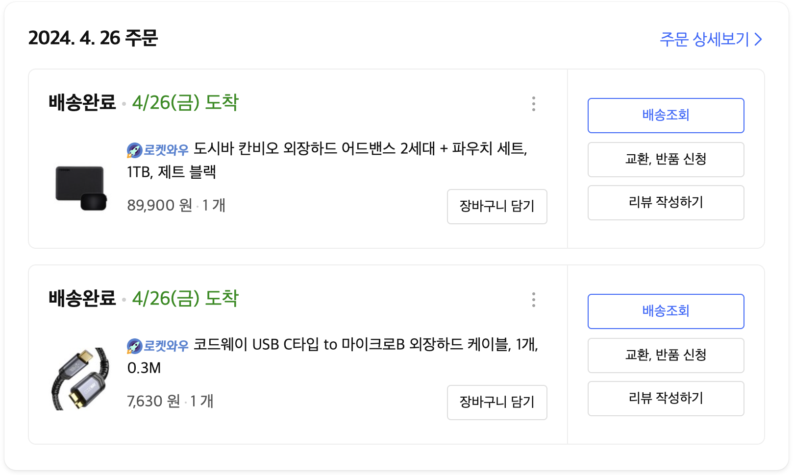 쿠팡 로켓배송을 통해 1년동안 너무 편하게 쓰고 있습니다. 특히 와우 멤버십을 통해 배송 제한없이 아무때나 편하게 주문을 할 수 있어서 좋았습니다. 그런데 올해 7월 이후부터는 와우멤버십이 올라간다고 해서 아쉽긴합니다. 그렇다고 끊자고 생각하니 쿠팡의 편리함도 함께 버릴 생각을 하니 정말 고민이 듭니다. 저는 4월 26일에 주문해서 당일만에 바로 받아볼 수 있었습니다. 쿠팡이 아니고 과연 이렇게 하루만에 받을 수 있는 이커머스 쇼핑몰이 있을까요? 있다면 소개받고 싶습니다. 특히나 외장하드는 충격에 민감 할 수 있기 때문에 박스에 취급시 주의해달라는 빨간 스티커까지 붙여있었습니다. 아무래도 바쁜 택배기사님이나 쿠팡맨들이 하기 때문에 막 던지지까지는 못하더라도 차를 통해 싣고 오기 때문에 조금의 충격을 피할 수 없을 거라고 생각됩니다.