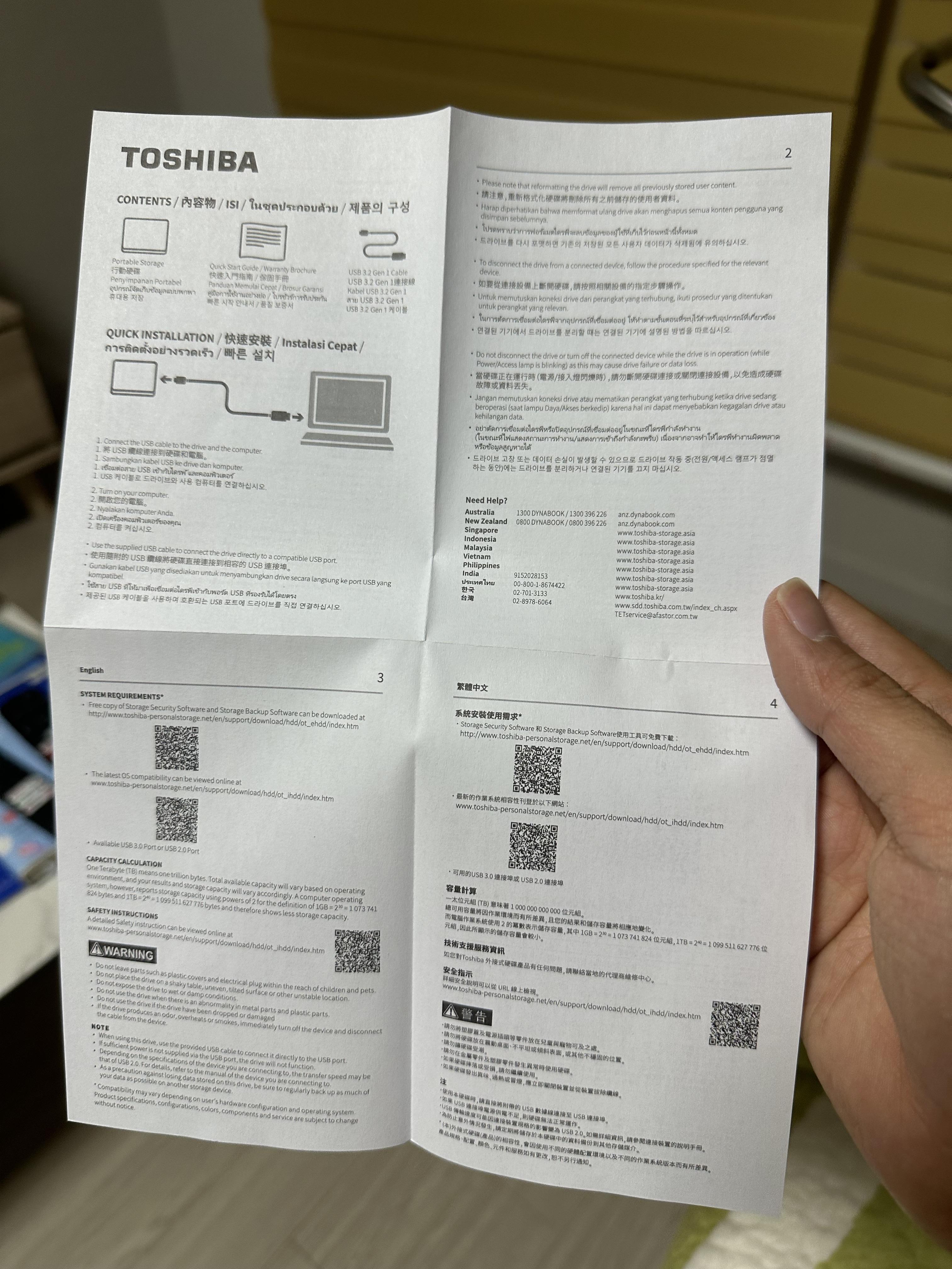 도시바 제품 박스를 분리해서 꺼내면 종이 조각으로 한번 더 이중 포장 되어있는 것을 볼 수 있습니다. 그리고 영문 사용 설명서가 함께 동봉되어있는 것을 볼 수 있습니다. 영문이라서 어떻게 보나 걱정할 수 있지만 사실 모든 외장하드의 사용법은 간단하기 때문에 설명서를 보지 않아도 큰 어려움은 없었습니다.