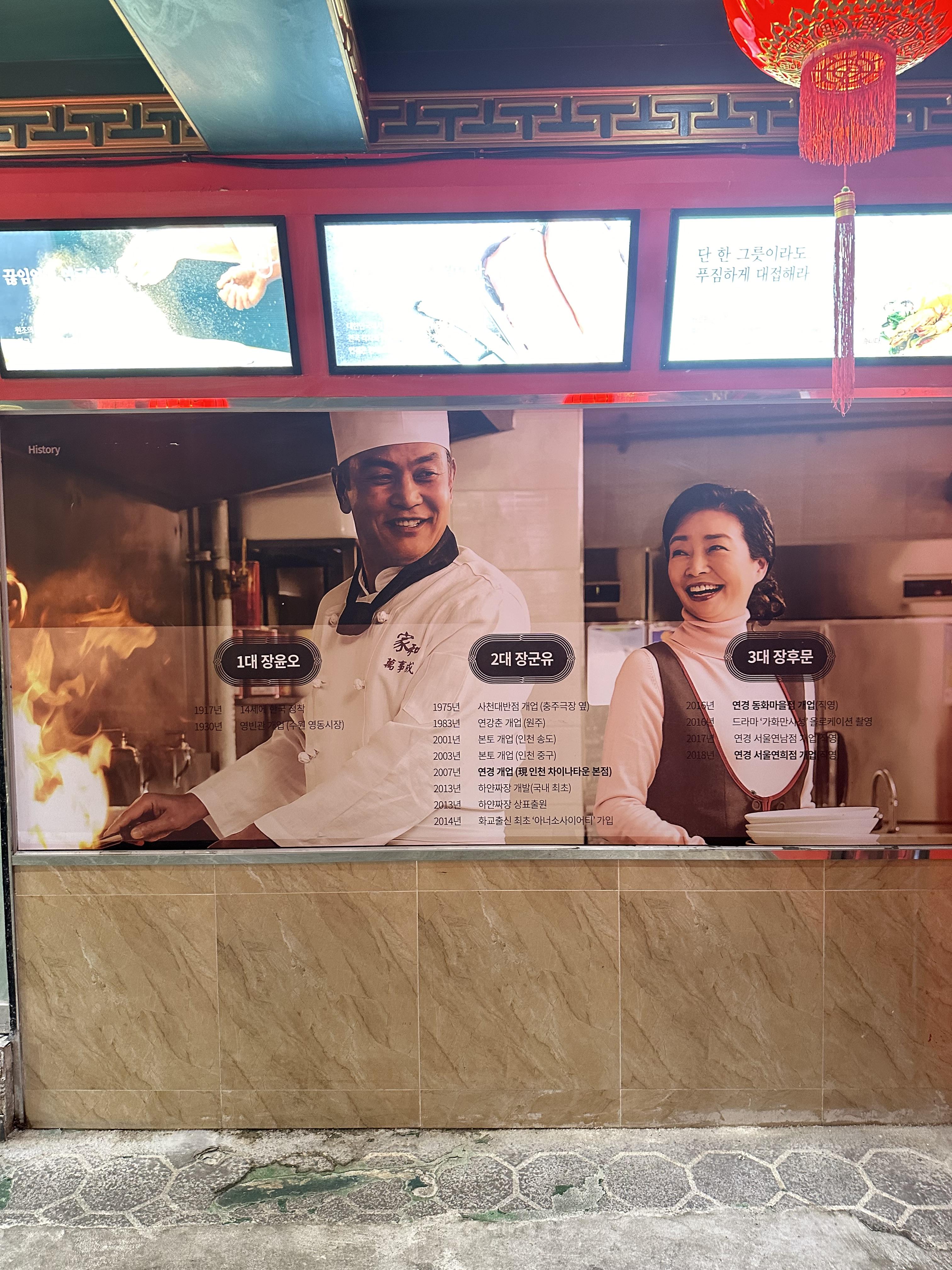 연경은 국내에 있는 중국집이지만 연경이라는 매장을 창업한 분들은 중국분들이더라구요. 하얀 짜장면먹고 1층을 보는데 연경에 대한 역사도 함께 볼 수 있었습니다. 처음에는 배우 김영철이 있어서 뭐지 했는데요. 자세히 살펴보니 1대부터 3대까지 연경을 이끌어가시는분들에 대해 적혀있었습니다.