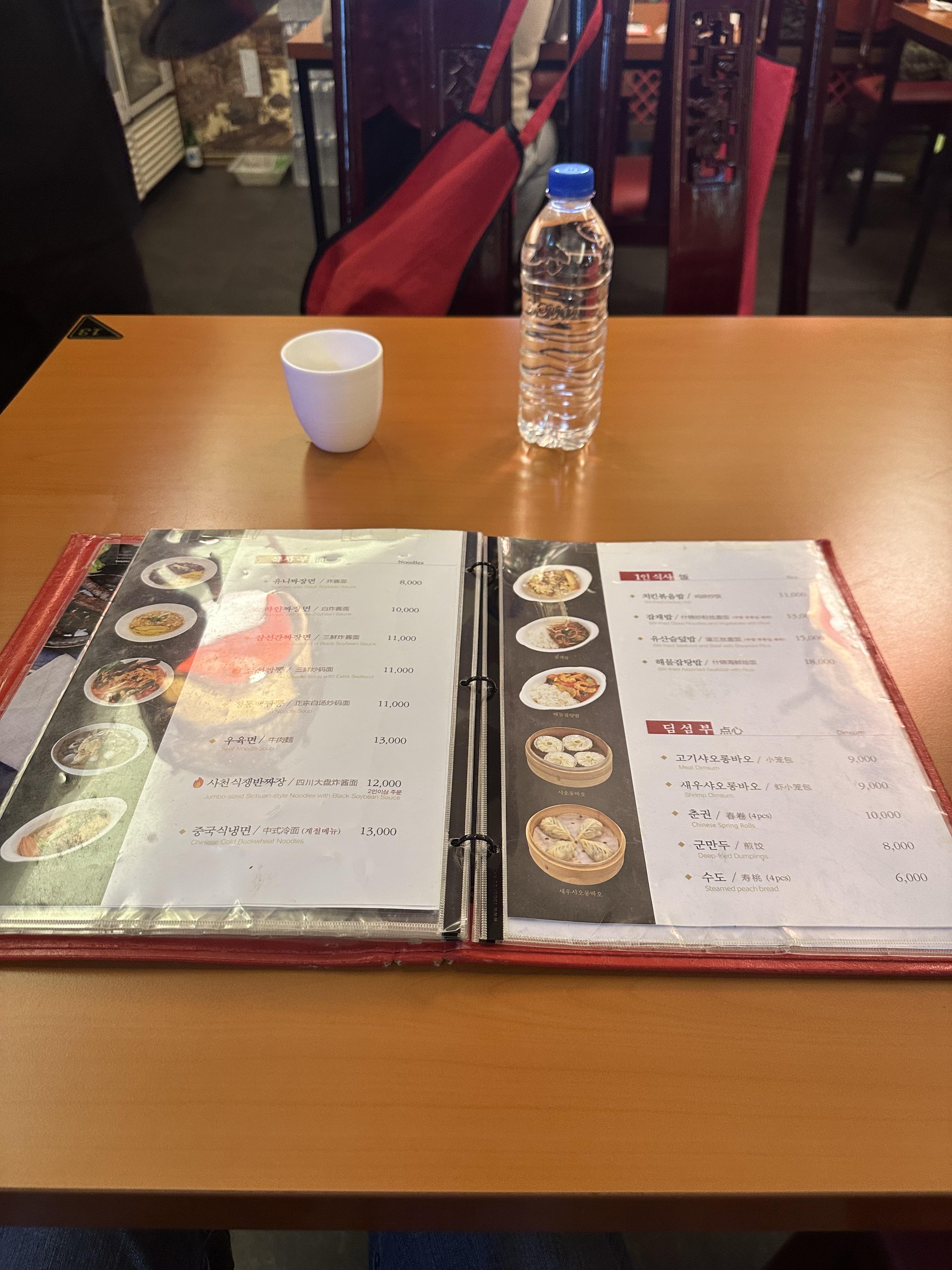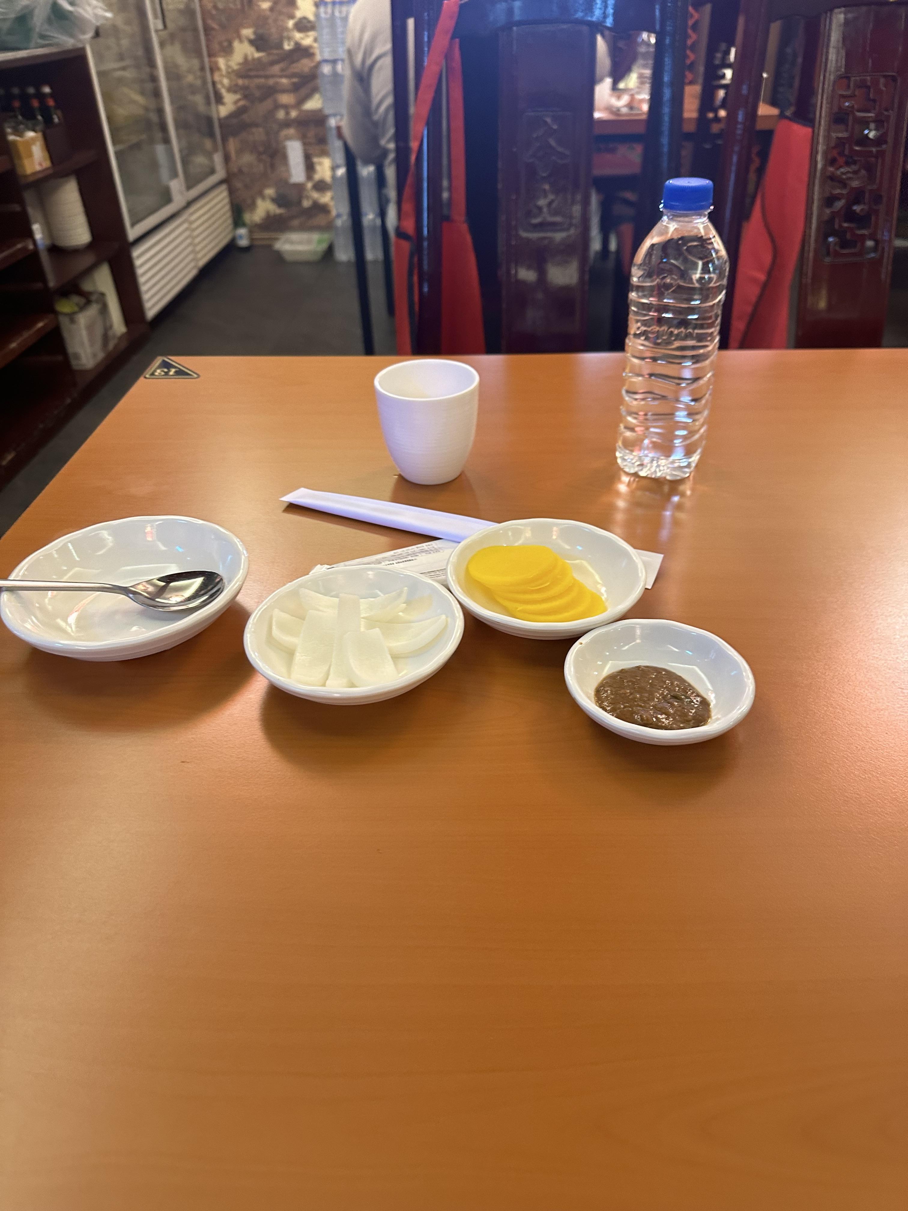 좌석을 안내받아 자리에 앉으니 중국인으로 보이는 직원분들이 물병과 메뉴판을 가져다 주었습니다. 이번에 연경에 올 때도 사실 연경이 어떤곳인지 하얀짜장면이 있었는지 모르고 즉성으로 왔습니다. 메뉴를 보는데 그래도 차이나타운에 왔으니 기억에 남는거 먹어야겠다 생각해서 하얀짜장면을 시켰습니다. 하얀짜장면은 어떻게 생겼나 궁금했습니다. 그리고 연경이 하얀짜장면 원조라는 것도 방문하면서 알았습니다. 하얀짜장면을 시키니 반찬을 가져다 주었습니다. 보통은 단무지와 양파와 함께 검은색으로 된 중국식 쌈장은 주는데요. 연경에서는 검은색 춘장이 아니라 한국에서 흔히 보는 갈색쌈장을 주었습니다. 처음 먹어보는데 나쁘지 않았습니다. 하얀짜장면과 함께 다먹으니까 직원분이 알아서 더 갖다주었습니다. 사실 돈주고 음식을 더달라고 하는 것은 당연하긴하지만 사람마다 느낌이라는게 다르죠 귀찮아서 말하기 싫을수도 있고 그런데 이렇게 알아서 주니까 친절함도 느껴지고 더 좋았습니다.