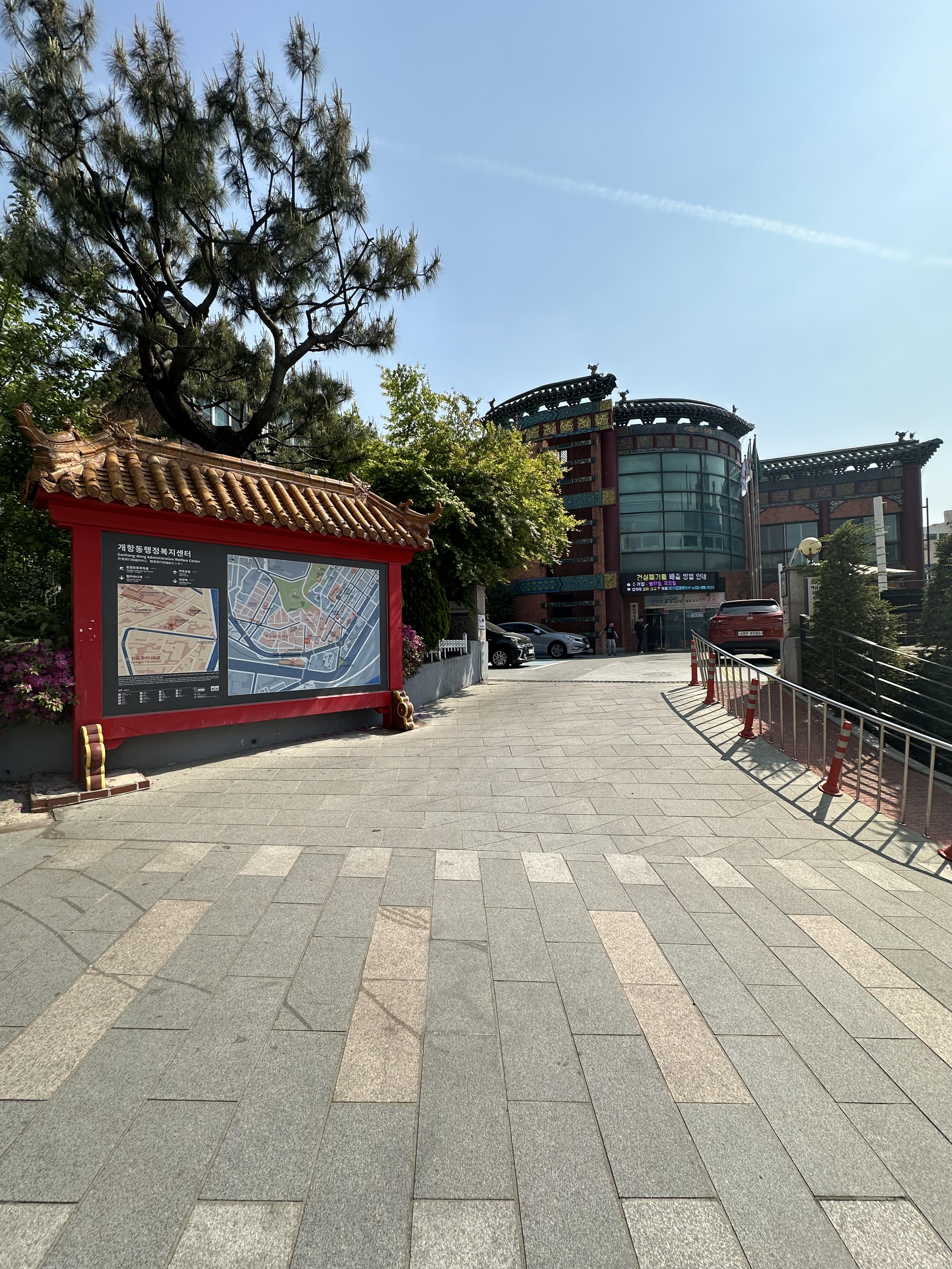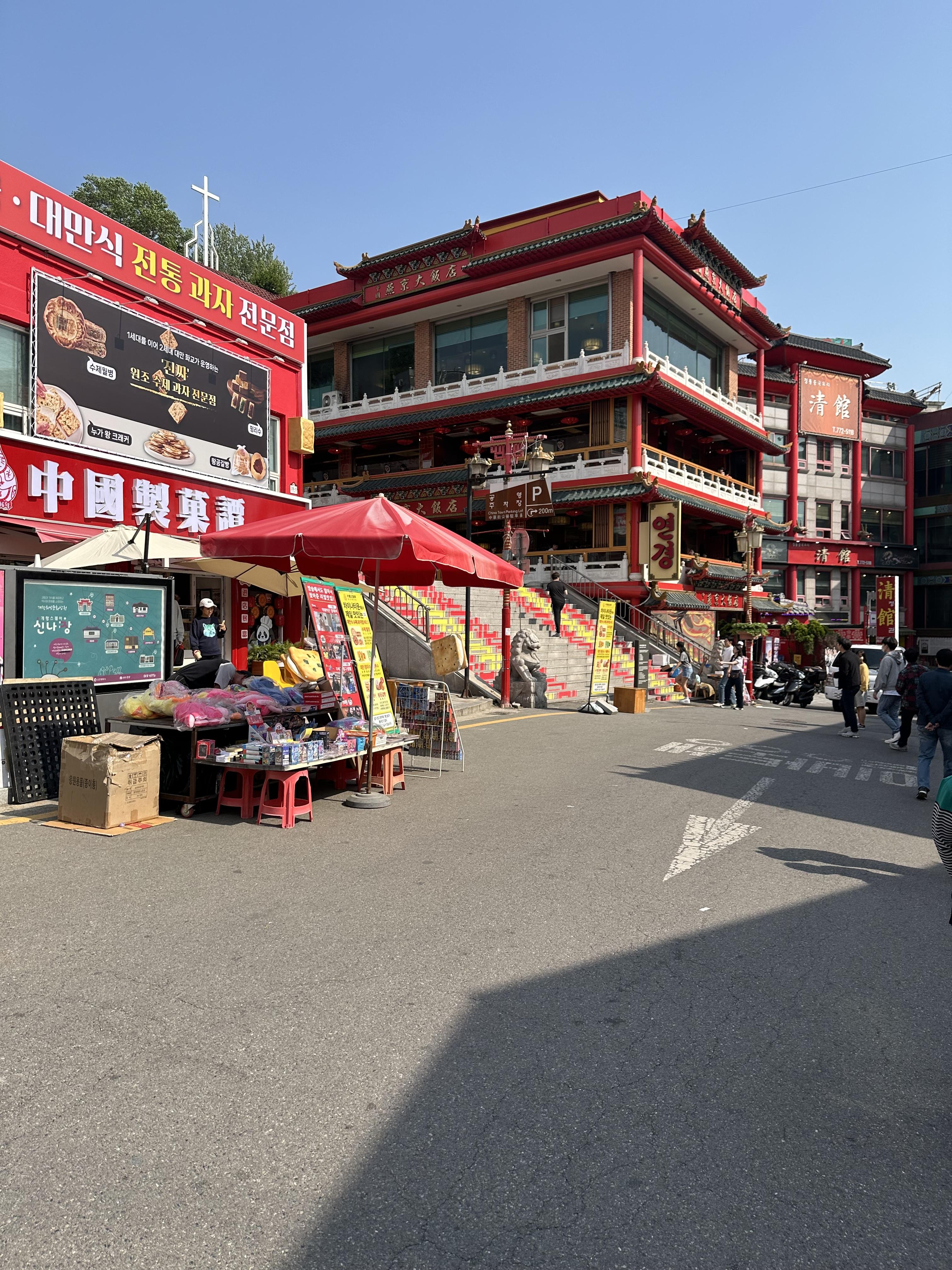 차이나타운 입구에서 제가 가려고 하는 연경 중국집 까지는 약간의 오르막길을 올라가야 합니다. 빠르게 간다면 5분도 채 걸리지 않을 것 같습니다. 차이나타운이라고 해서 중국 사람들 많을 것처럼 보이지만 그저 그냥 평범한 한국마을 같았습니다. 관광지라 그런지 중국거리라는 인식과 거리감은 많이 느껴지지 않았습니다. 차이나타운 입구에서 오르는데 눈이 보이는 것이 두가지 있습니다. 치아에 붙지 않는 탕후루와 차이나타운에 위치한 행정복지센터인데요. 차이나타운이라는 분위기를 함께 하기 위해 행정복지센터가 중국식 건물로 지어져있었습니다. 신기하였습니다.