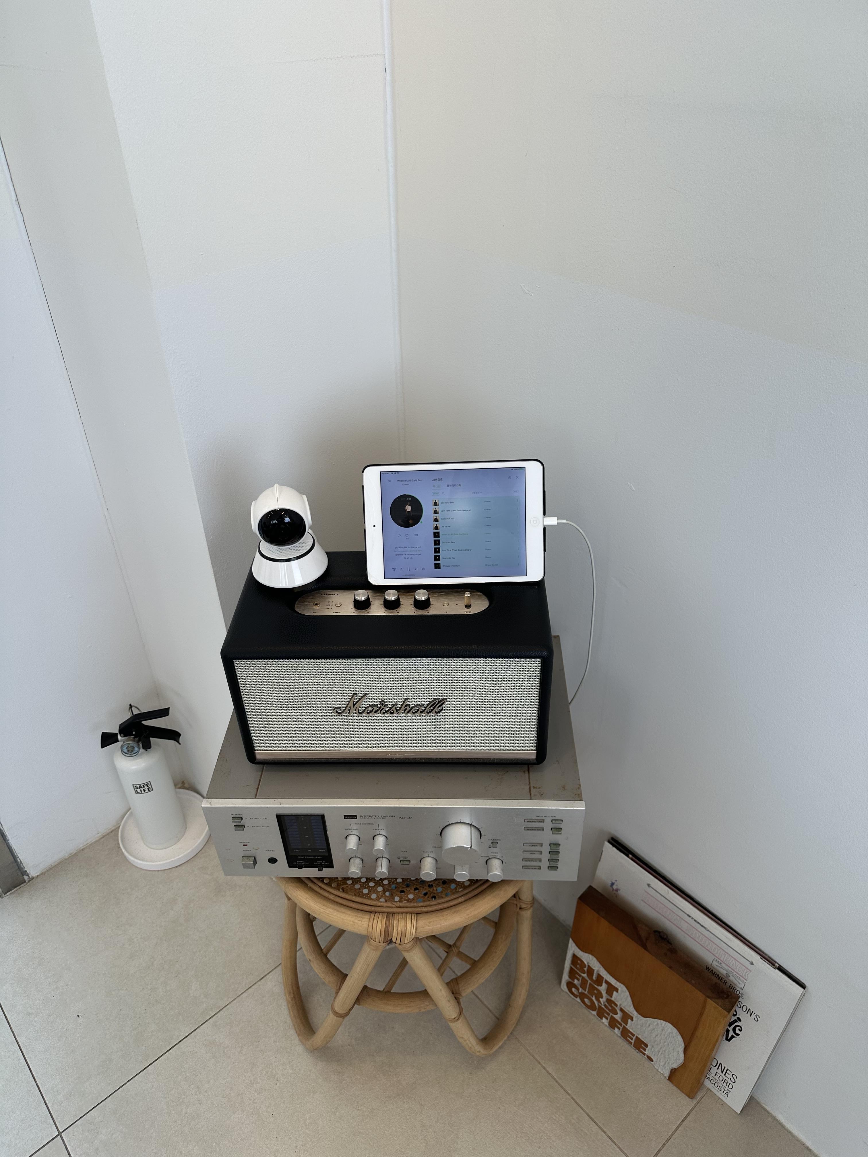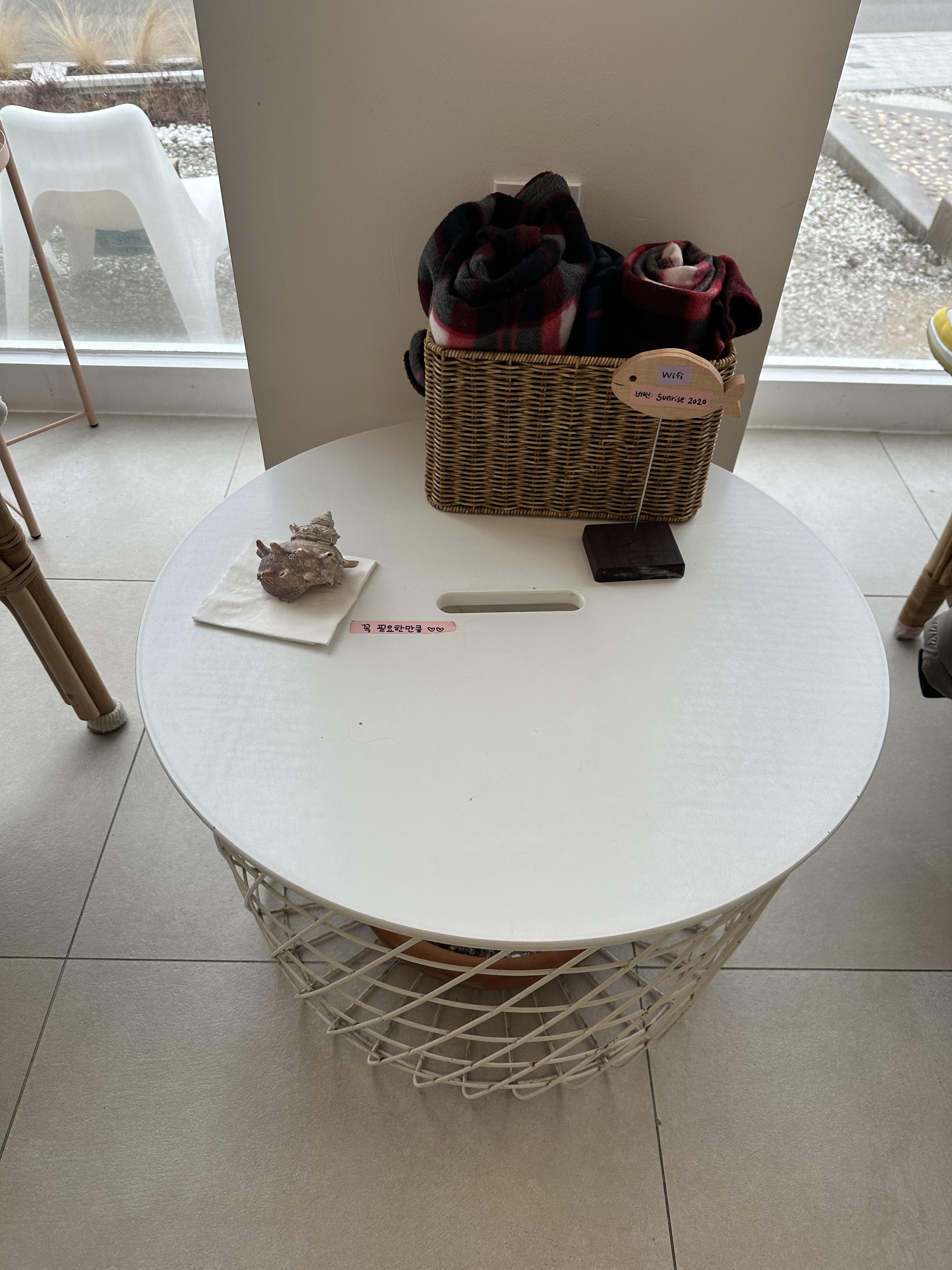 제가 앉앗던 창문 앞쪽에는 추운 손님들을 위해 무릎 담요가 준비가 되어있었습니다. 그리고 카페는 어느 다른 카페처럼 항상 음악이 무선 스피커를 통해 나오고 있었습니다. 음악은 아이패드와 블루투스 연동되어 자동재생되고 있었습니다. 스피커 옆에는 3명이서 앉아서 애기를 나눌 수 있는 탁자와 의자도 있었습니다.