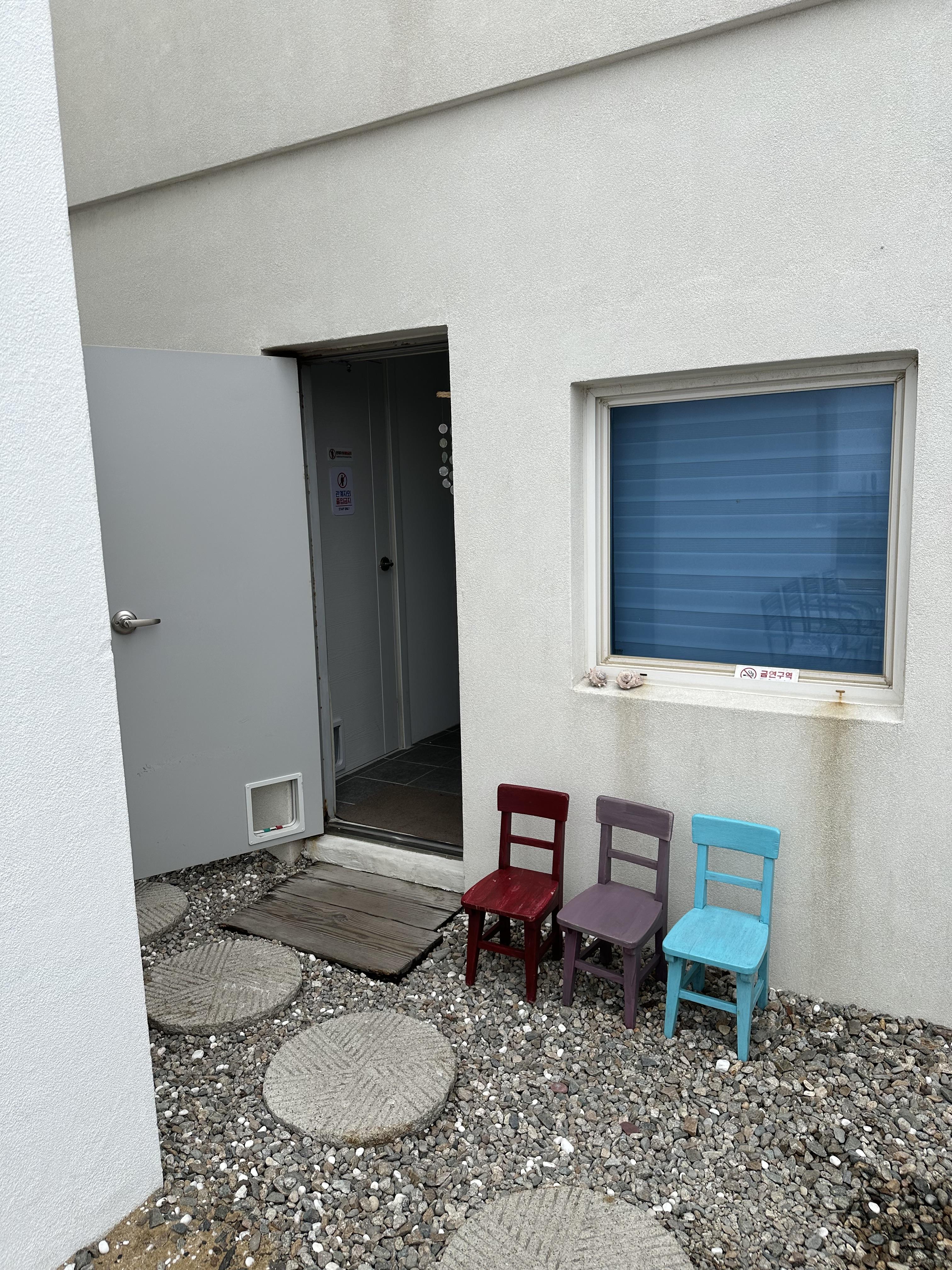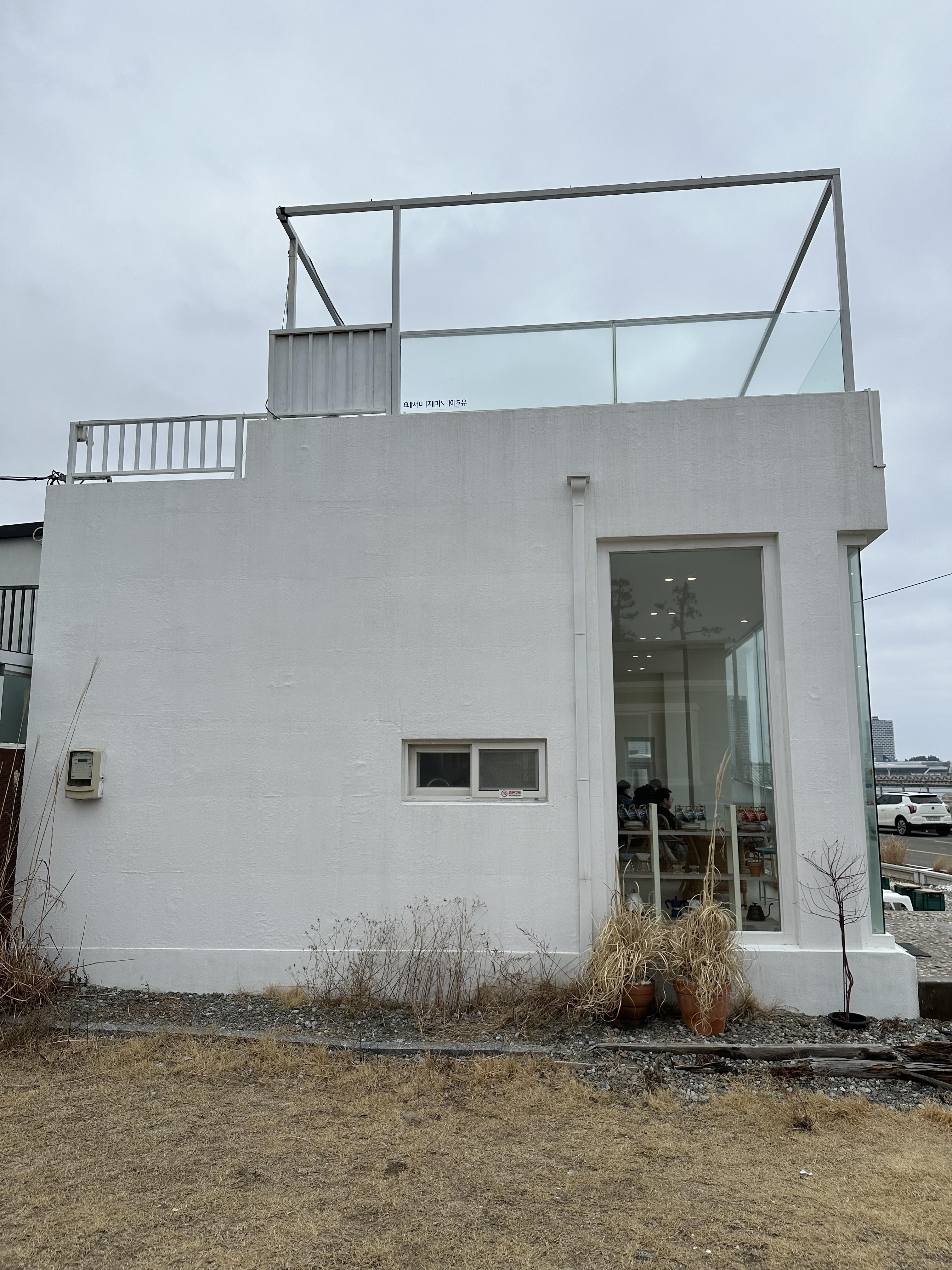 카페 프론트에 마시던 아이스 아메리카노 컵을 반납하고 저는 밖으로 나왔습니다. 작은 카페이지만 옥상에 테라스가 있고 야외에도 바다와 주변을 보며 즐길 수 있는 공간이 있었습니다. 작은 카페라서 단체 손님이 가능할까 생각했는데요. 야외도 있고 옥상도 있어서 충분히 가능 할 것 같습니다. 카페 입구 쪽에는 간이 의자 앞에는 작은 테이블이 있어서 커피 잔을 놓을 수 있었습니다.