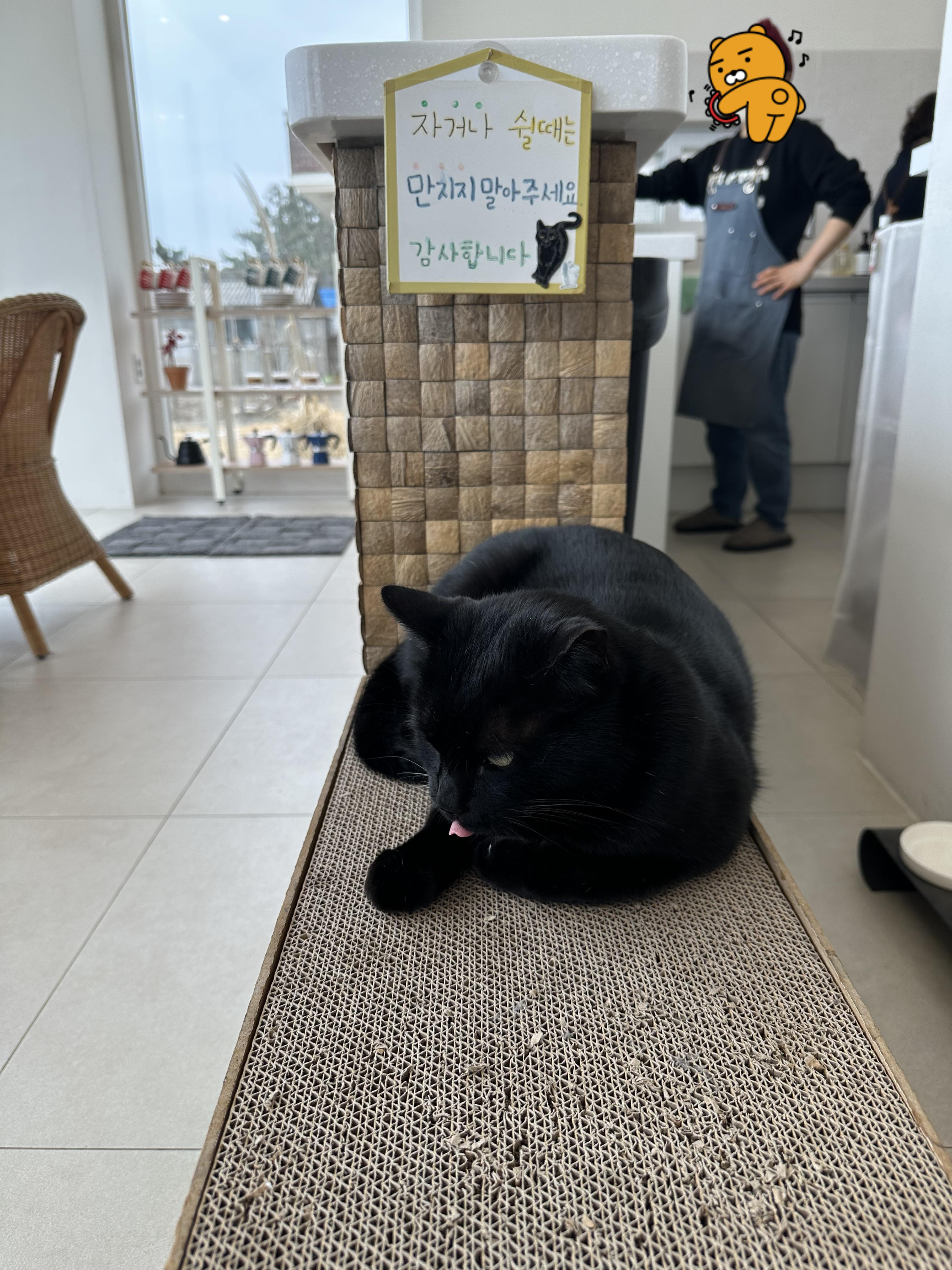 검은 고양이 그런지 자세히 안보면 잠을 잠자고 있는거 같은데 눈을 보니 깨어나있었습니다.자거나 쉴때는 만지지말라고 적혀있네요. 반려묘나 반려견은 귀엽기 때문에 남녀노소 만지게 되는데요. 반려묘와 반려견 모두 생명체이고 그들 모두 인간처럼 쉬고 싶을때 있는데 만지면 귀찮겠죠. 동물도 성격이 있기 때문에 쉬는데 건드리면 공격 할 수 있으니 굳이 만지고 싶더라도 멀리서 보는것도 그들을 존중해주는 것 같습니다.