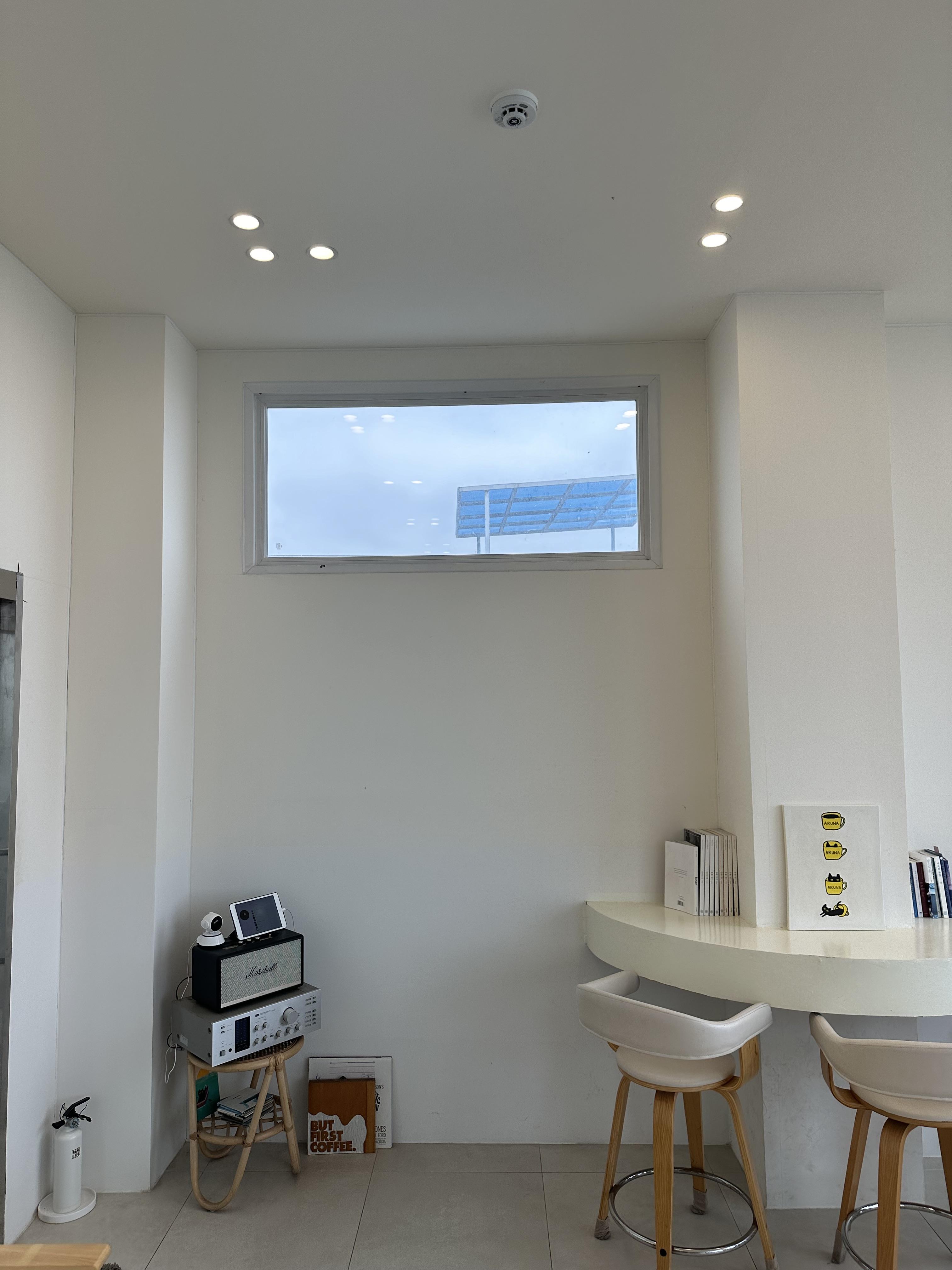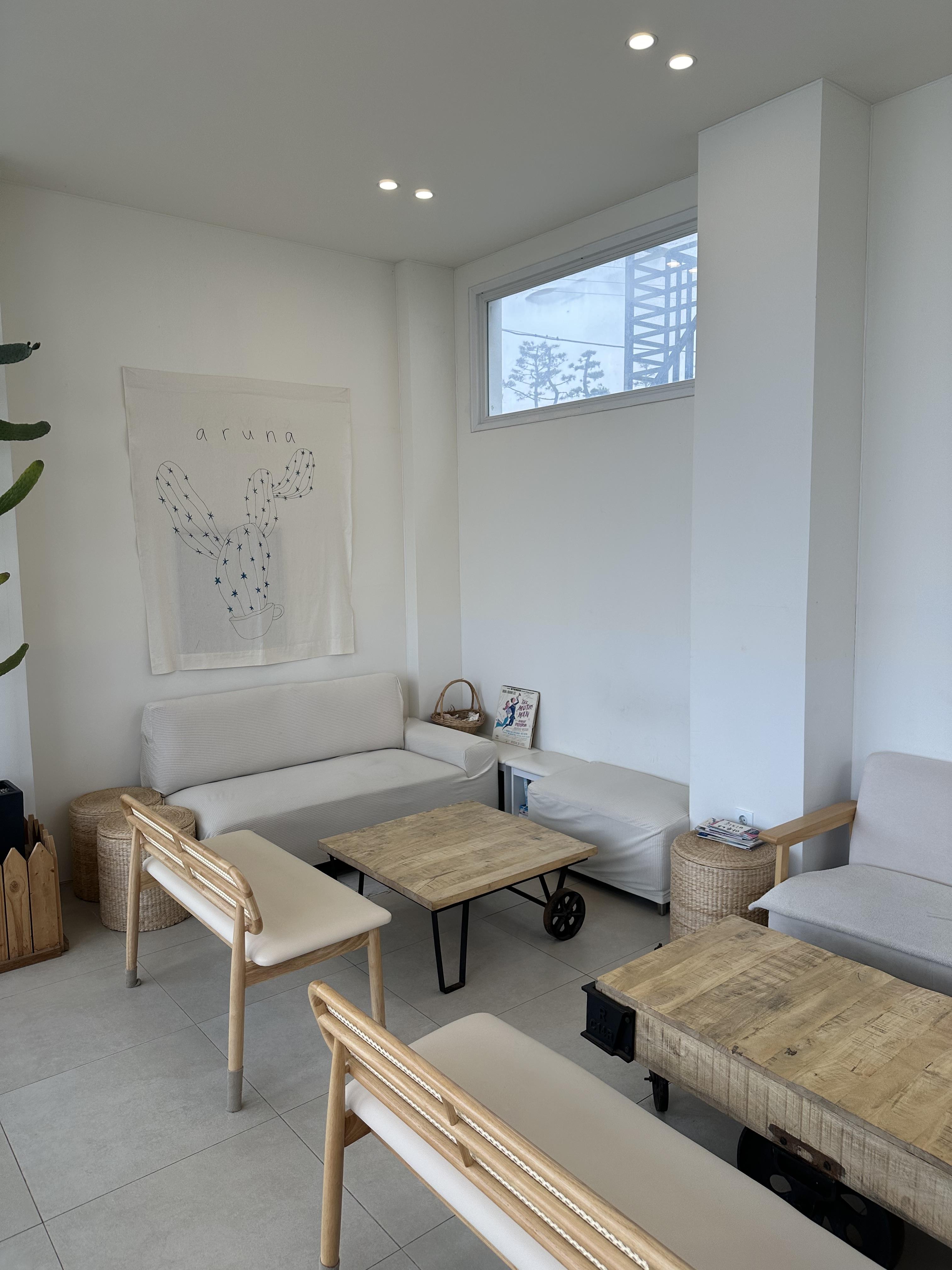 속초 바다가 보이는 앞쪽에는 2명 씩 앉을 수 있는 반면에 뒤쪽에는 여러명이 앉을 수 있는 긴 쇼파가 있었습니다. 그리고 여러명이 앉아서 대화 할 수 있도록 중간에 탁자(테이블)과 함께 마주보도록 되어있었습니다. 카페 아루나 소개하면서 단체 손님도 받을 수 있다고 했었는데요. 아마도 뒤에 쇼파를 통해서 4-6인정도는 앉을 수 있고 넉넉 할 경우는 그 이상도 받을 수 있을 것 같았습니다.