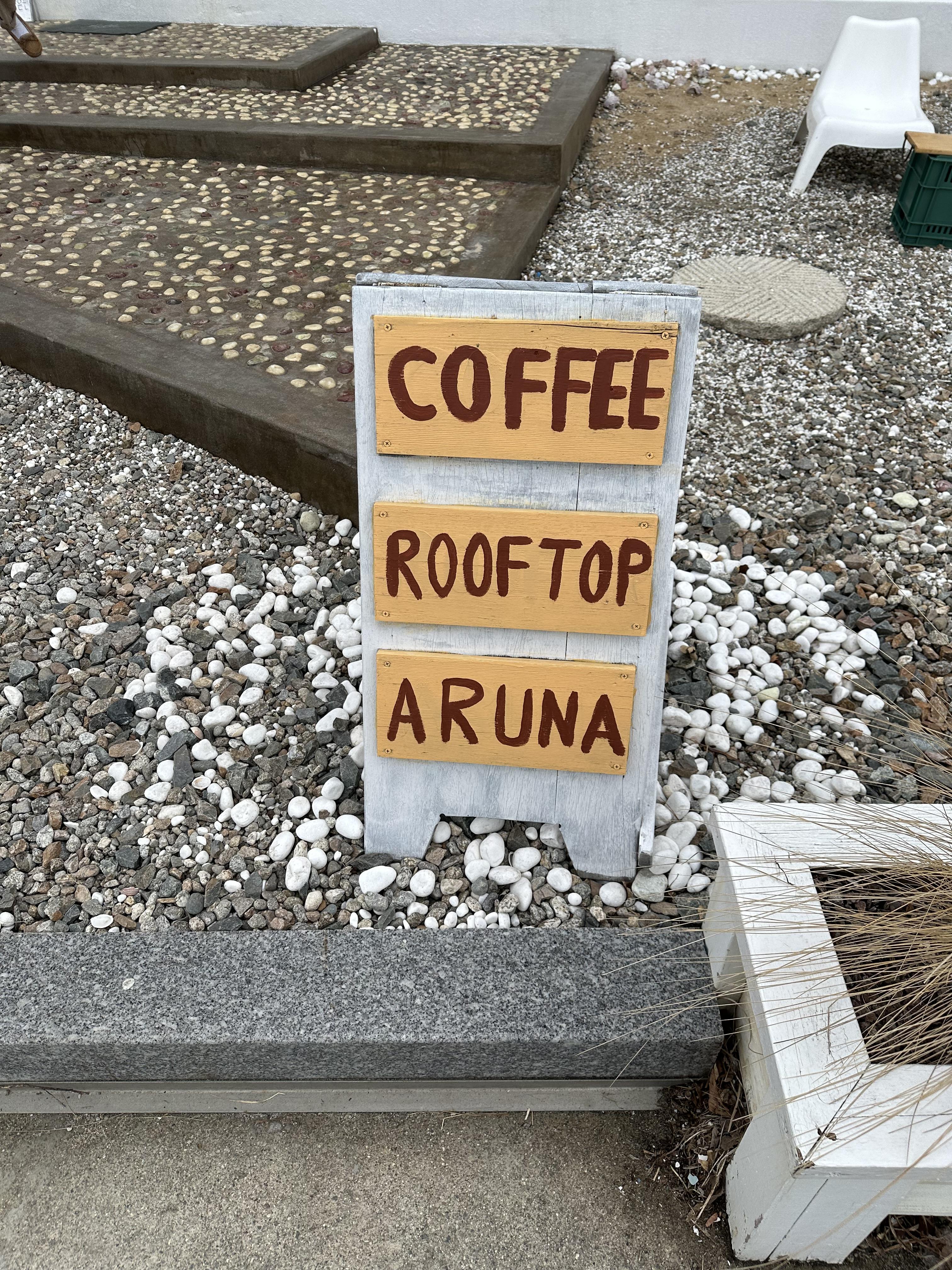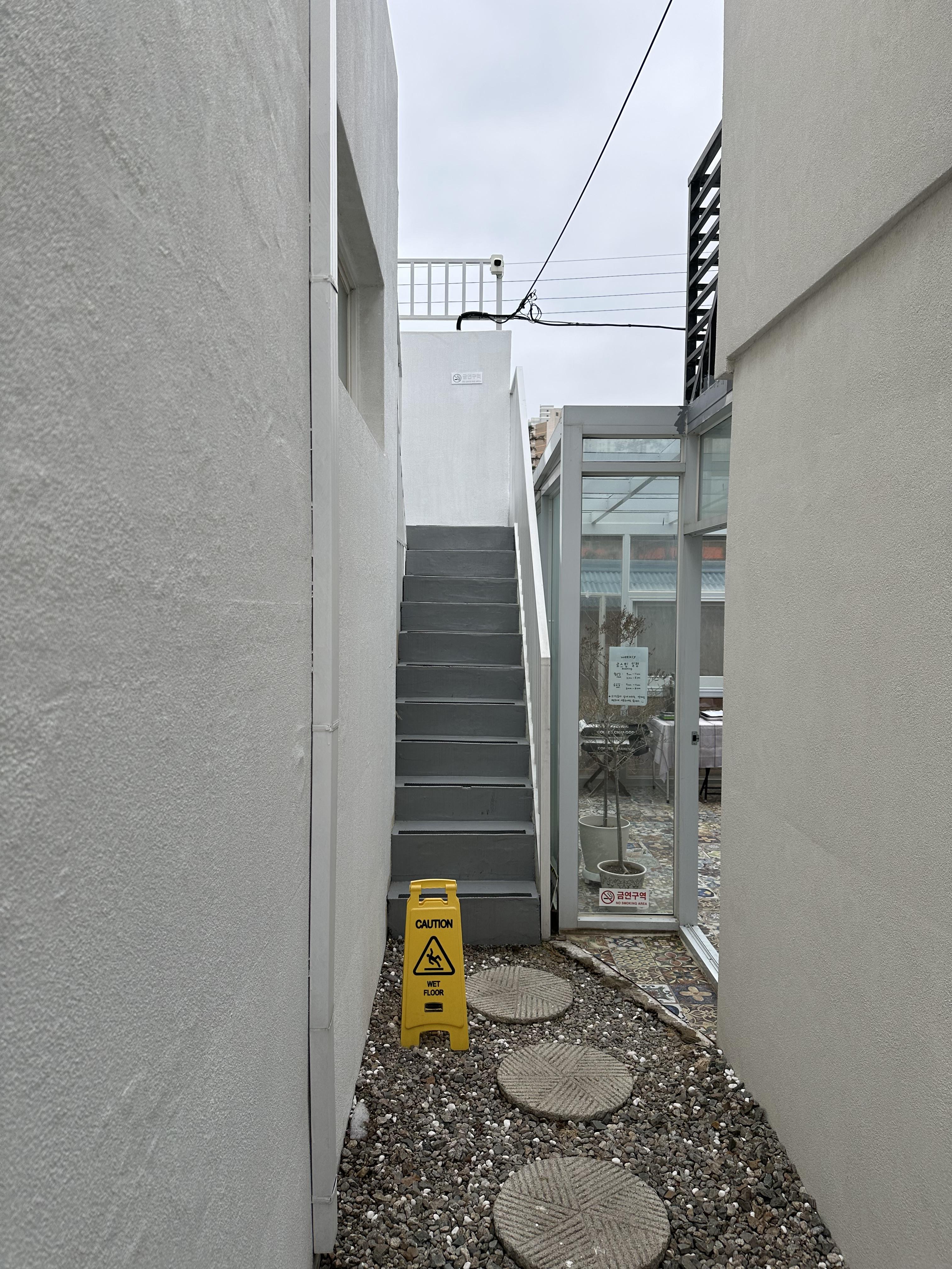 카페 뒤에도 출입문이 있어서 출입문 뒤쪽을 이용하면 건너편 건물에 화장실이 있었습니다. 보통 다른 건물과 함께 쓰는 카페의 경우 화장실이 공용이다보니 건물에 따라서는 화장실이 지저분해서 이용하기 쉬운데요. 개인적으로 카페를 찾아갈때 자체적으로 화장실이 있다면 그 카페를 이용하고는 합니다. 화장실이 본래 깨끗한 곳은 아니지만 그만큼 인간이 살아가면서 반드시 있어야 하는 공간이기 때문에 청결 또한 중요하다고 보여집니다. 화장실 가는길에는 작은 간이 의자와 함께 야외에서도 커피를 즐길 수 있는 공간이 있었습니다. 옥상도 있어서 날씨가 따뜻할 때는 카페 뒤편 계단을 이용해서 옥상 테라스 이용하는 것도 좋을 것 같습니다. 다만 보통 카페 옥사의 경우 비가 오거나 눈이 오면 계단이나 바닥이 미끄러울 수 있으니 조심스럽게 올라가시길 바랍니다. 카페 아루나도 계단 앞에 조심해달라는 표시판이 있었습니다.