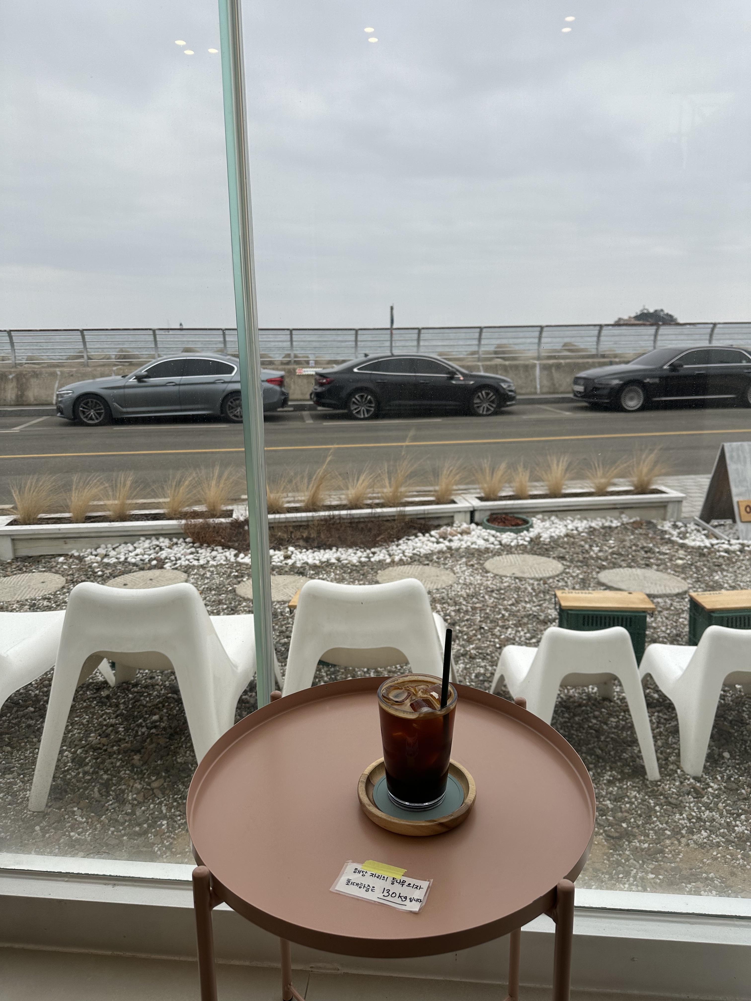 바다가 보이는 창문쪽에는 2명이서 앉을 수 있는 의자와 작은 원형 탁자 1개가 배치되어있었습니다. 주문 했던 아이스 아메리카노가 나왔습니다. 작은 원형 탁자이다보니 카페와 디저트 몇개 정도 놓으면 공간은 없을 것 같았습니다. 아무튼 이렇게 바다를 가까이에서 볼 수 있는 카페가 얼마 있을까 궁금하긴 합니다. 제주도 공천포에 갔을 때 카페숑이라는 카페를 제외하면 사실 바다 바로 앞에 카페는 많이 없었습니다.