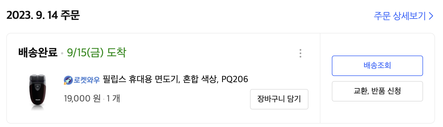 기존에 사용 하던 것이 있었는데요. 그럼에도 불구하고 구매했던 이유는 제가 여행을 자주 다니고 있습니다. 한달에 한번정도는 여행을 다니는데 무거운것보다는 가벼운 면도기 겸 이번에 독립해서 살게되면서 비싼것보다는 가성비 면도기를 사용해보기로 해서 결정했습니다. 로켓배송이라서 9월 14일 주문해서 다음날 바로 받을 수 있었습니다.