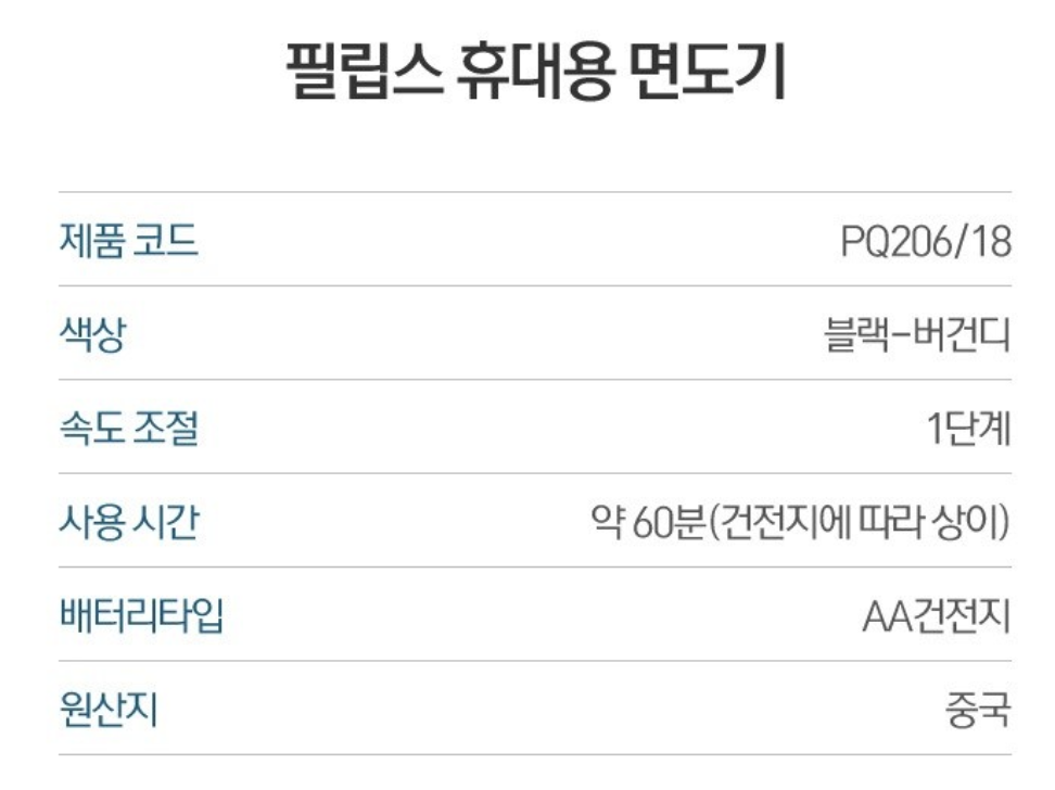 필립스 휴대용 면도기 제품 스펙 정보 요약