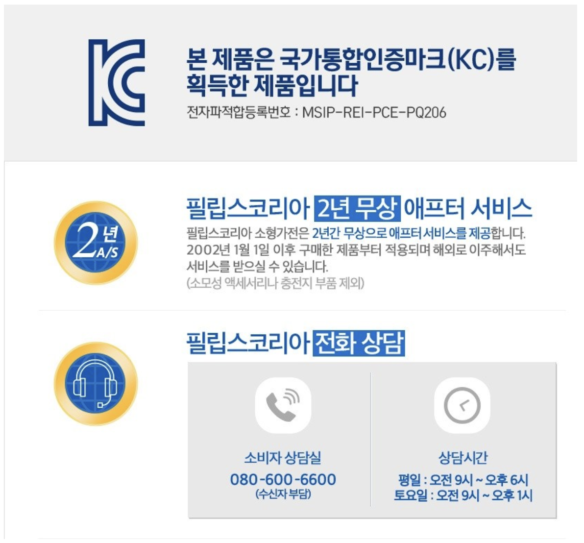 - 필립스 코리아 소형 가전 제품은 2년 무상 에프터 서비스를 제공 한다고 해요