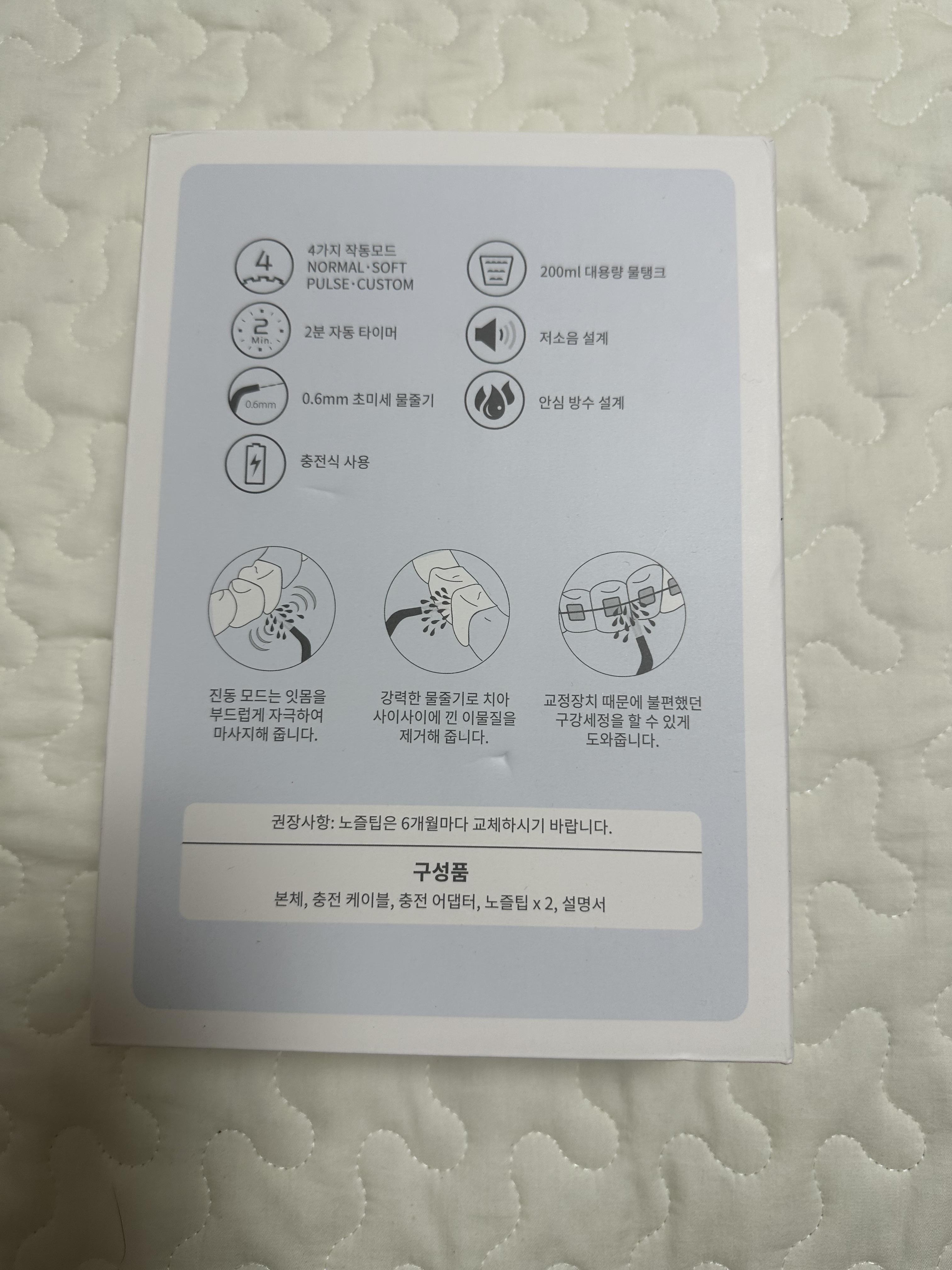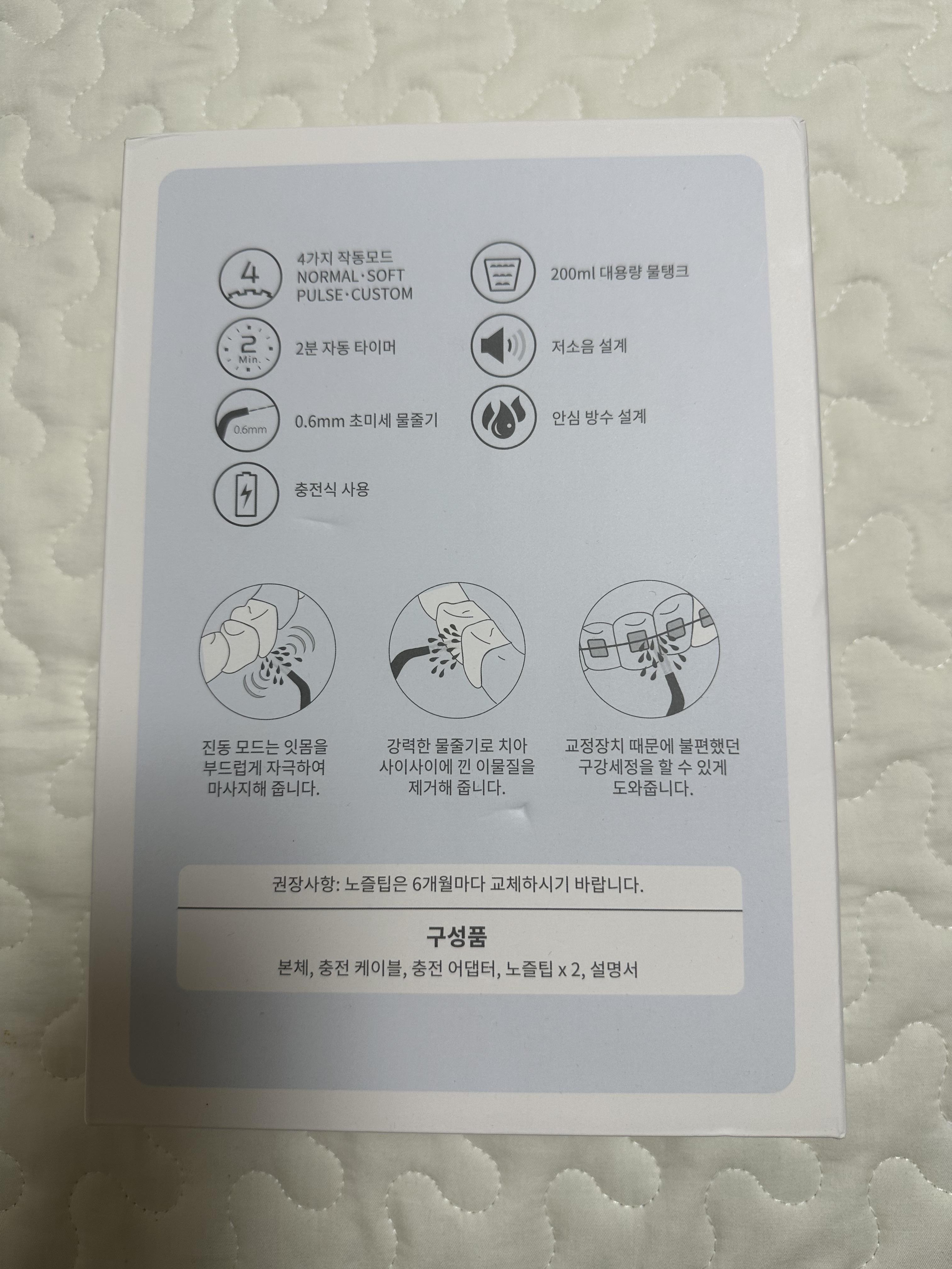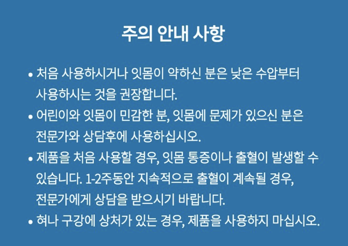 - 제품을 처음 사용할 경우, 잇몸 통증이나 출혈이 발생할 수 있습니다. 1-2주간 지속적으로 출혈이 계속 될 경우 전문간에게 상담 받으시길 바랍니다. (저도 구매 후 처음 사용 시에는 피가 나오긴 했으나 단계 조정해서 약하게 하다보니 괜찮았습니다.)