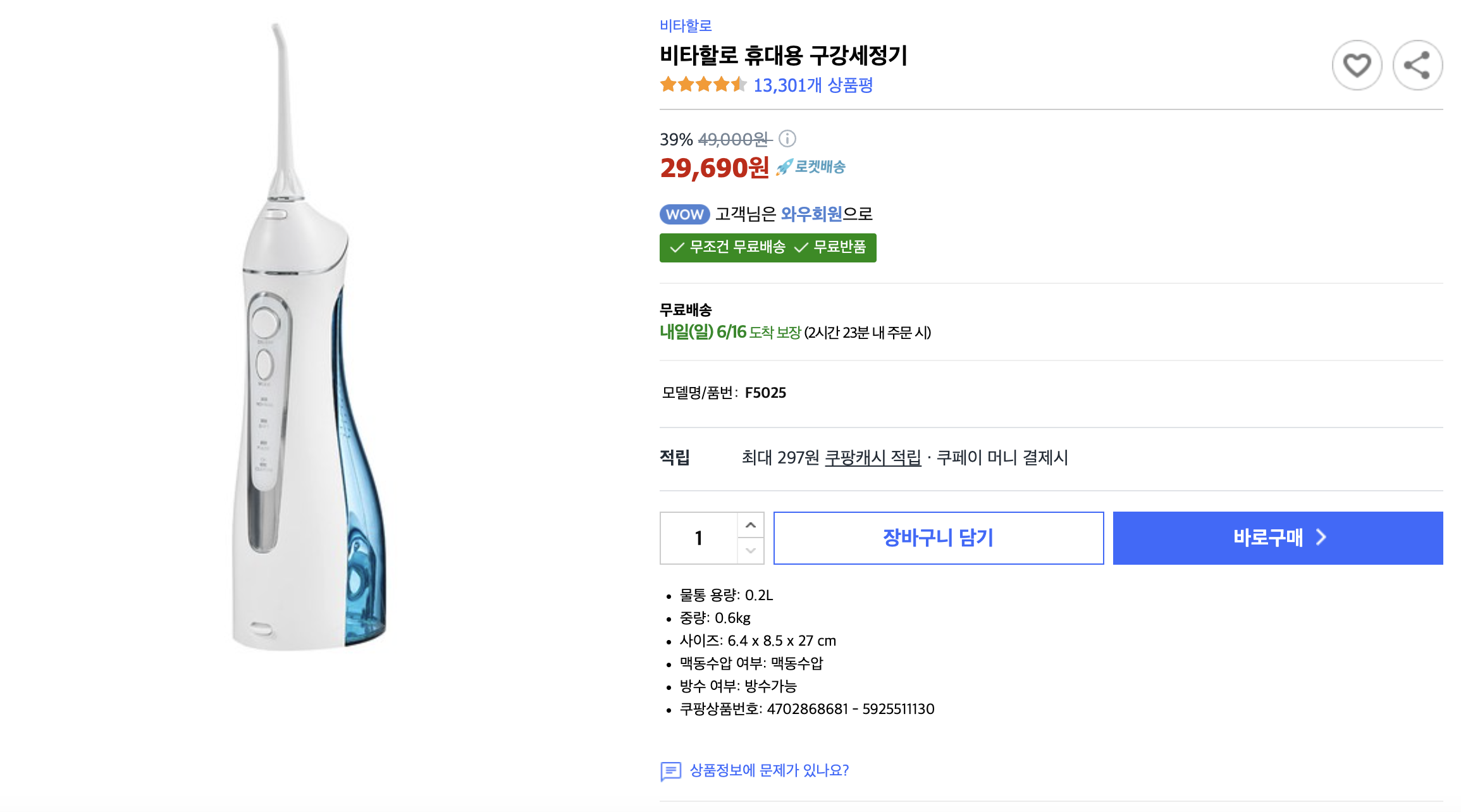 이번에 구매하는 치아 세정기도 지난번과 동일하게 휴대용으로 가능하다는점이었습니다. 원래 가격은 49,000원에 판매되고 있는데 제가 작년 9월에 구매했던 가격과 현재 판매되고 있는 가격은 동일한 수준으로 판매 되고 있었습니다. 현재도 쿠팡에서 39% 할인되어 29,690원으로 3만원이 되지 않는 가격에 판매되고 있습니다. 저는 당시 26,840원에 주문했습니다. 바로 전에 구매했던 오아 클린이워터B 휴대용 구강 세정기에 비해 1만원정도 더 저렴했습니다. 다만 치아세정기를 구매하려고 후기를 보는데 물을 담아서 물을 치아 사이에 쏘는 방식이다보니 사람에 따라 쓰는 방식에 따라 물을 여러번 받아서 쓴는 분들도 있었습니다. 만약 자신의 패턴에 의해서 치아세정기로 오랫동안 하실분이라면 물통 큰것을 구매 하시면 좋을 거 같습니다. 저는 오아 클린이워터B나 비타할로 휴대용 구강세정기나 큰 불편없이 사용되었습니다.