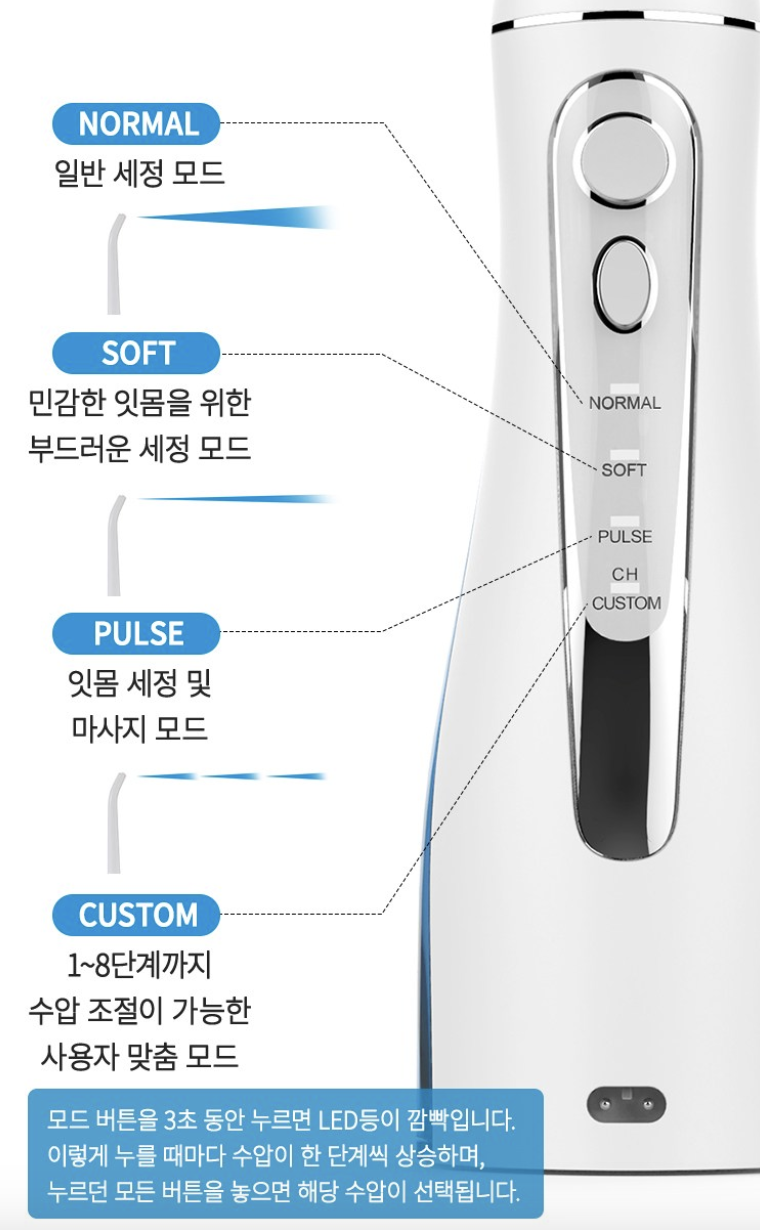 - SOFT가 가장 부드럽고 좀 적응이 되면 NOMAL이나 PULSE, CUSTOM 사용을 하는게 좋은 것 같아요. 저는 적응하고나서는 NOMAL로 사용하고 있어요. 처음부터 쎈거 하면 잇몸 피나요. 적응이 되었어도 잇몸이 아프거나 피곤할 때는 단계를 너무 세게는 안하시는 것을 권장합니다.
