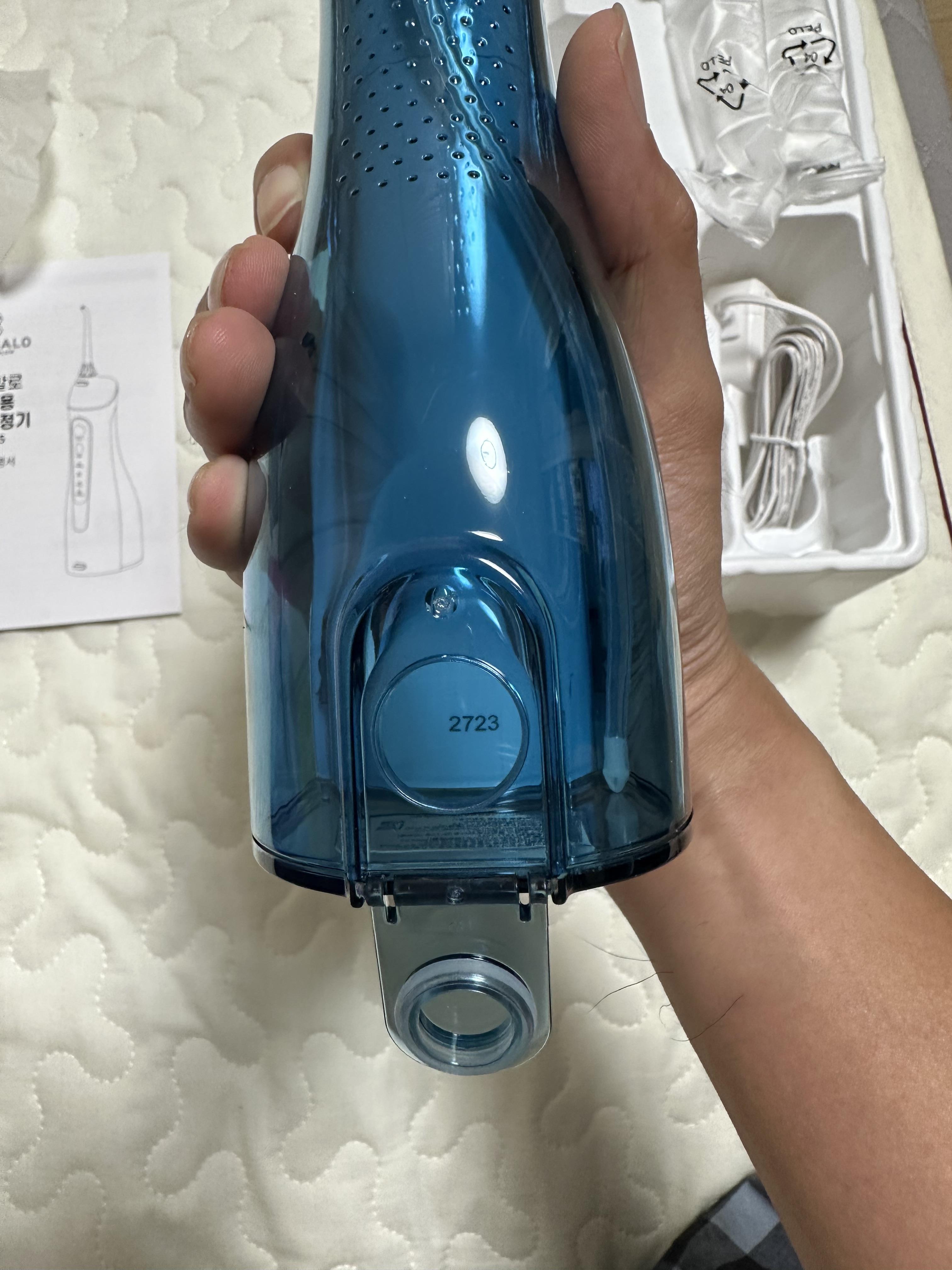 박스에서 제품을 개봉했습니다. 박스에서 제품을 분리하니까 플라스틱 통에 구강 세정기와 충전기, 노즐팁 2개, 어탭터, 설명서가 들어있는 것을 볼 수 있었습니다. 구강세정기는 본체와 물탱크가 분리되지 않고 장착되어있었습니다. 구강 세정기 뒤에 물탱크쪽에 물을 넣을 수 있는 구멍이 있고 뚜껑을 열면 물을 넣을 수 있습니다.