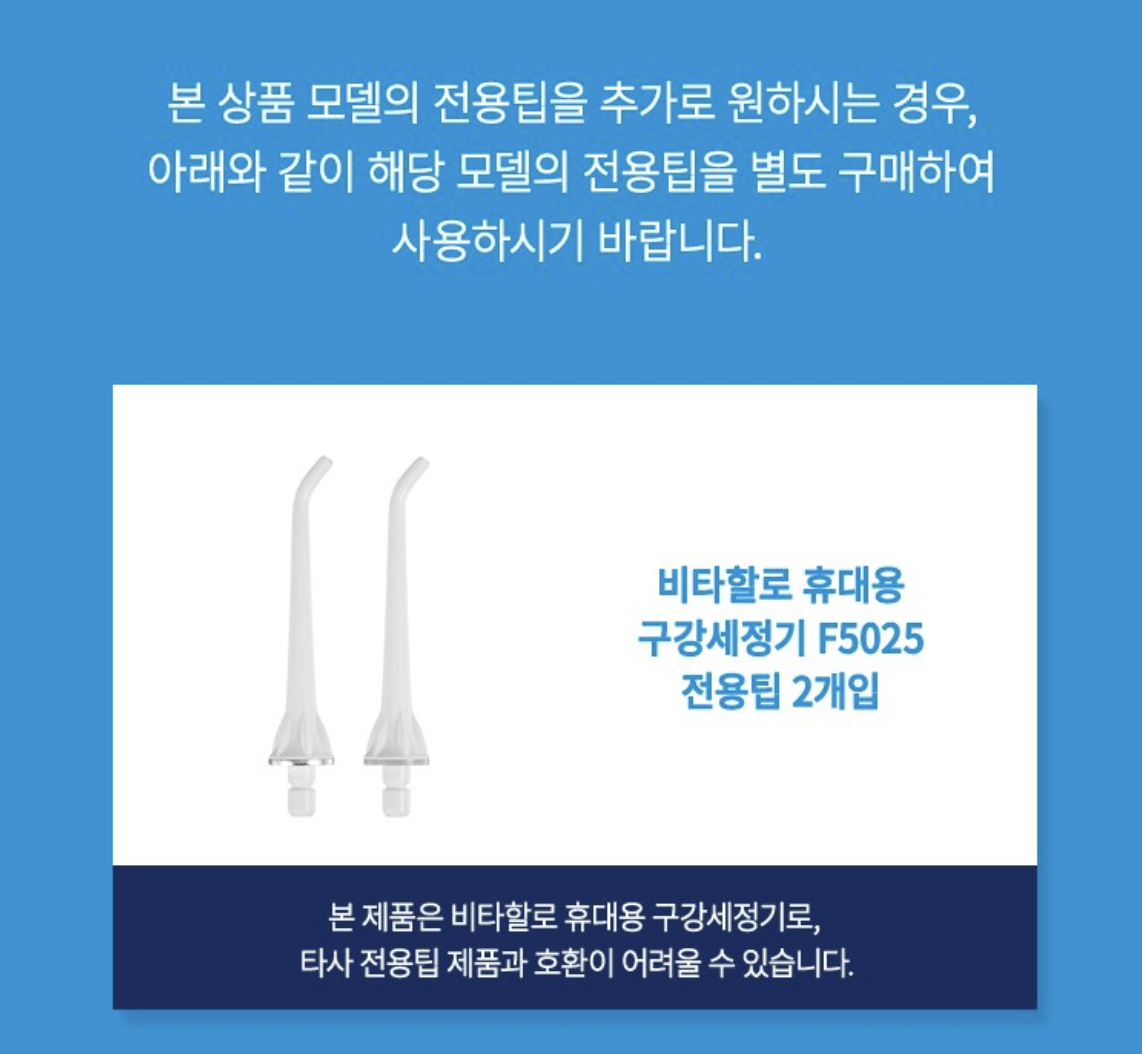 비타할로 휴대용 구강 세정기에서도 오아 클린이워터B처럼 기본적으로 구강세정기 F5025 전용팁 2개를 제공 하고 있습니다. 구강 세정기 팁은 3개월정도 사용 후에는 교체해주어야 하구요. 기본적으로 제공하는 팁을 다 사용시에는 쿠팡에서도 추가 구매 가능하니까 교체해서 사용하시면 됩니다. 다만 비타할로 휴대용 구강 세정기는 오아 클린이워터B처럼 다양한 종류의 팁은 판매되고 있지 않아 좀 더 정밀하게 꼼꼼하게 하고 싶다면 제 블로그 오아 클린이워터B 구강 치아 세정기 참고 부탁드립니다. 전용 팁은 제품마다 다르기 때문에 비타할로 구강세정기 구강팁은 전용팁으로만 하셔야 합니다. 타사 전용팁 제품과 호환이 어려울 수 있다고 합니다.