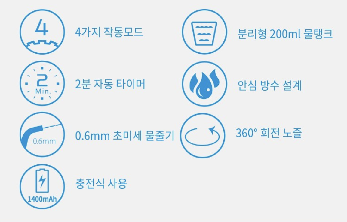 - 강력한 물줄기로 치아 사이사이에 낀 이물질을 제거해줍니다.