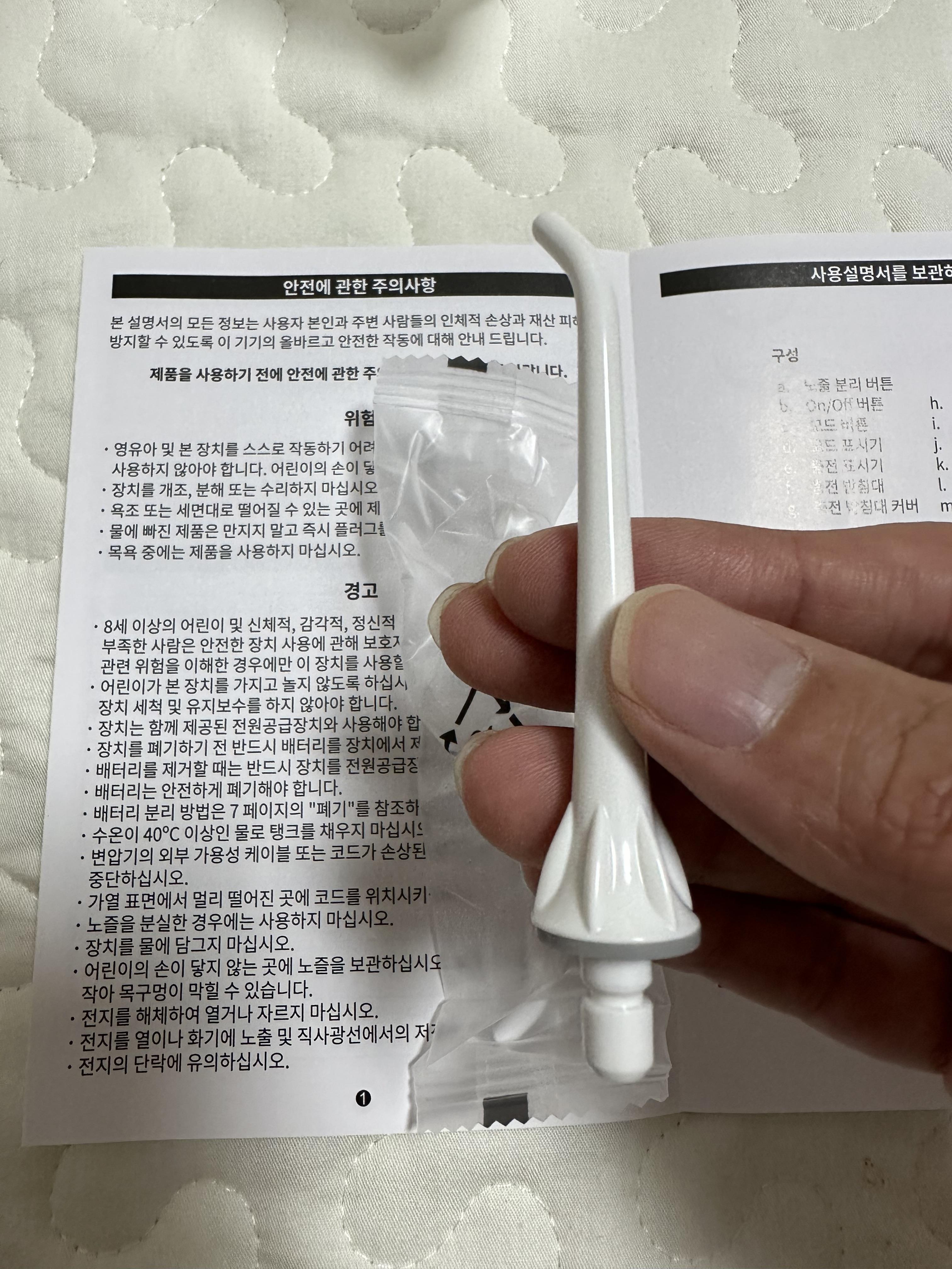 구성품으로는 설명서와 충전 어댑터와 노즐팁 2개가 있습니다. 노즐팁은 최소 6개월 단위로 교체하는 것을 권장한다고 합니다. 기본적으로 2개가 제공하고 있으며, 추가적인 노즐팁 구매는 쿠팡에 비타할로 구강세정기 팁이라고 검색을 통해 구매 할 수 있습니다. 반드시 비타할로 팁을 사용해야하고 다른 제품꺼 구매 시 호환이 되거나 기계 망가짐이 발생 할 수 있습니다. 제품 사용 설명서도 있지만 사용설명서는 가볍게 보더라도 사용하는데는 큰 어려움은 없어 보입니다.