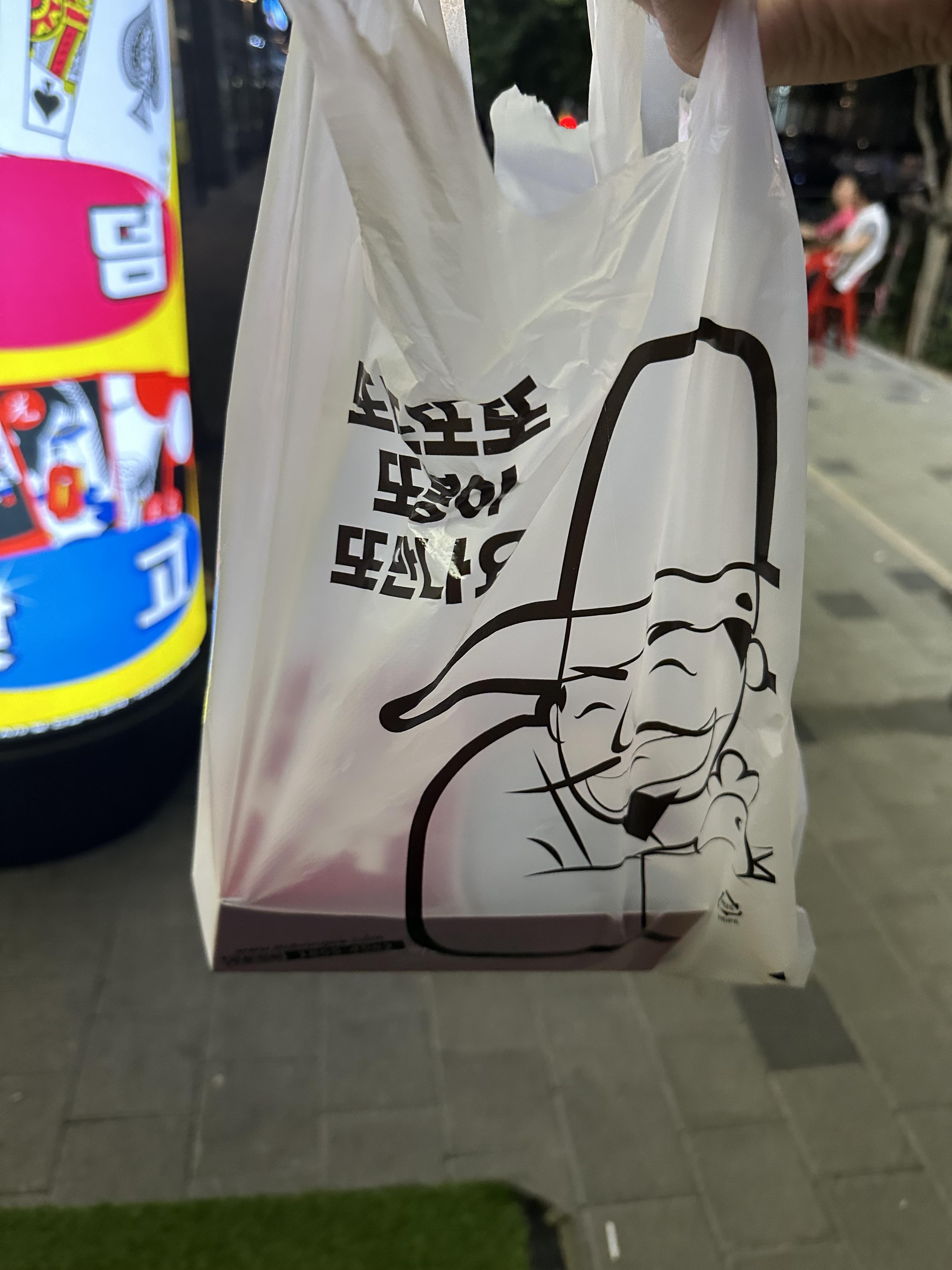 예정된 픽업시간에 맞춰서 이동 했지만 사장님과 종업원들이 바쁜지 예정된 픽업시간보다 10분정도 늦어서 제품을 수령했습니다. 기다리면서 블로그에 포스팅 하기 위해 또봉이 통닭 가게 사진도 찍고 영상도 찍다보니까 주문했던 똥집 볶음이 나왔습니다. 또봉이 통닭 비닐봉지에 그림이 참 재미있게 생겼습니다.