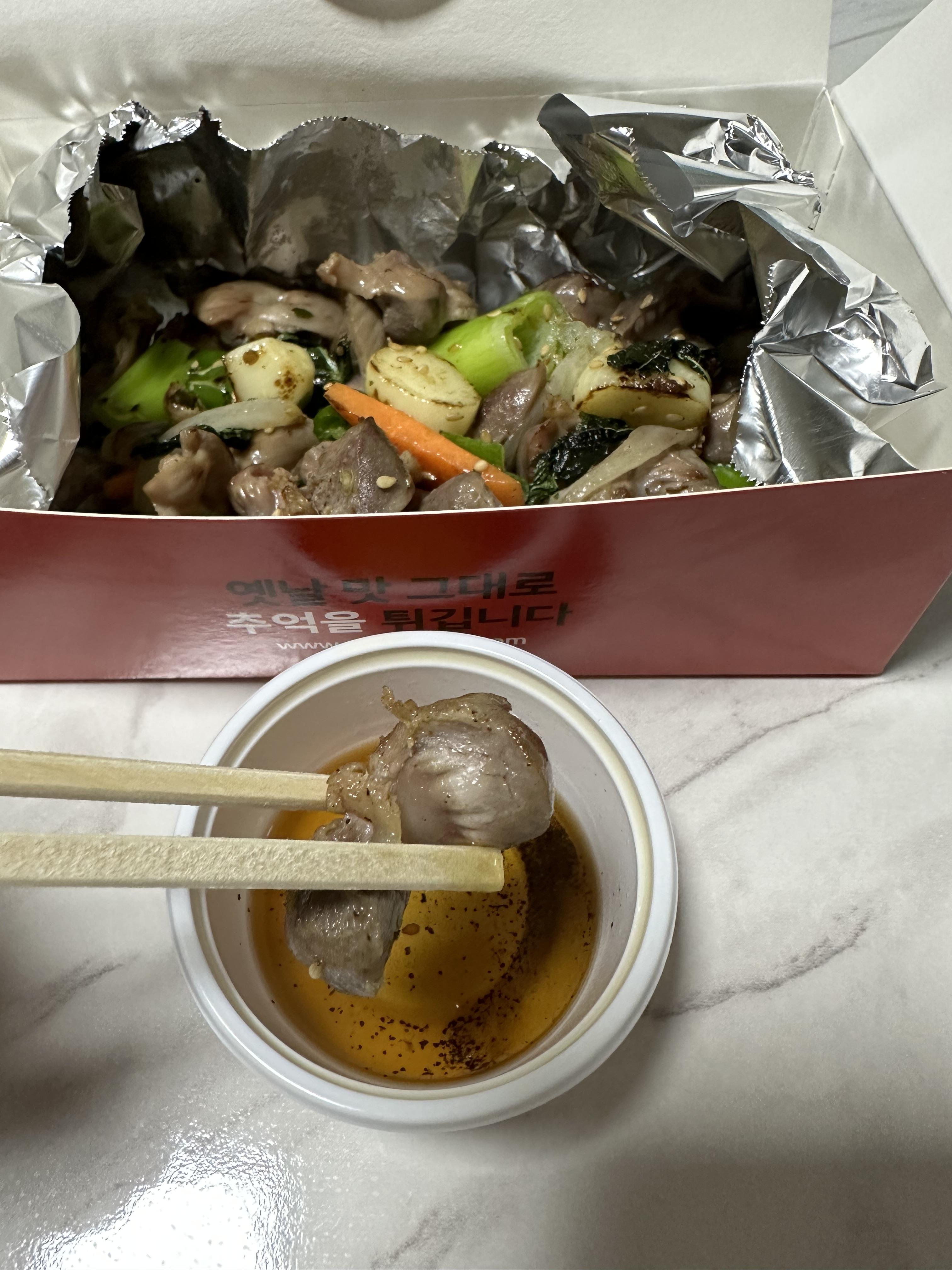 또봉이 통닭에서 주문해서 사온 똥집 볶음과 젓가락 그리고 양념장이 함께 들어있었는데요. 양념장에 찍어먹어도 맛있었습니다. 양념장 아니더라도 똥집 볶음에 들어간 매운 고추와 마늘과 함께 먹어도 정말 맛있었습니다.