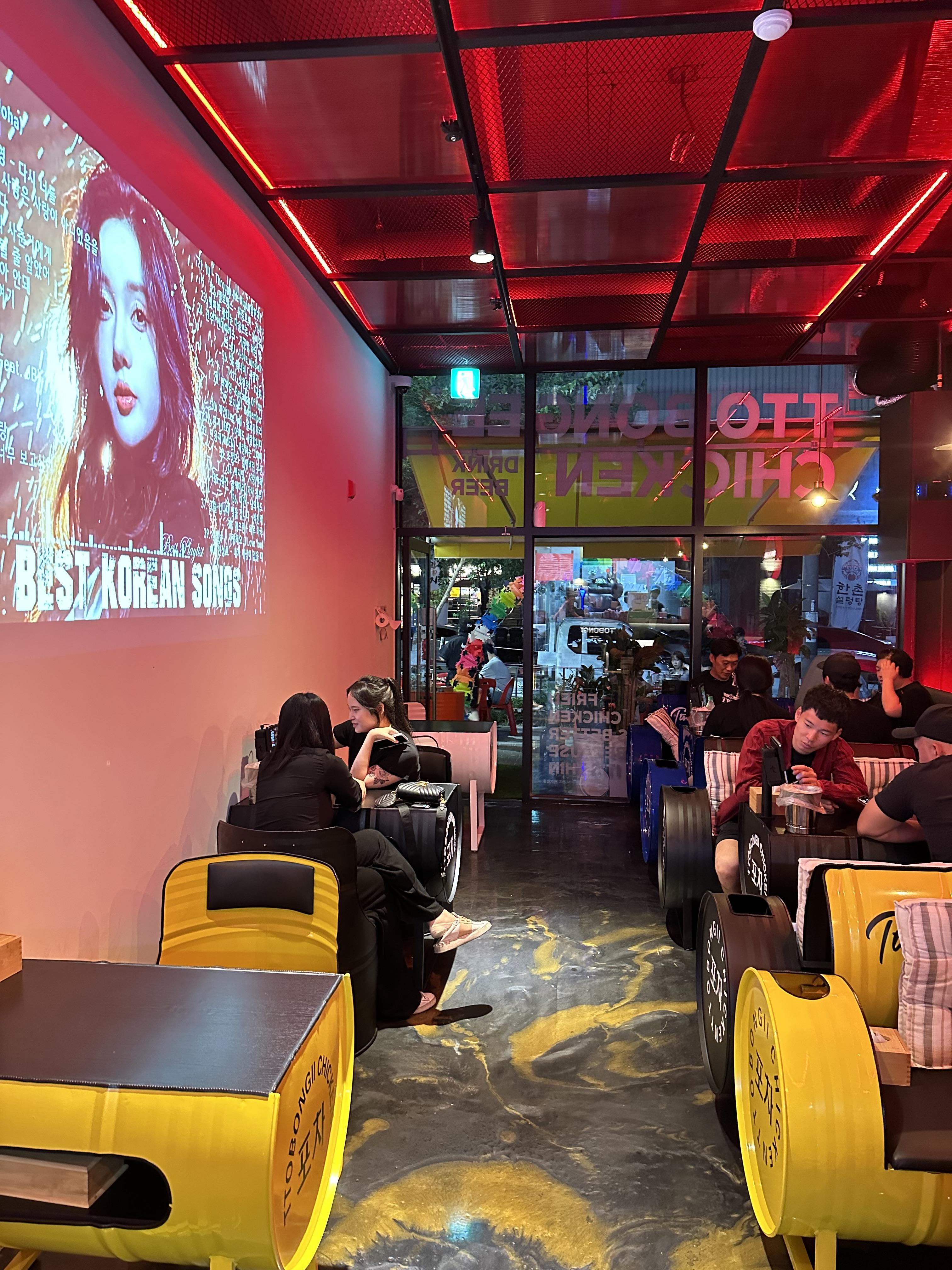 내부는 엄청 넓지는 않지만 복고풍 느낌이 나는 클럽 분위기라고 할까요. 내부에는 드럼통 모양의 테이블이 있었는데 인상적이었습니다. 야외였다면 드럼통 이용해서 숯불 바베큐도 해먹을 수 있는 그런 분위기도 났습니다. 빔프로젝트를 이용해서 벽에는 영상이 나오고 있었습니다. 나중에 지인과 함께 반달섬에서 술을 마시게 된다면 또봉이통닭 드럼통 앞에서 치킨 한마리 먹고 싶은 생각이 들었습니다.