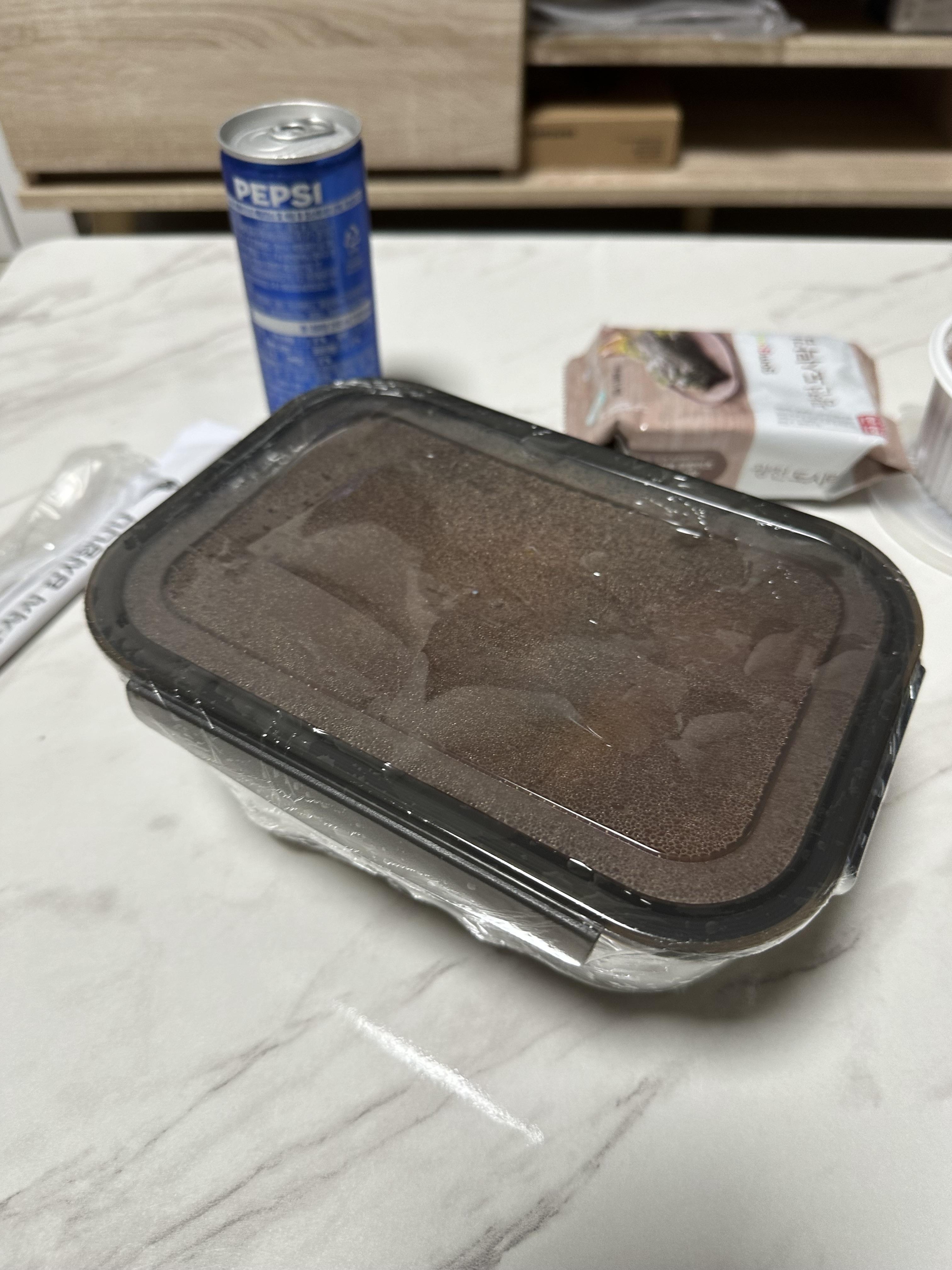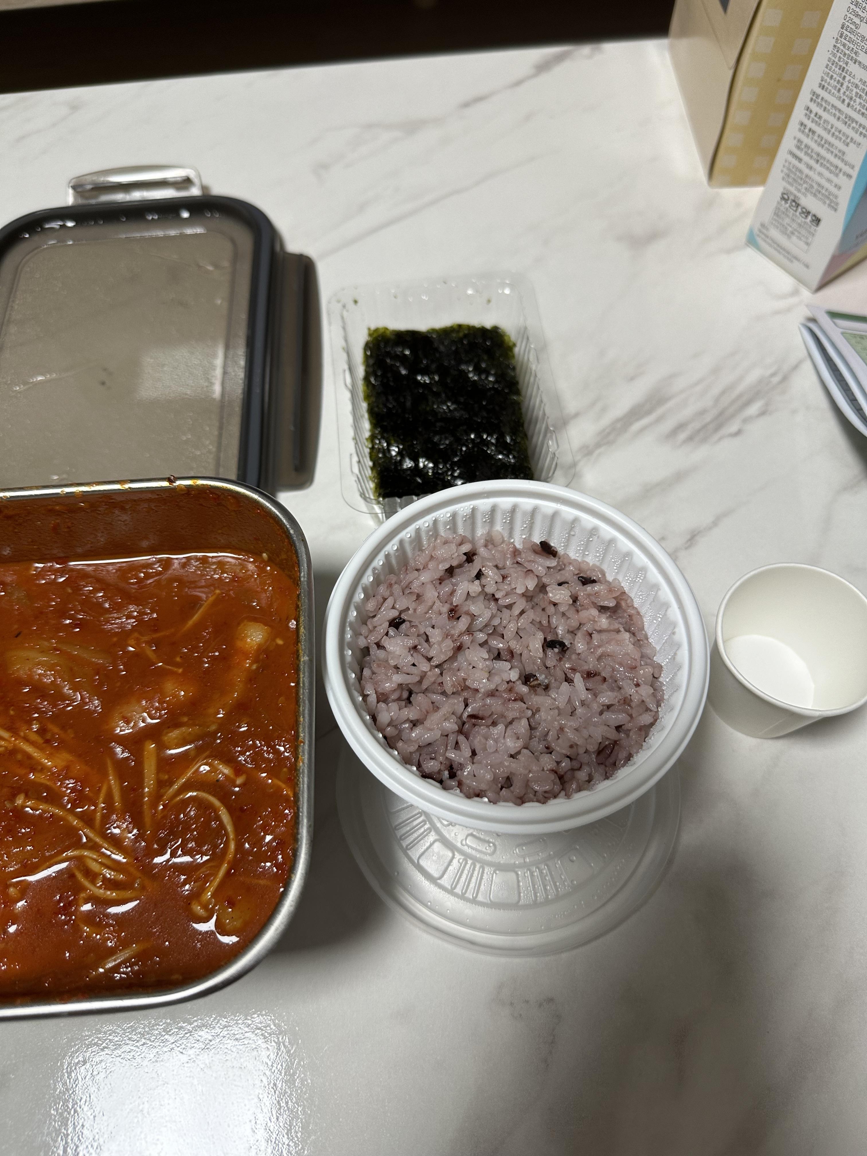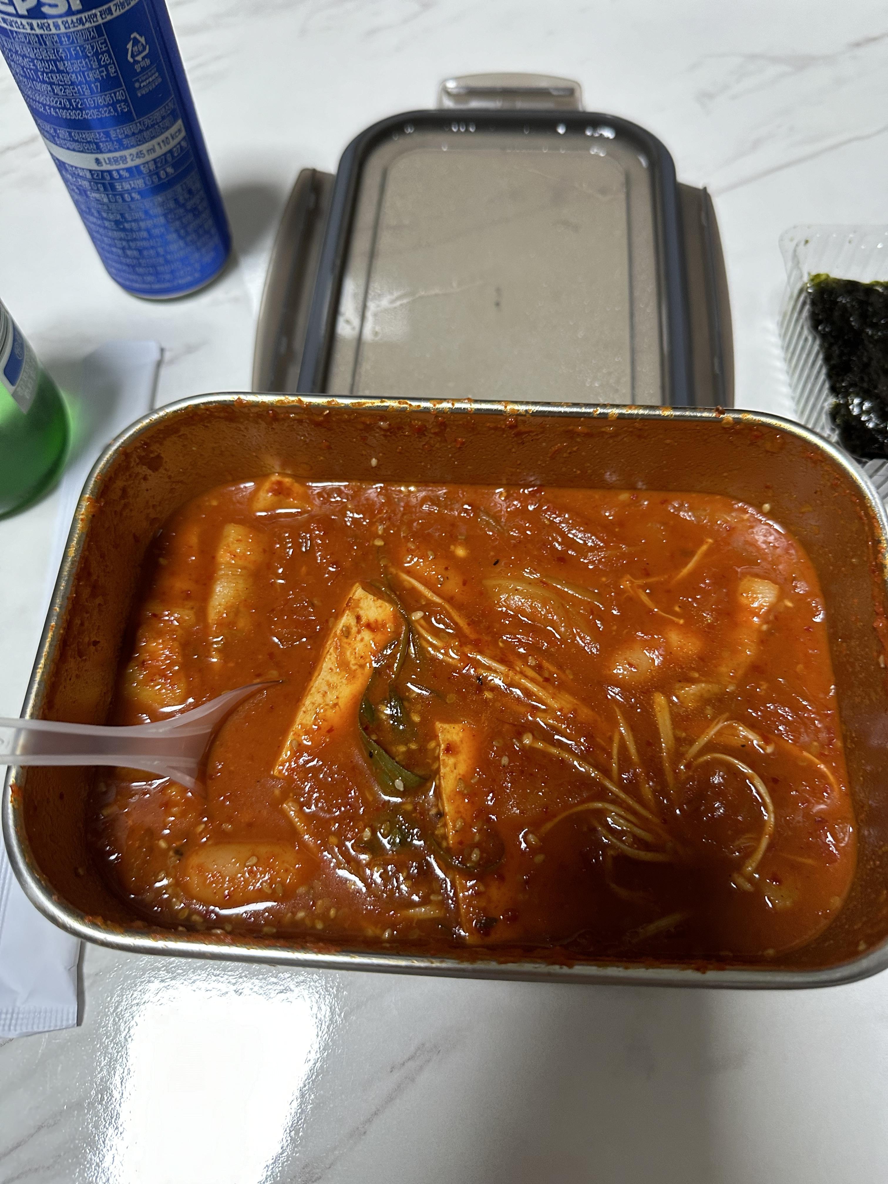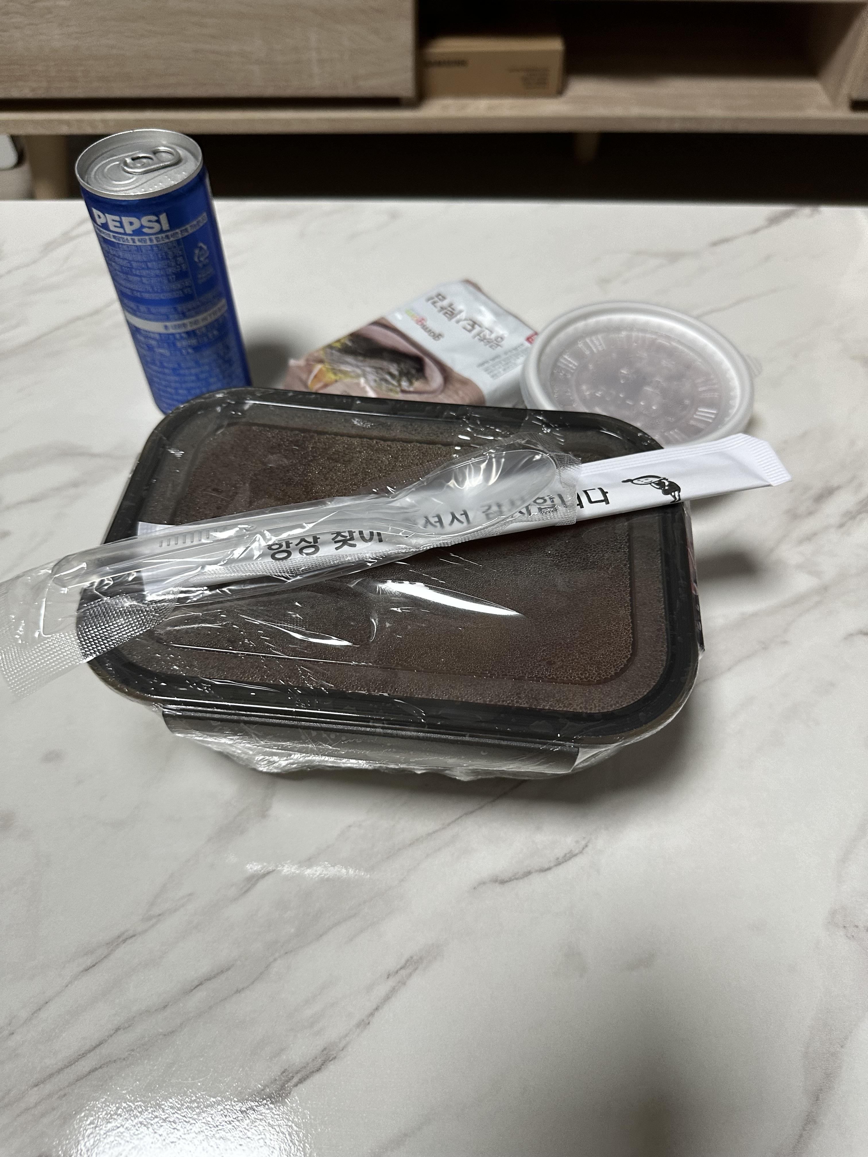 아무래도 얼큰한 묵은지 김치찜이다보니 술을 안먹기에는 아쉬웠습니다. 배달을 시키고 배달이오는 동안에 1층 편의점에 가서 소주 한병을 샀습니다. 주문한 거 그대로 묵은지 김치찜 매운맛과 공기밥, 수저, 젓가락, 콜라, 도시락김까지 모두 왔습니다. 김치찜이 들어있는 그릇만 다회용이고 나머지는 일회용품이긴 합니다.