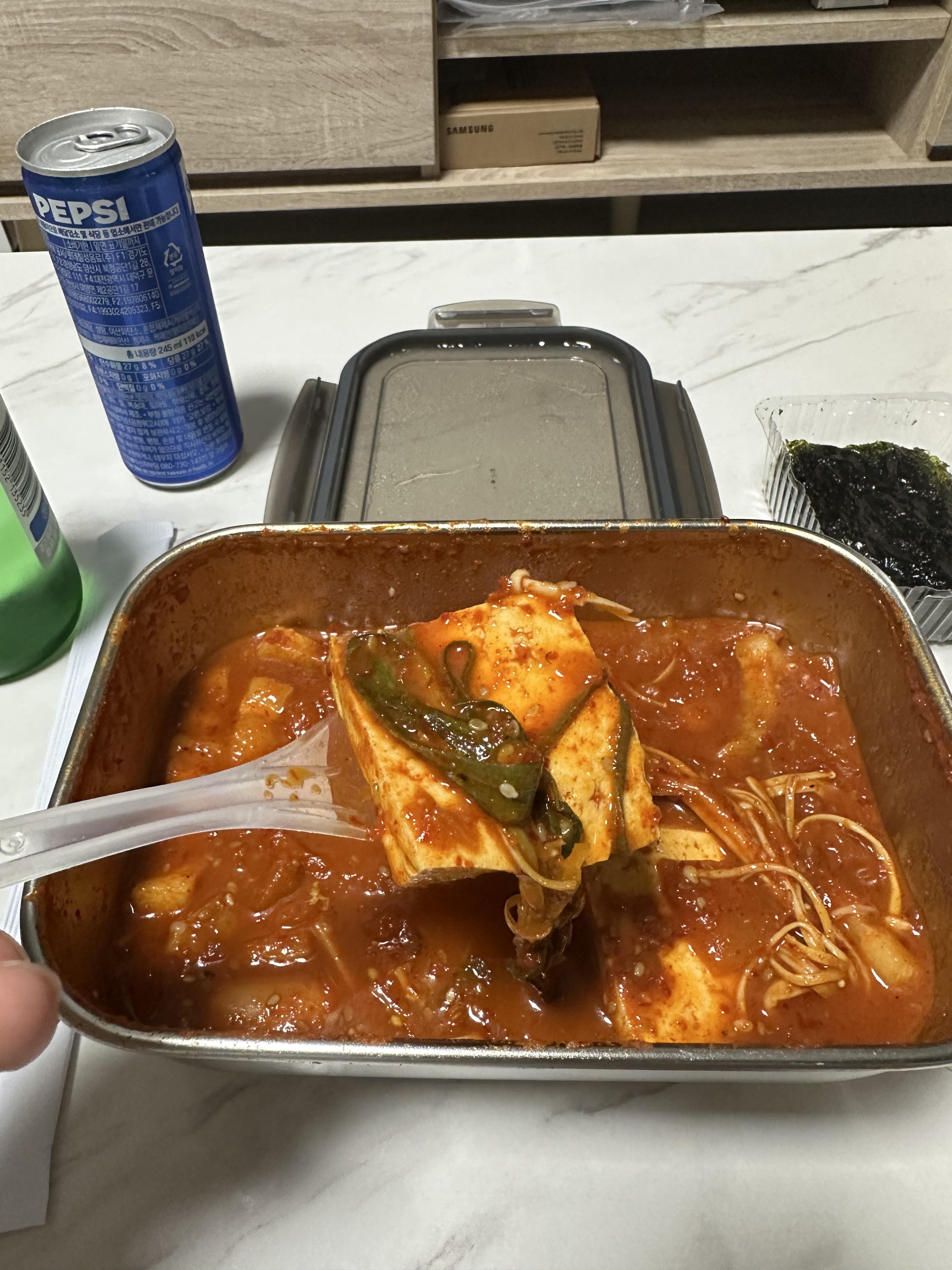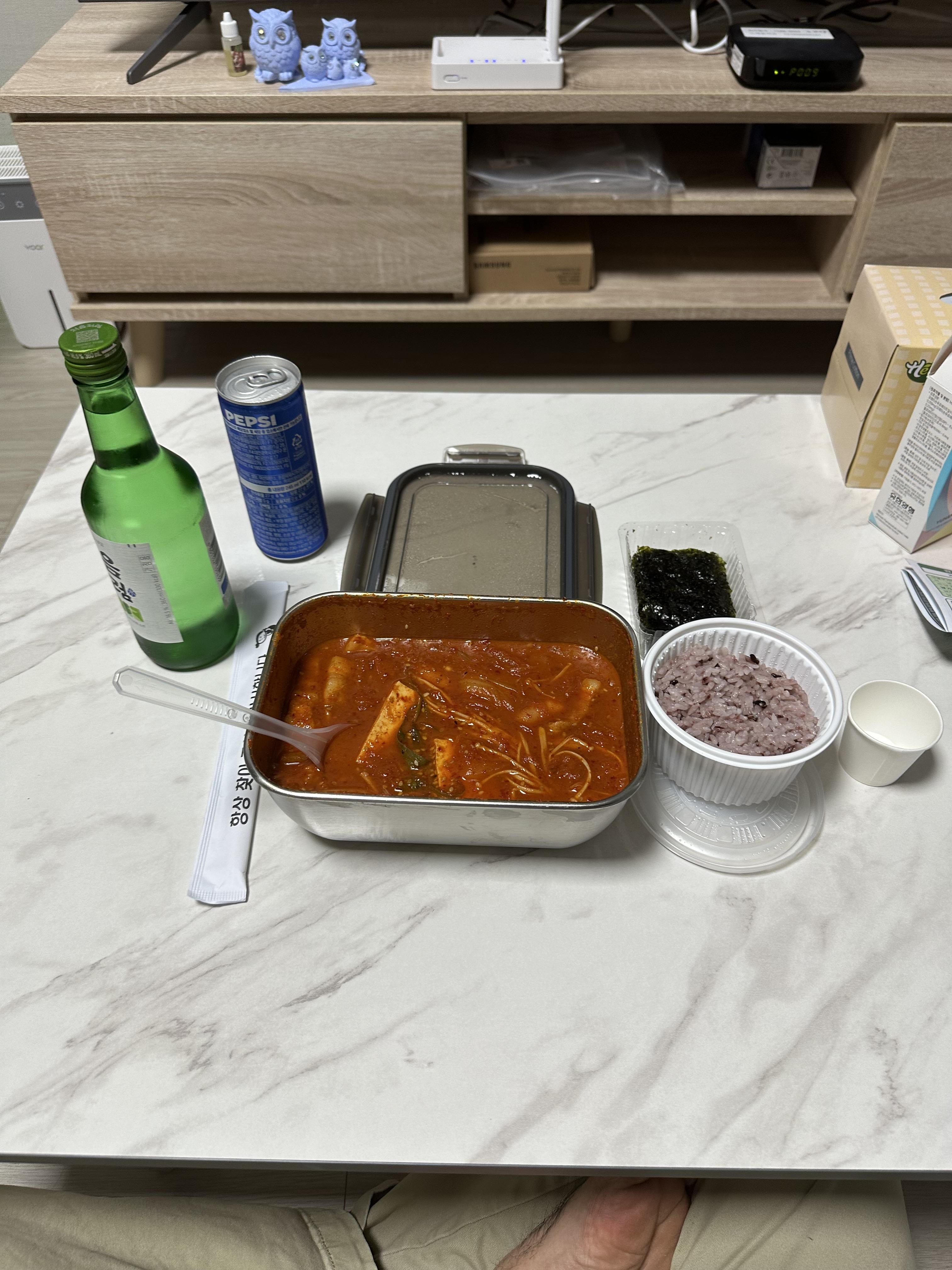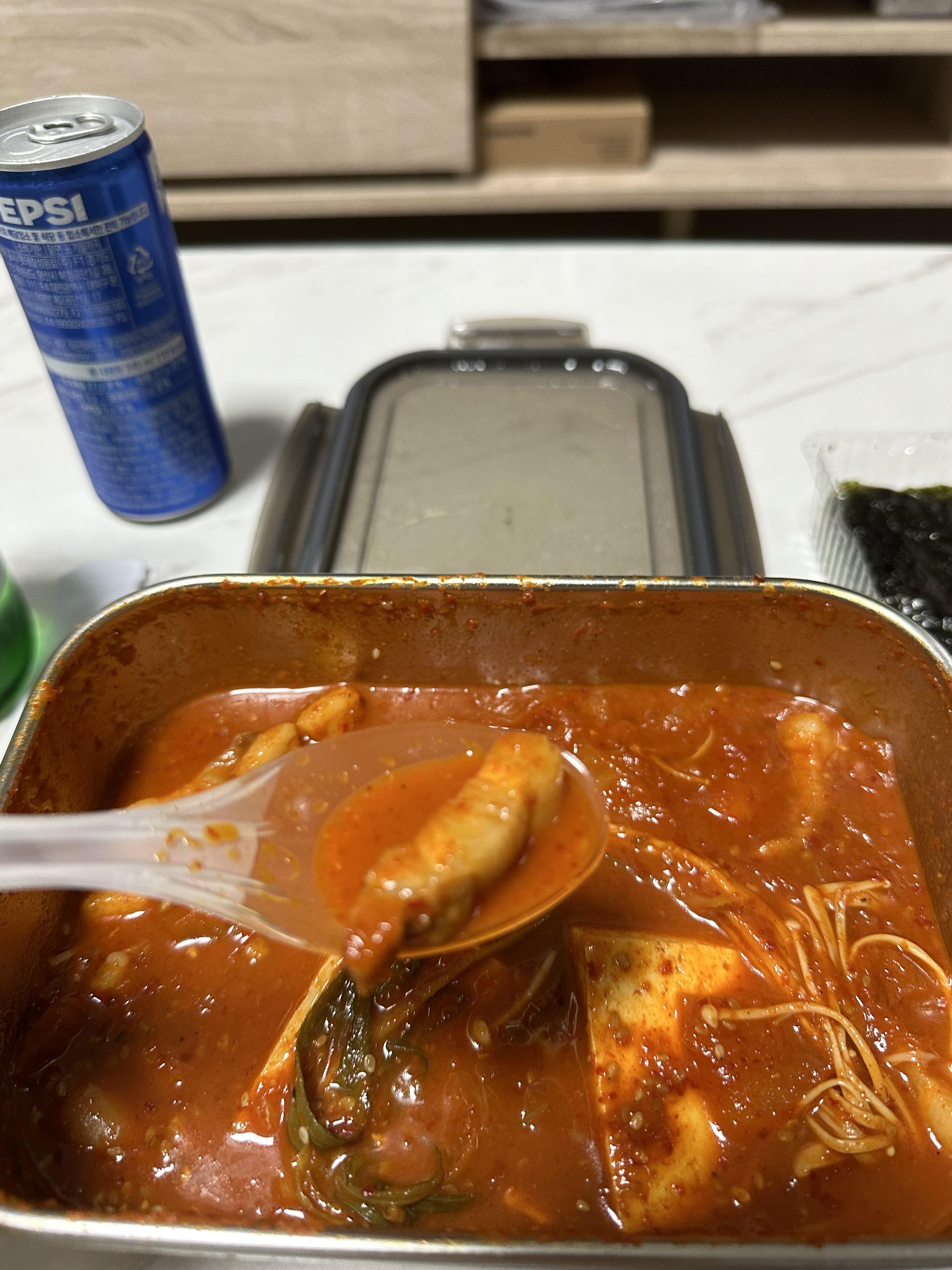 아무래도 얼큰한 묵은지 김치찜이다보니 술을 안먹기에는 아쉬웠습니다. 배달을 시키고 배달이오는 동안에 1층 편의점에 가서 소주 한병을 샀습니다. 주문한 거 그대로 묵은지 김치찜 매운맛과 공기밥, 수저, 젓가락, 콜라, 도시락김까지 모두 왔습니다. 김치찜이 들어있는 그릇만 다회용이고 나머지는 일회용품이긴 합니다.