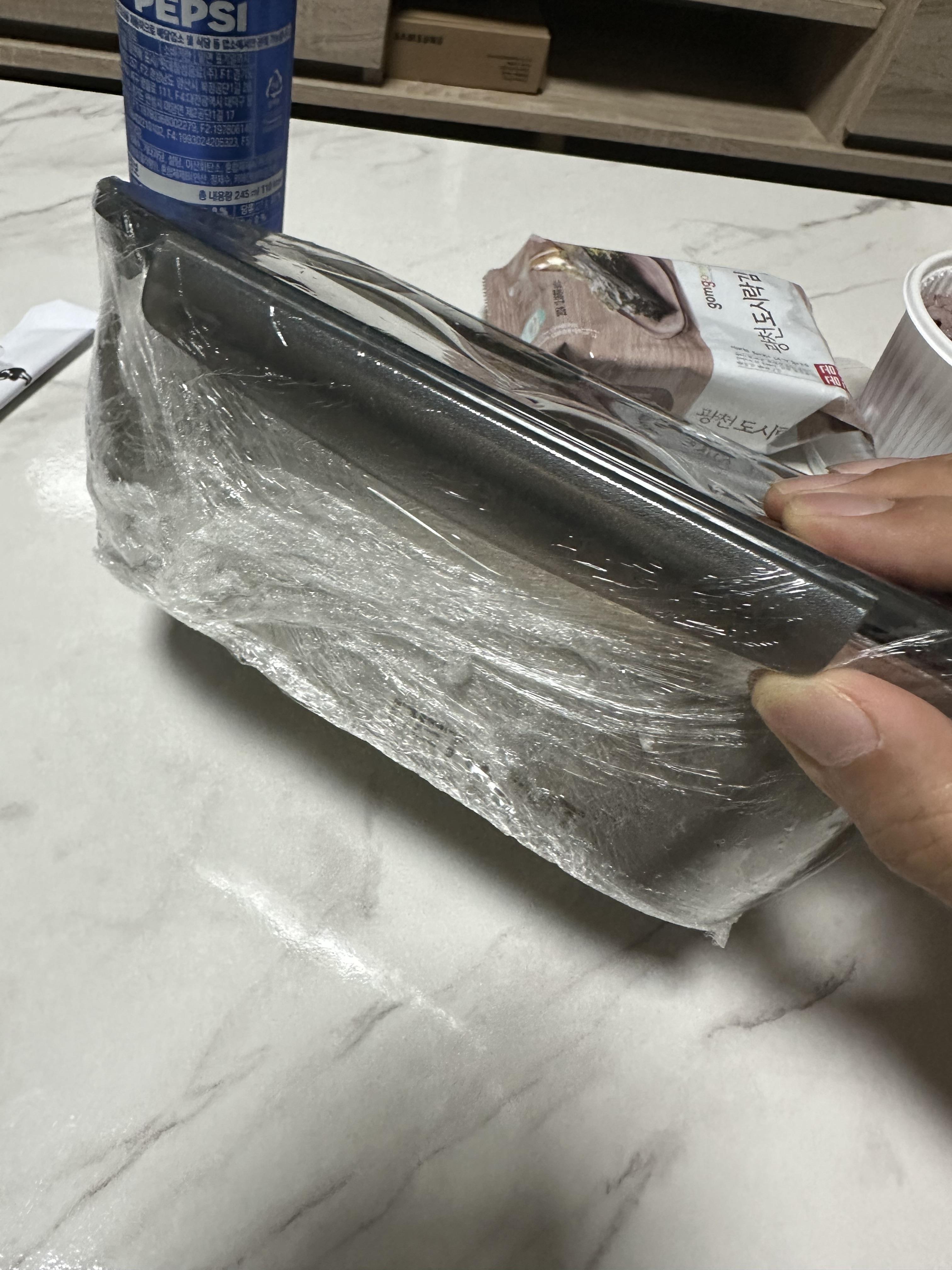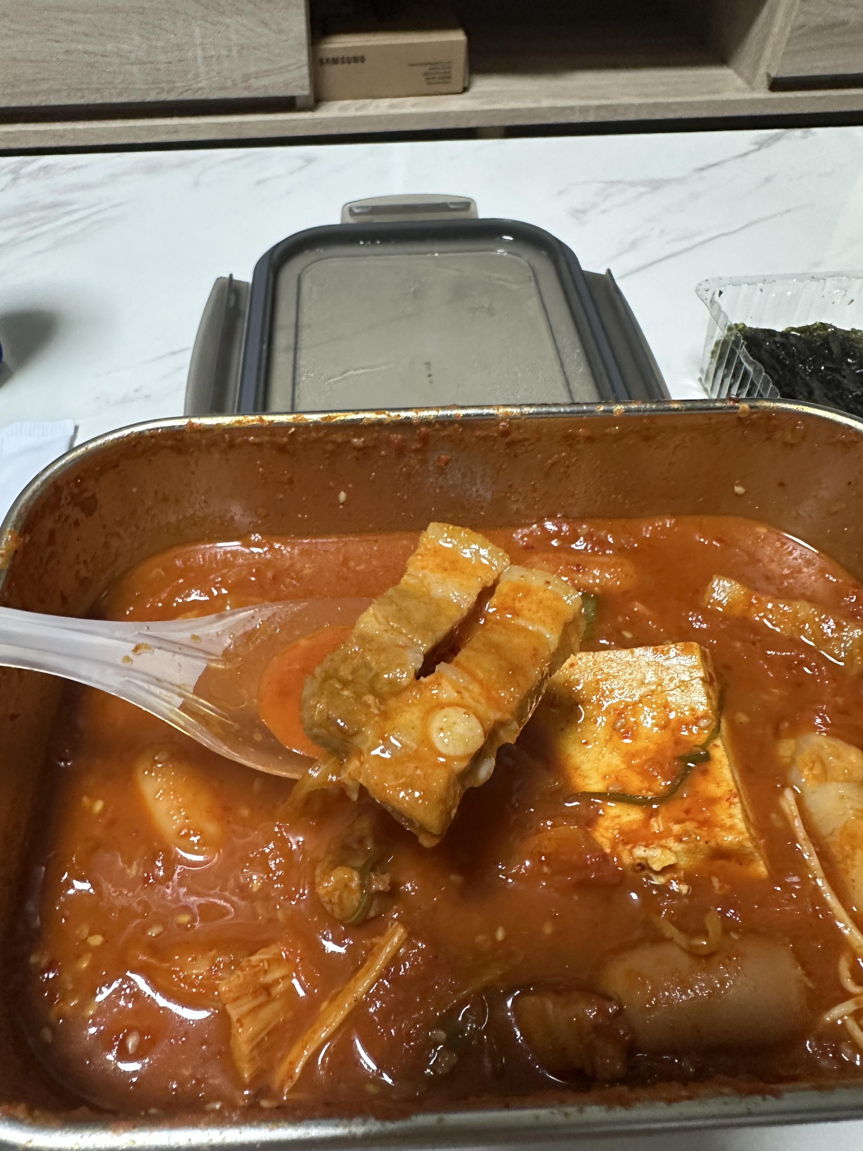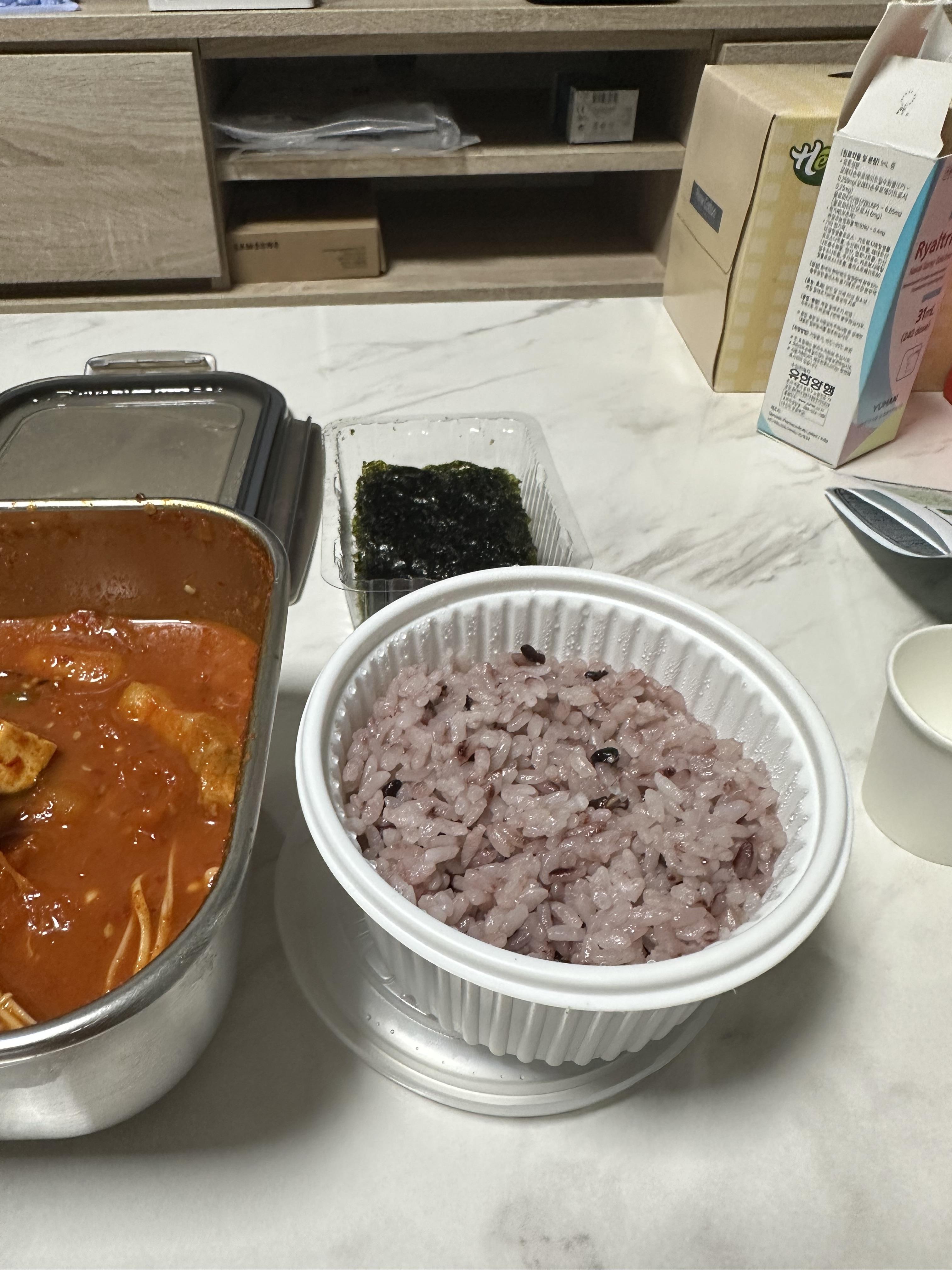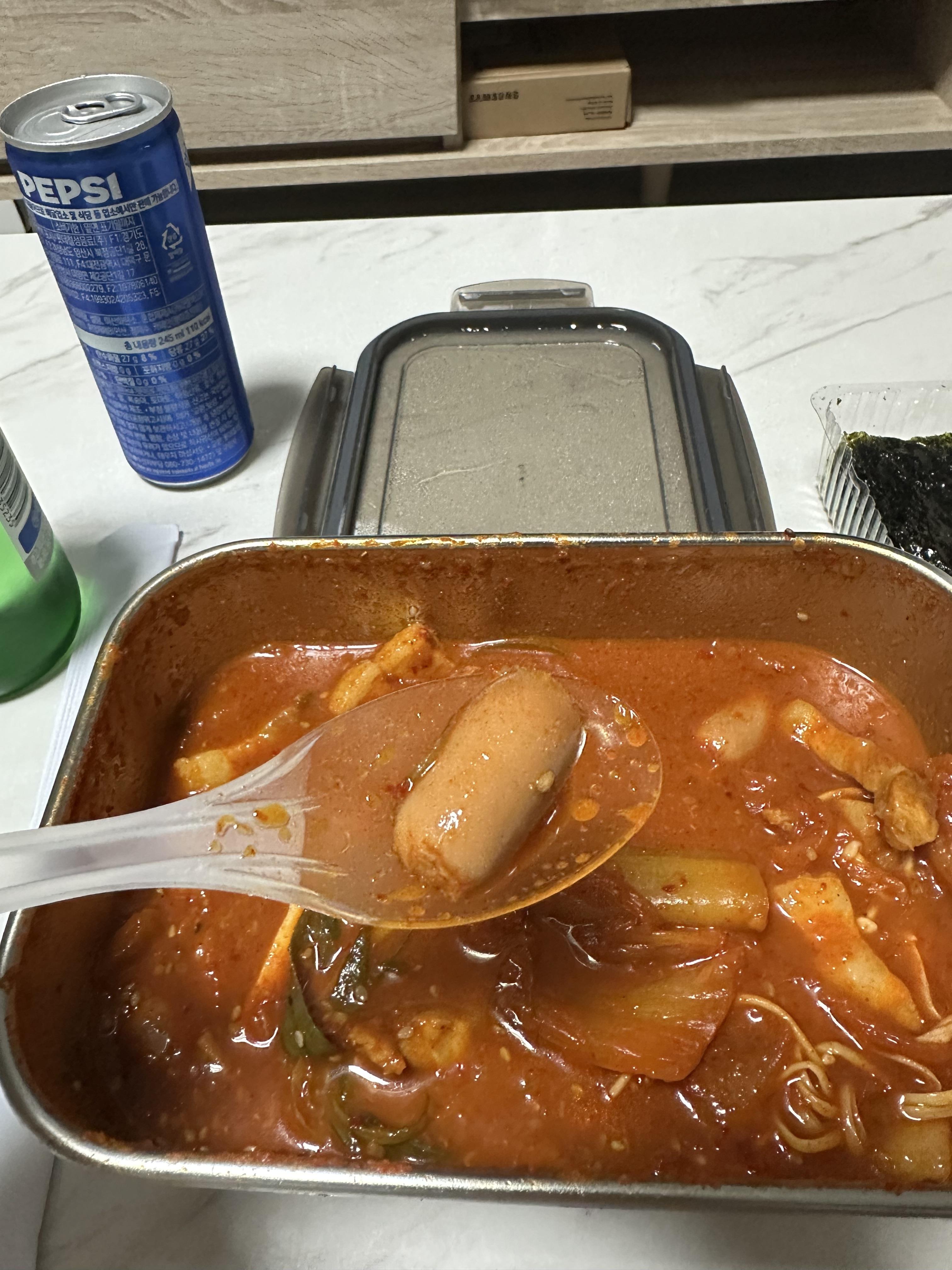 아무래도 얼큰한 묵은지 김치찜이다보니 술을 안먹기에는 아쉬웠습니다. 배달을 시키고 배달이오는 동안에 1층 편의점에 가서 소주 한병을 샀습니다. 주문한 거 그대로 묵은지 김치찜 매운맛과 공기밥, 수저, 젓가락, 콜라, 도시락김까지 모두 왔습니다. 김치찜이 들어있는 그릇만 다회용이고 나머지는 일회용품이긴 합니다.