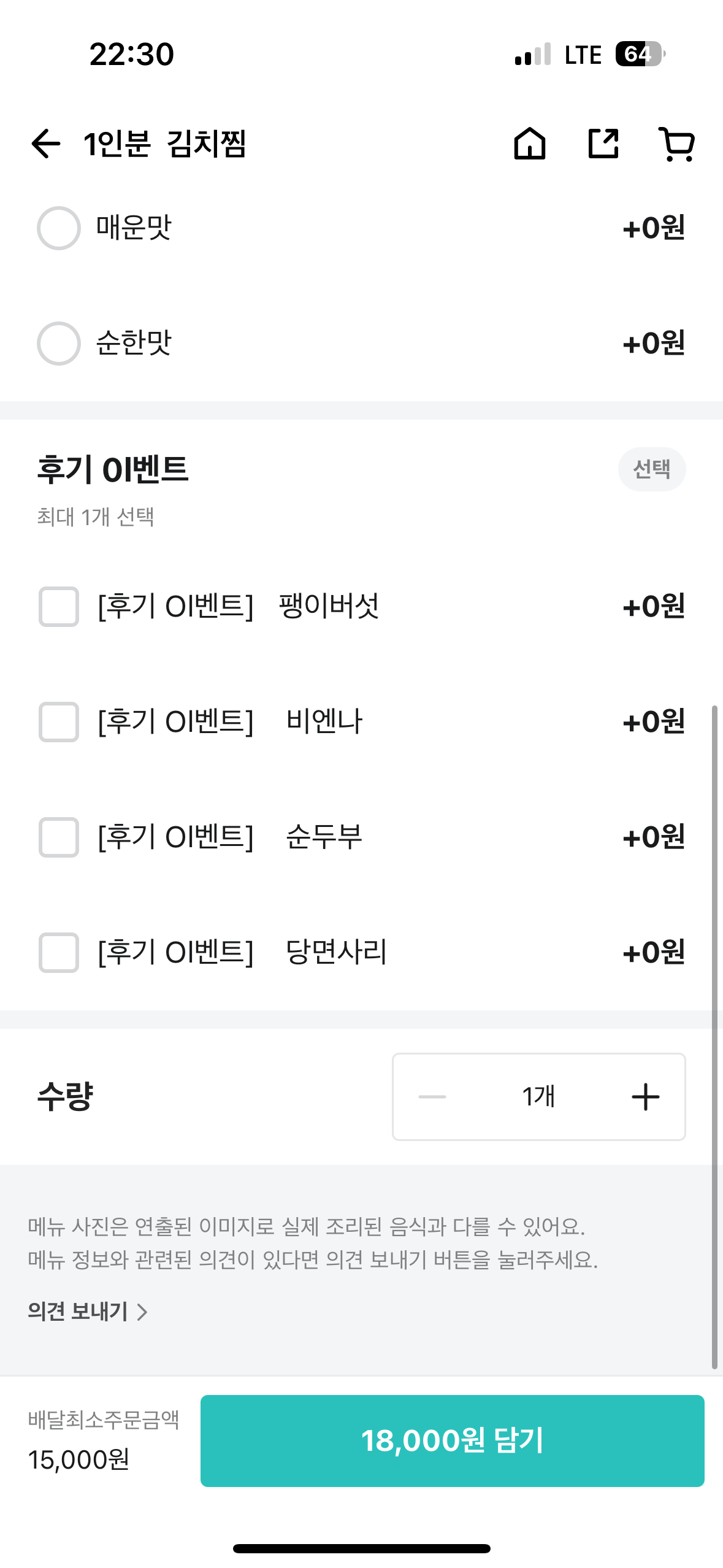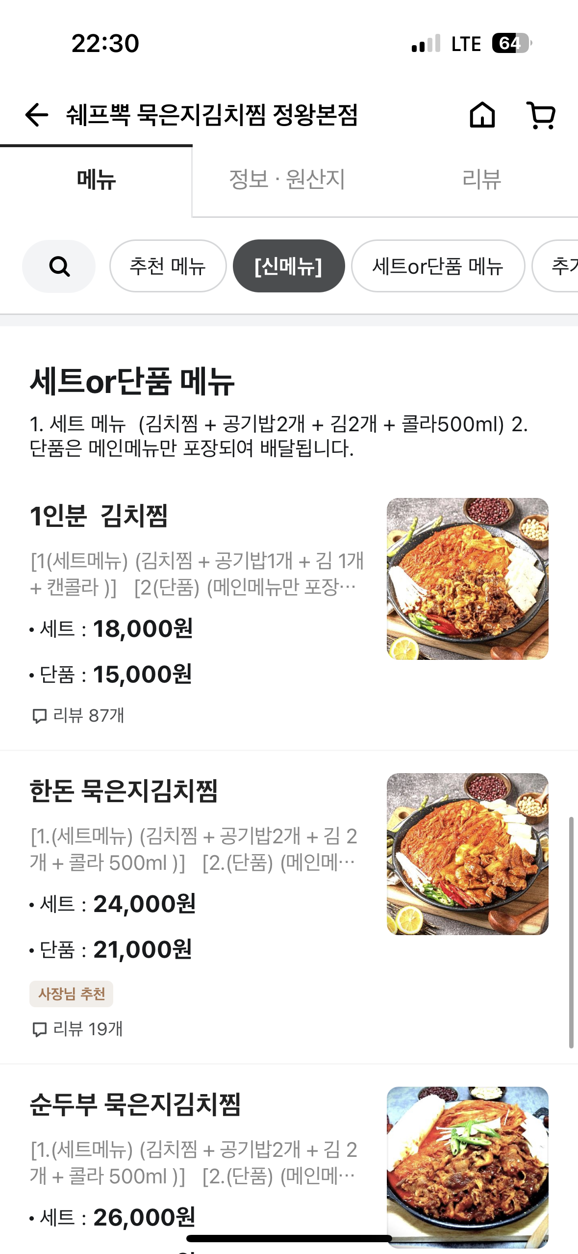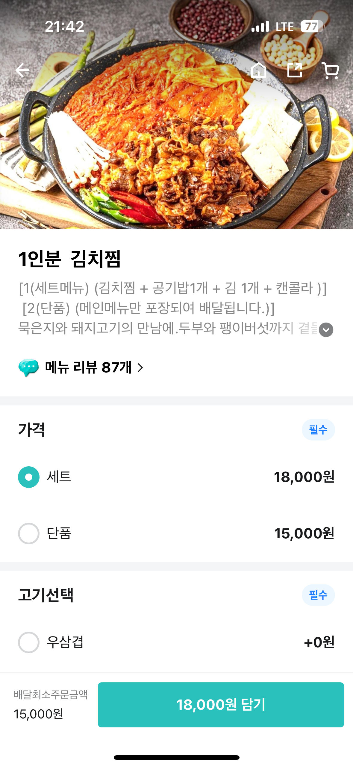 - 1인분 김치찜 (세트 18,000원, 단품 15,000원)