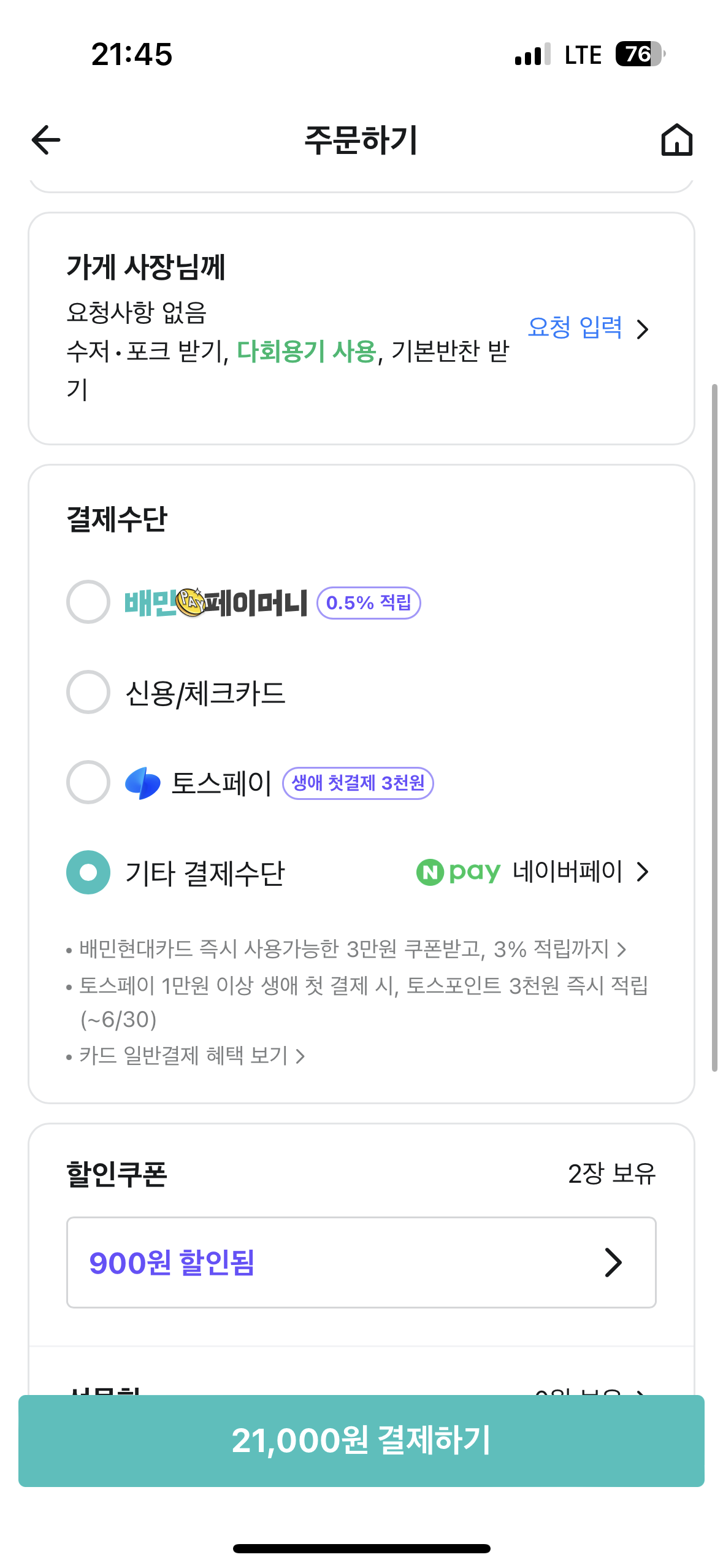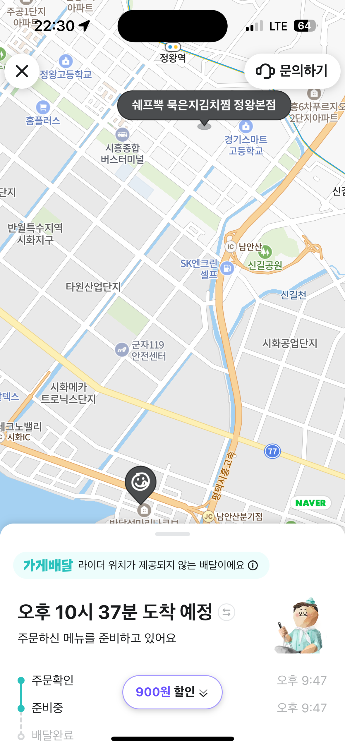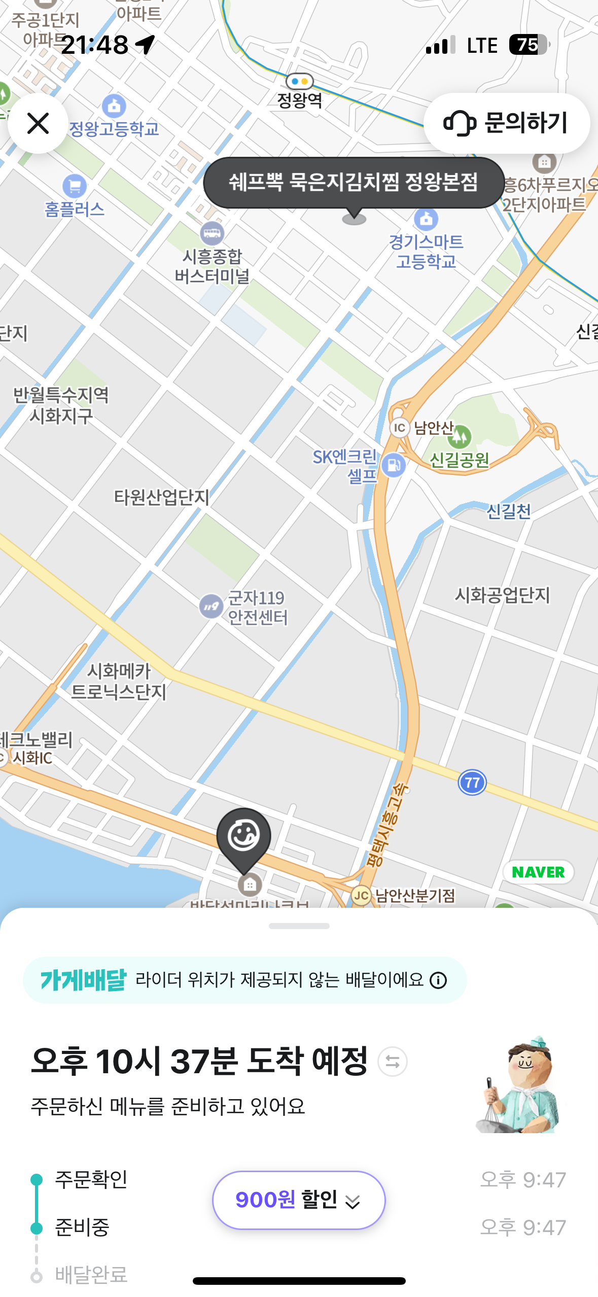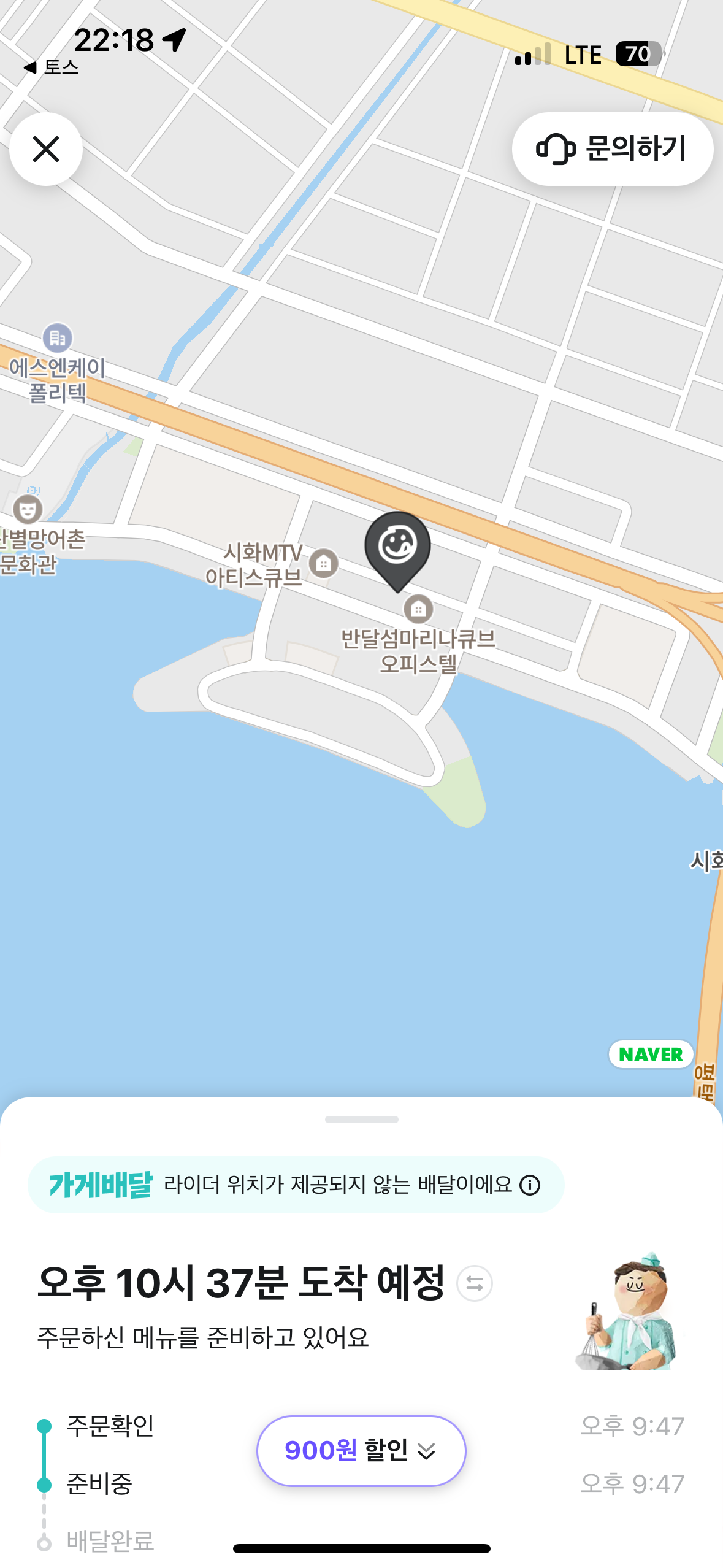 결제 수단은 네이버페이로 하기로 했습니다. 주문을 하다보면 가게마다 첫 고객인 경우 많은 금액은 아니더라도 할인 쿠폰을 제공 하고 있습니다. 안받는것보다는 낫기 때문에 저도 900원 할인 쿠폰을 적용했습니다. 버스 안에서 무엇을 먹을까 배달의 민족을 계속 고민하다가 버스에서 주문못하고 다 내려서 주문을 했고 저녁보다는 거의 야식이 되었습니다. 10시 37분에 도착하기로 되어있습니다. 그러나 예정 시간보다 제법 일찍 도착했던 것 같습니다.