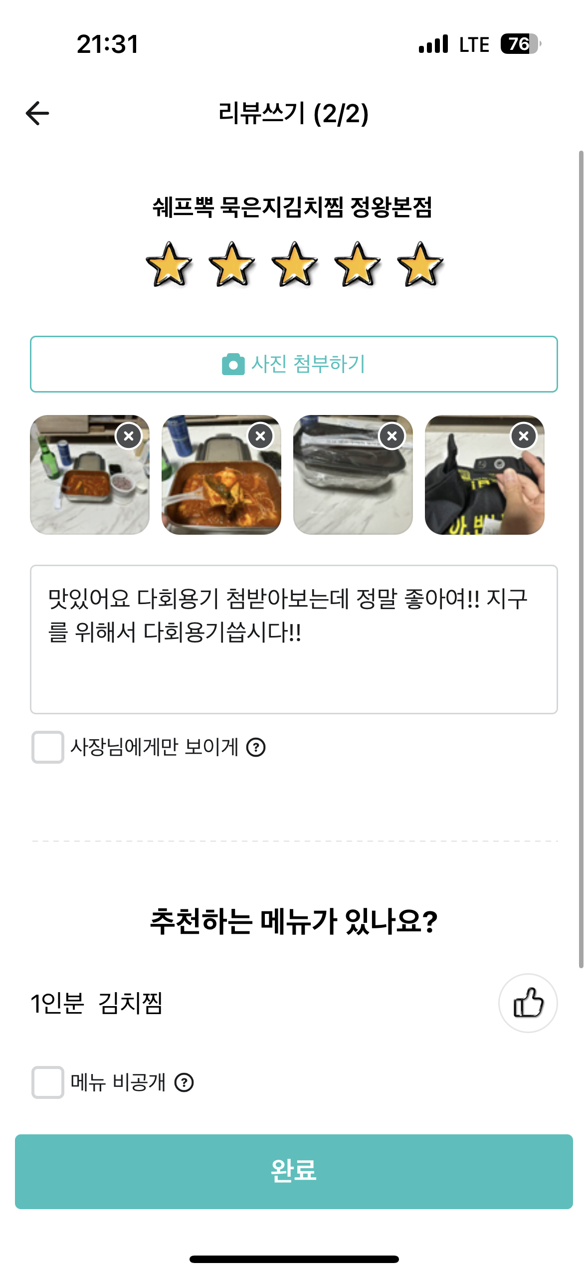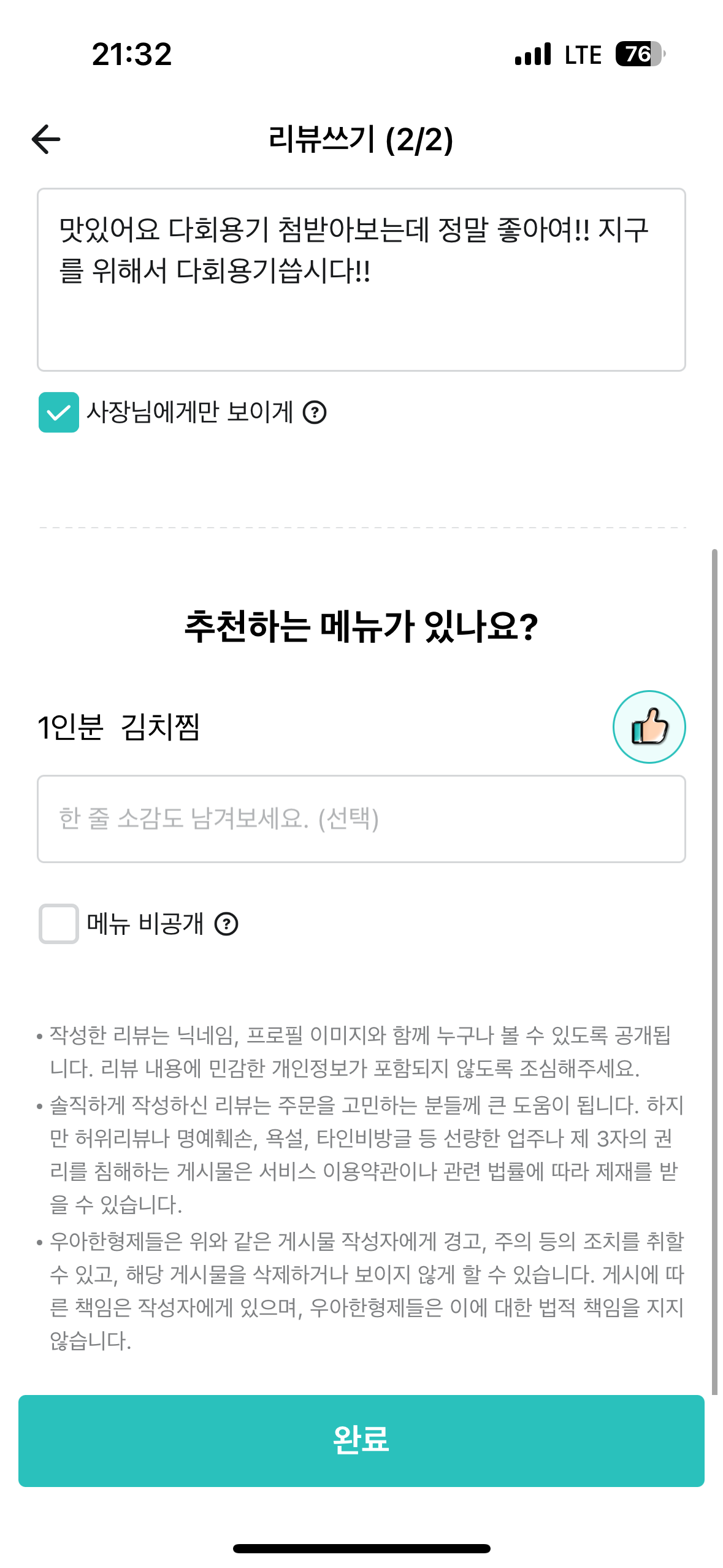 - 리뷰 작성 후 사장님 볼 수 있도록 했습니다. 사장님에게만 보이게 체크박스를 체크하시면 사장님만 볼 수 있어요.