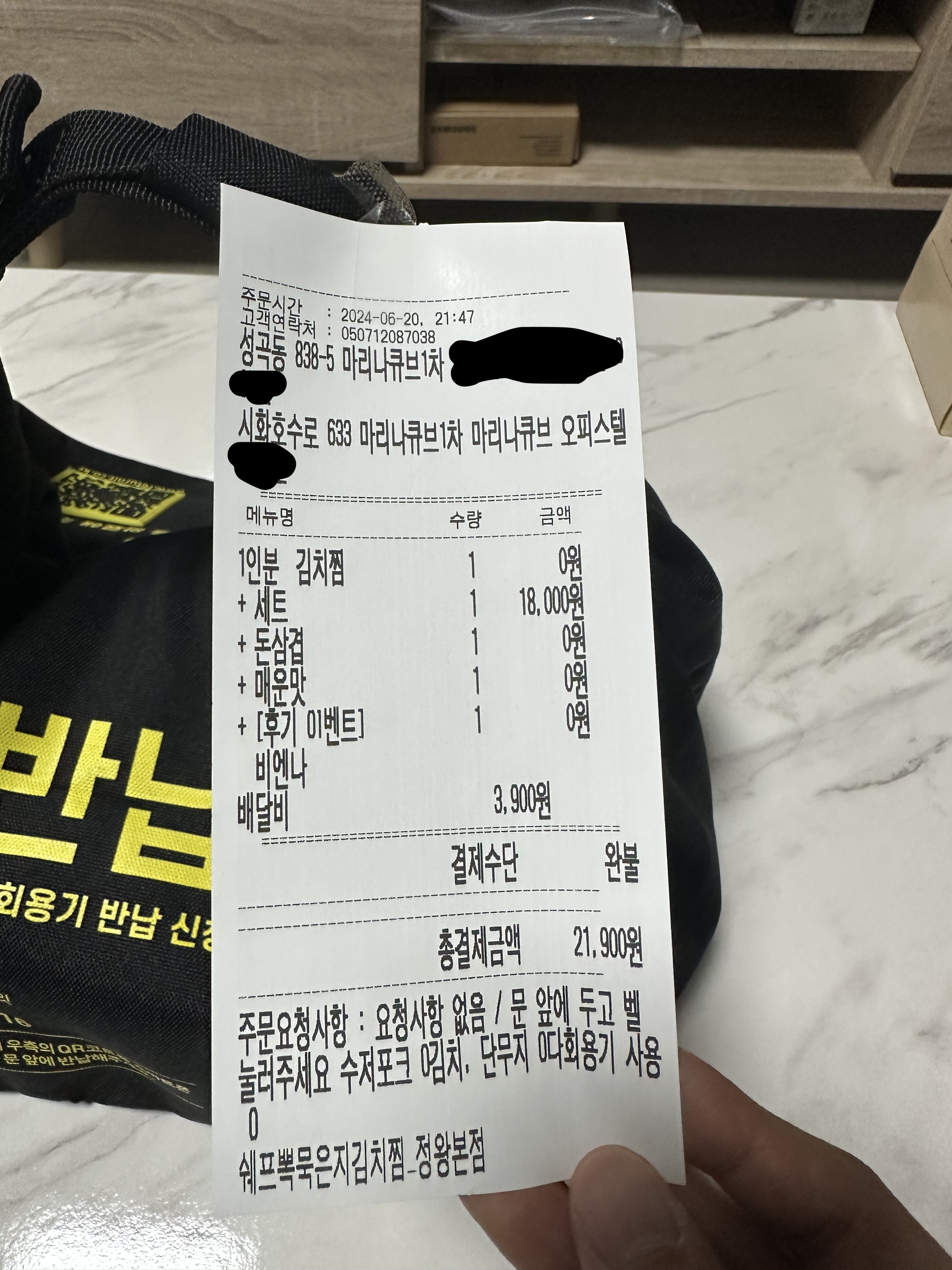 벌써 일주일이 이렇게 지나가고 있습니다. 이번주는 여행 사진보다 안산 반달섬 소식과 맛집 후기들을 많이 올리게 됩니다. 반달섬이 작년에는 한참 공사중인데가 고금리 상황으로 인해 상가가 빠르게 들어서지를 못하고 있었습니다. 그러나 아직 금리 인하도 오지 않았지만 금리 인하설만 가득한 상황속에서 다행인지 모르지만 상가가 안산 반달섬에 많이 들어서고 있습니다. 덕분에 비싼 배달료에 덜 부담을 느끼면서 반달섬에서 보내고 있습니다. 지난주 목요일 퇴근하면서 배달의 민족의 앱을 보면서 무엇을 먹을까 찾았습니다. 반달섬은 안산 시내에서도 한참 떨어져있습니다. 인근에 거북섬과도 거리가 있고 정왕동과도 거리가 있었습니다. 그래서 어디서 시키던간에 일단 가격이 저렴하지는 않았습니다. 지난주 목요일에 주문 했는데요. 정왕역 근처에 있는 곳에서 오기 때문에 배달료가 제법 비쌀 거 같아 5000원 이상 할줄 알았는데요. 정왕동 정왕역과 이마트 사이에서 반달섬까지 거리가 꾀 되는데도 배달료는 5000원도 되지 않는 3900원이었습니다. 요즘 배달료는 제법 비쌉니다. 배달의 민족의 비싼 수수료 덕분인지 1인가구들을 위한 음식을 찾기도 힘듭니다. 10000원 이하를 시키고 싶은데 대부분 18000원 이상 가격을 하기 때문에 물가와 배달료가 비싸다는 것을 몸으로 직접 느껴질 정도입니다. 쉐프뽁 묵은지김치찜 정왕점에서 1인가구들을 위한 1인분 김치찜 세트를 판매하고 있었습니다. 뭐 저렴하다고는 말은 못하니다. 요즘같은 고금리에서는 1인 가구를 위한 음식 2만원 이하만으로도 고마워해야 할 정도 였습니다. 저는 쉐프뽁 묵은지 김치찜에서 1인분 김치찜 세트로 18,000원 주문 했습니다. 대부분 배달의 민족의 경우 후기 이벤트가 있어서 후기로 쓴다고 하면 뭔가를 더 주고 있습니다. 저도 당시 후기이벤트에 참여하기 위해 비엔나를 받기로 했습니다.