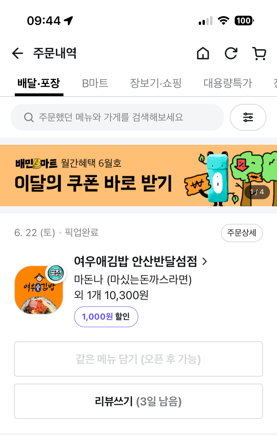 - 배민은 기본적으로 주문 시 일회용품 안받기가 되어있기 때문에 일회용품이 필요한 경우 일회용품 받기로 선택해주셔야 합니다.
