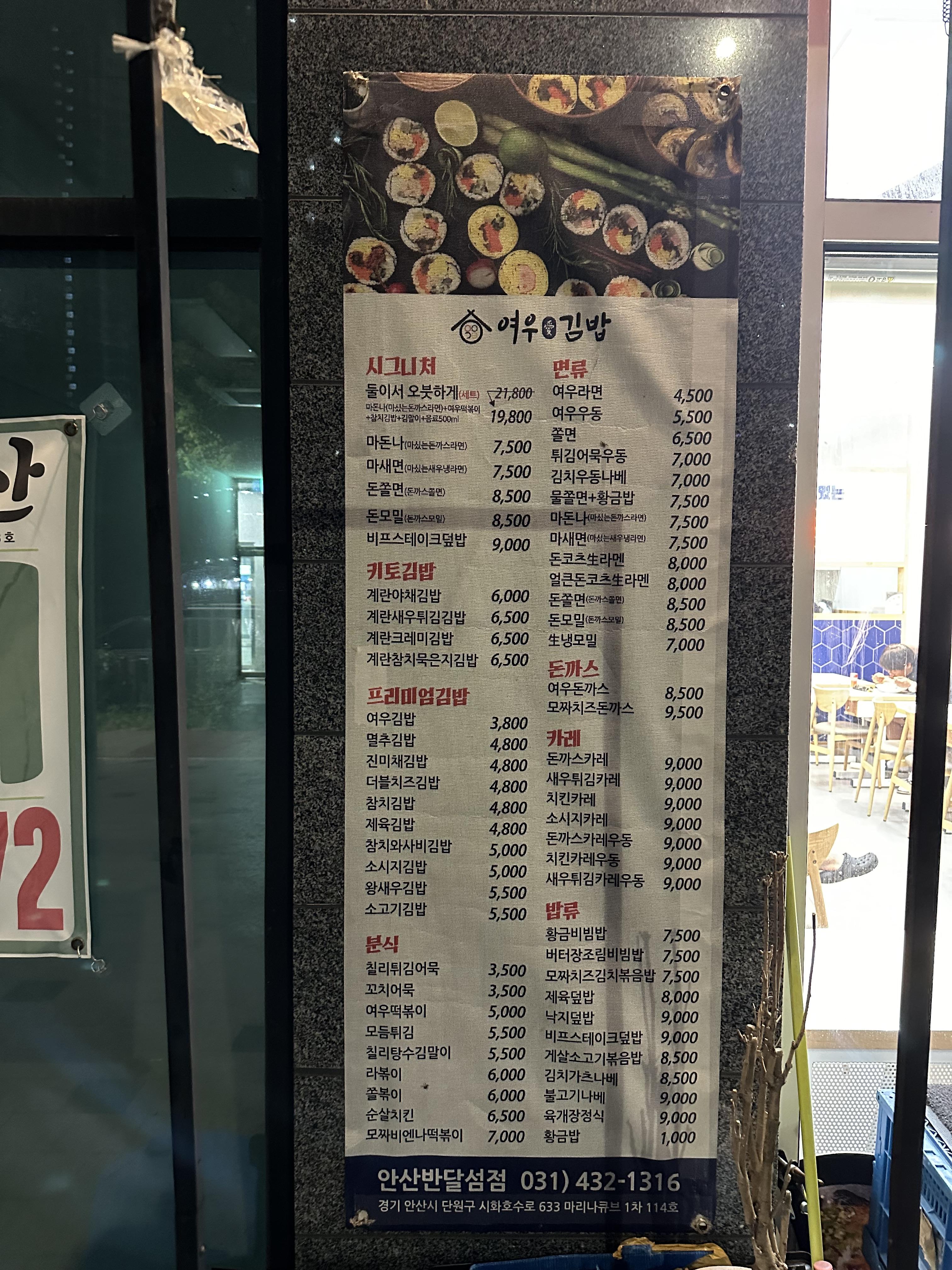 - 가게이름처럼 다양한 김밥 종류가 많습니다. 키토김밥, 프리미엄김밥, 그리고 라면과 라멘 등 많이 있습니다.