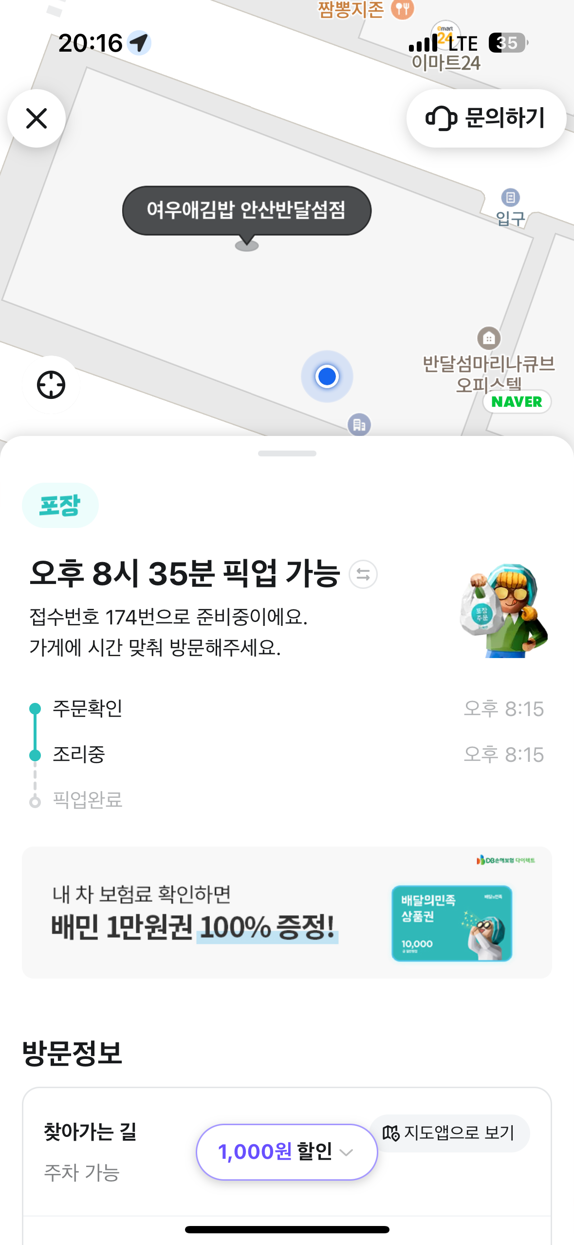 주문하고 배달의민족에서 푸시 알림으로 8시 35분에 픽업이 가능하다고 했습니다. 마침 무인 세탁에서 세탁이 마무리 되는 시간이였습니다. 그래서 세탁물을 모두 꺼내어 건조기에 넣고 가게로 천천히 이동하였습니다. 정해진 시간에 맞춰서 푸시 알림이 도착했고 저는 가게로 이동 했습니다. 여우애김밥 안산 반달섬점은 8시반까지는 주문해야 포장,배달, 식사가 가능하다고 했습니다. 여우애김밥이 아니더라도 음식점을 늦은시간에 이용 할 시 미리 전화로 물어보는 것도 허탕치지 않는 좋은 방법 같습니다.