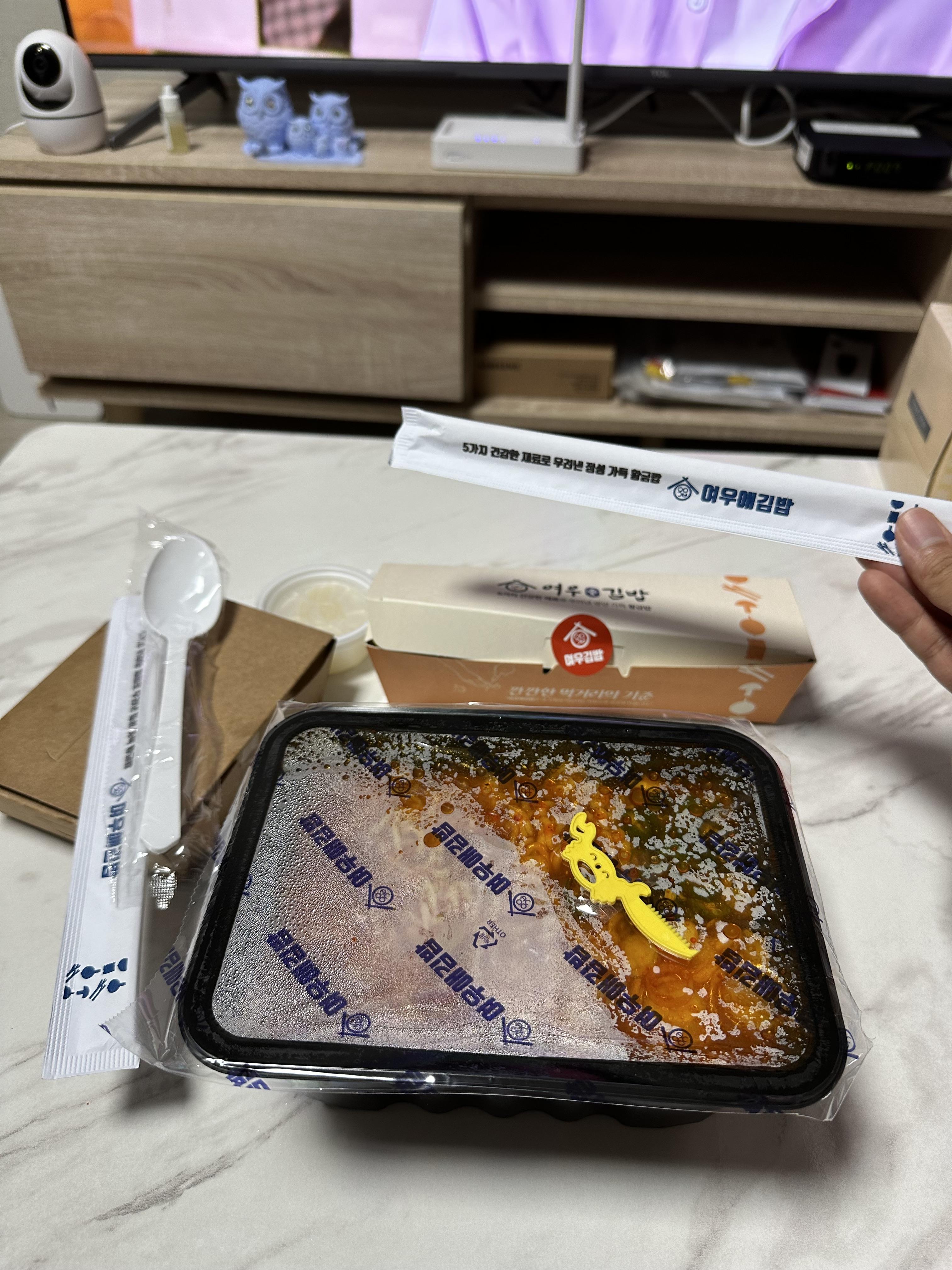 집에 와서 주말드라마 미녀와 순정남을 켜놓고 포장해온 마돈나 메뉴를 개봉해봅니다. 배민의 포장과 배달 할 때 한가지 체크해야할 사항이 있는데요. 제가 예전 후기에도 전달드렸지만 기후위기로 인해 우리나라는 물론이고 전세계가 일회용품 사용을 자제하고 있습니다. 그래서 배민에서 주문 시 일회용품 안받기가 기본적으로 선택되어있습니다. 따라서 일회용품을 필요하다면 반드시 주문 시 꼼꼼하게 읽고 선택하시거나 설령 놓쳤더라도 가게 전화해서받을 수 있도록 해야 할 것입니다. 배달의 또 하나의 단점은 이미 배달을 하면 누락 된 요인에 대해 다시 받기가 힘들다는 것입니다. 아무래도 라면은 주문 후 포장이든 배달이든 너무 오래 놔두면 면이 불어 버릴수도 있습니다. 사람 성향에 따라서는 불어 터진 라면도 좋아하는 사람도 있는데요. 불어 터진 라면이 별로라면 여우애김밥과 거리가 떨어진 곳이라면 가까운 곳에서 주문 하는 것을 추천해요. 음식은 포장이나 배달보다 직접 먹는게 맛있는거 같아요. 특히 라면의 경우에는요. 라면 포장은 여우애김밥이 처음이긴 한데요. 일회용 칼로 비닐을 잘르면 됩니다. 또하나 라면 국물은 빨갛기 때문에 일회용 칼로 비닐을 짜를 때 조심 하는 것도 추천해요. 왠만하면 세탁 세재로 지워지지만 뜨거운 라면 국물이 몸에 묻으면 화상도 있고 밥 못먹고 샤워를 해야 할 수도 있으니까는요.