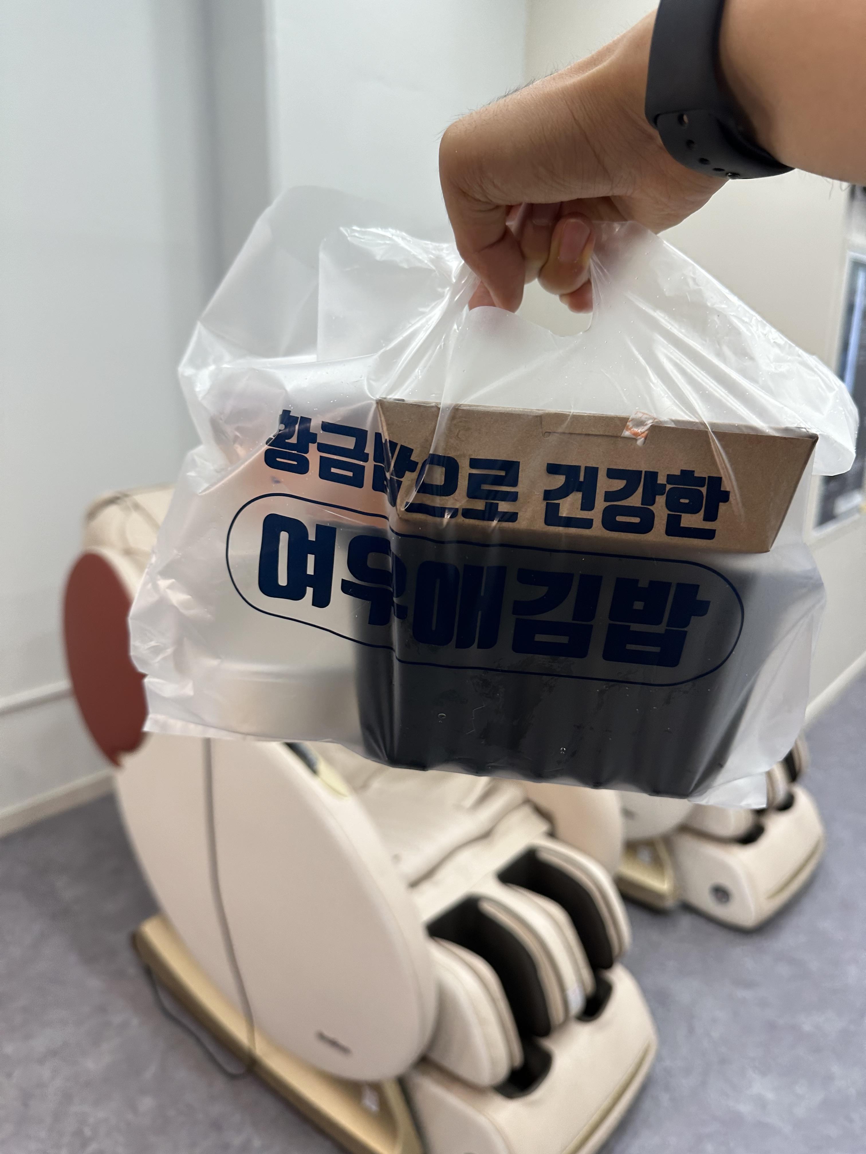 제가 살고 있는 오피스텔에 상가가 많이 들어오니까 배달을 시키지 않더라도 포장으로 주문을 할 수 있어서 너무 편리해졌습니다. 마리나큐브 오피스텔에는 무인 세탁 시설도 있었습니다. 이날은 봄과 겨울이 지나고 여름이 오니까 두꺼운 이불은 이제 덮기가 힘들었습니다 그래서 이불 세탁 맡기면서 여우애김밥 마감전에 주문을 했습니다. 8시 15분쯤에 주문하니까 8시 35분에 픽업이 가능하다고 푸시 알람이 도착했습니다. 이날은 비도 오고 날씨도 좋지 않았습니다. 그래서 무인 세탁방에서 시간을 보내면서 있었습니다.