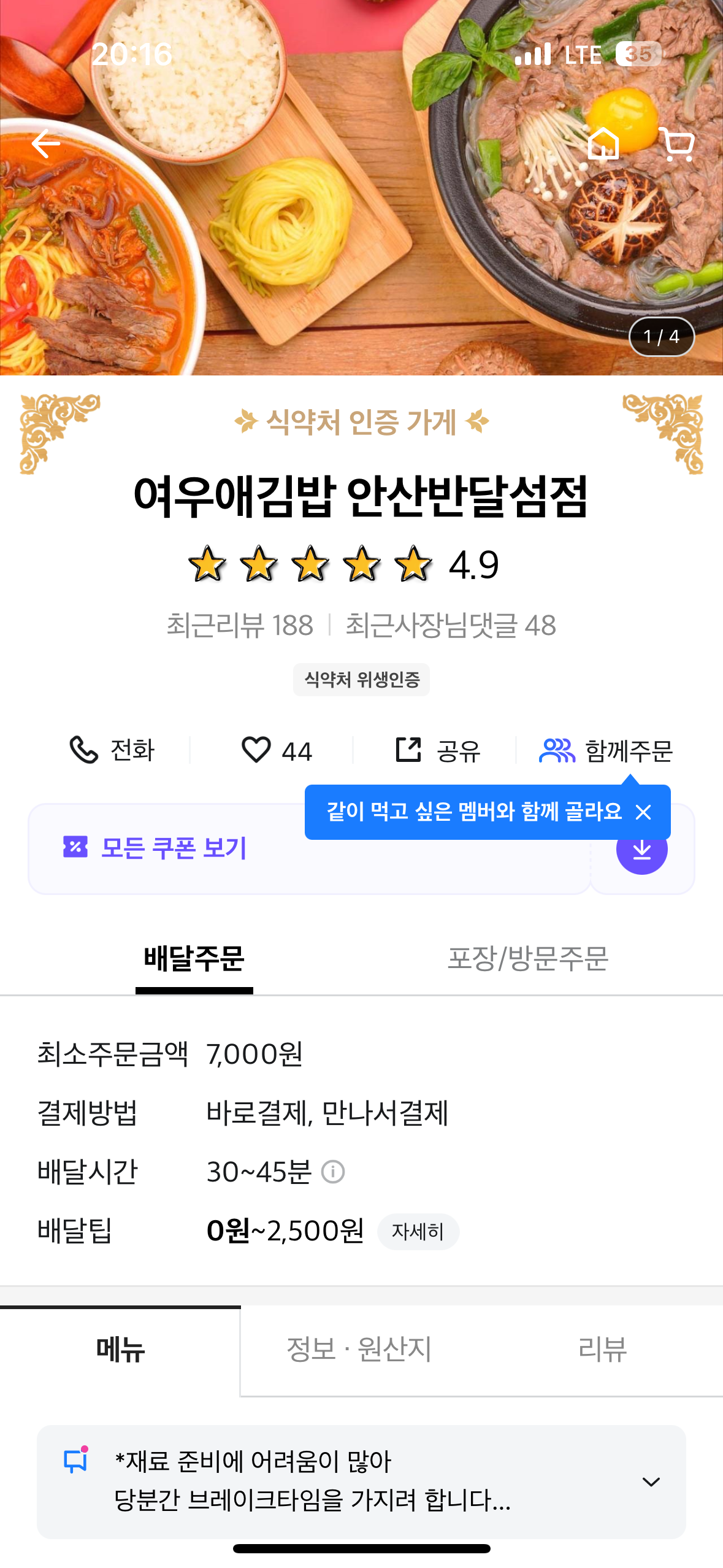 - 여우애김밥 안산반달섬점은 식약처 인증가게로 인정받은 가게로 믿고 안전하게 이용 할 수 있어요.