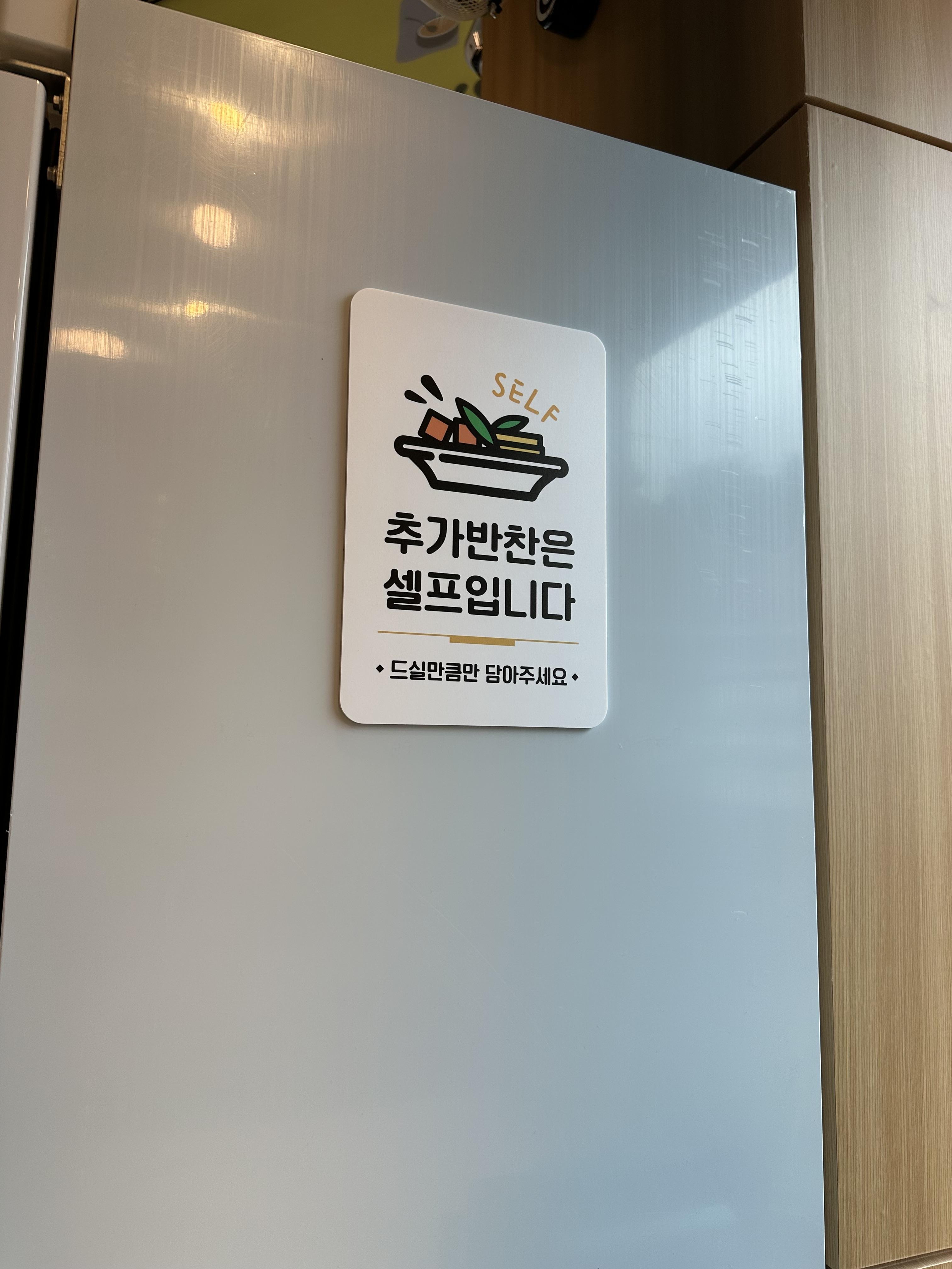 또한 다른 매장과 비슷하게 기본 반찬은 제공되지만 추가 반찬은 셀프로 제공됩니다. 추가 반찬 시 꼭 먹을만큼만 가져와서 드시는게 환경오염과 기후위기를 극복하기 위한 자세인 것 같습니다.