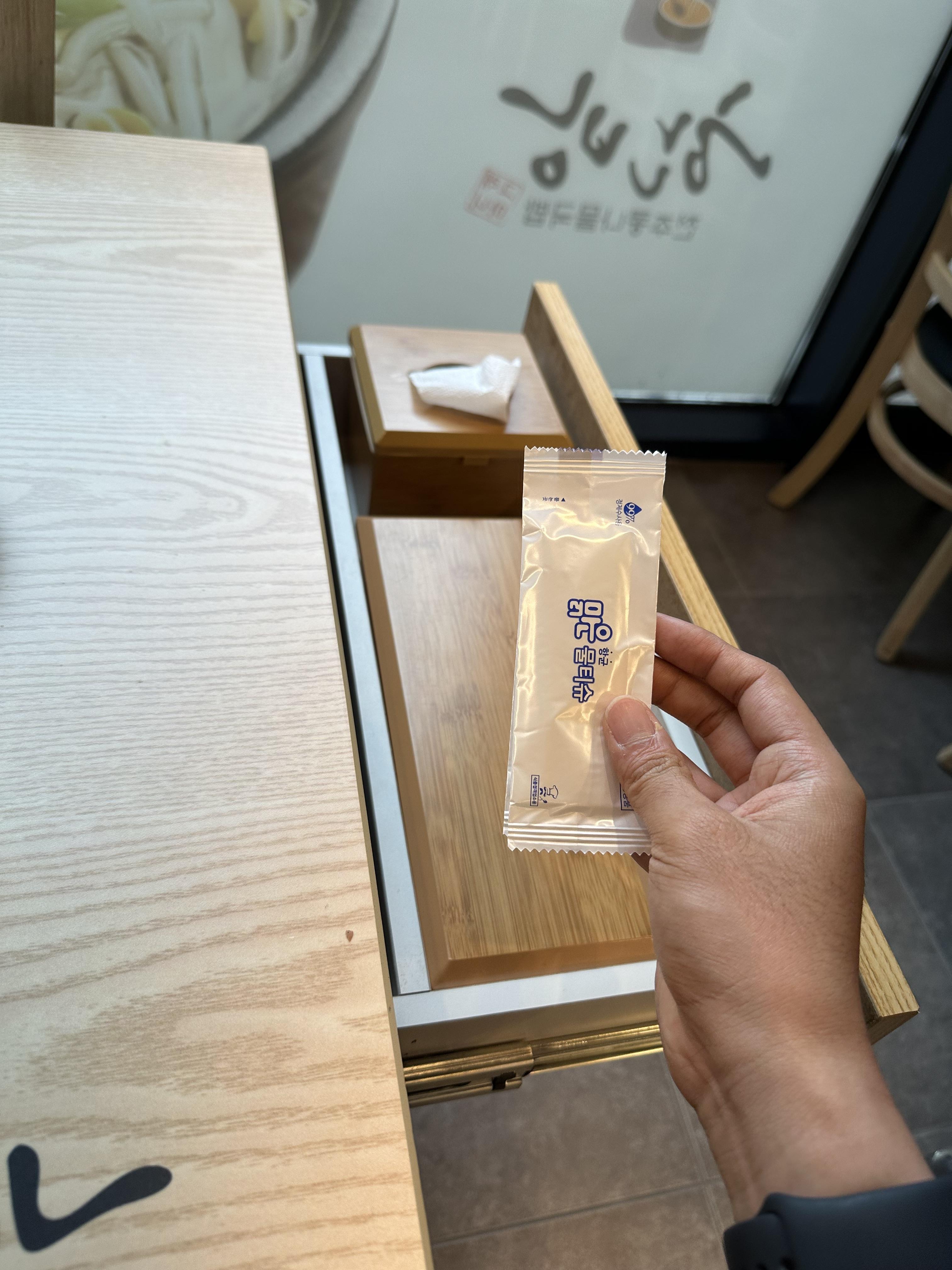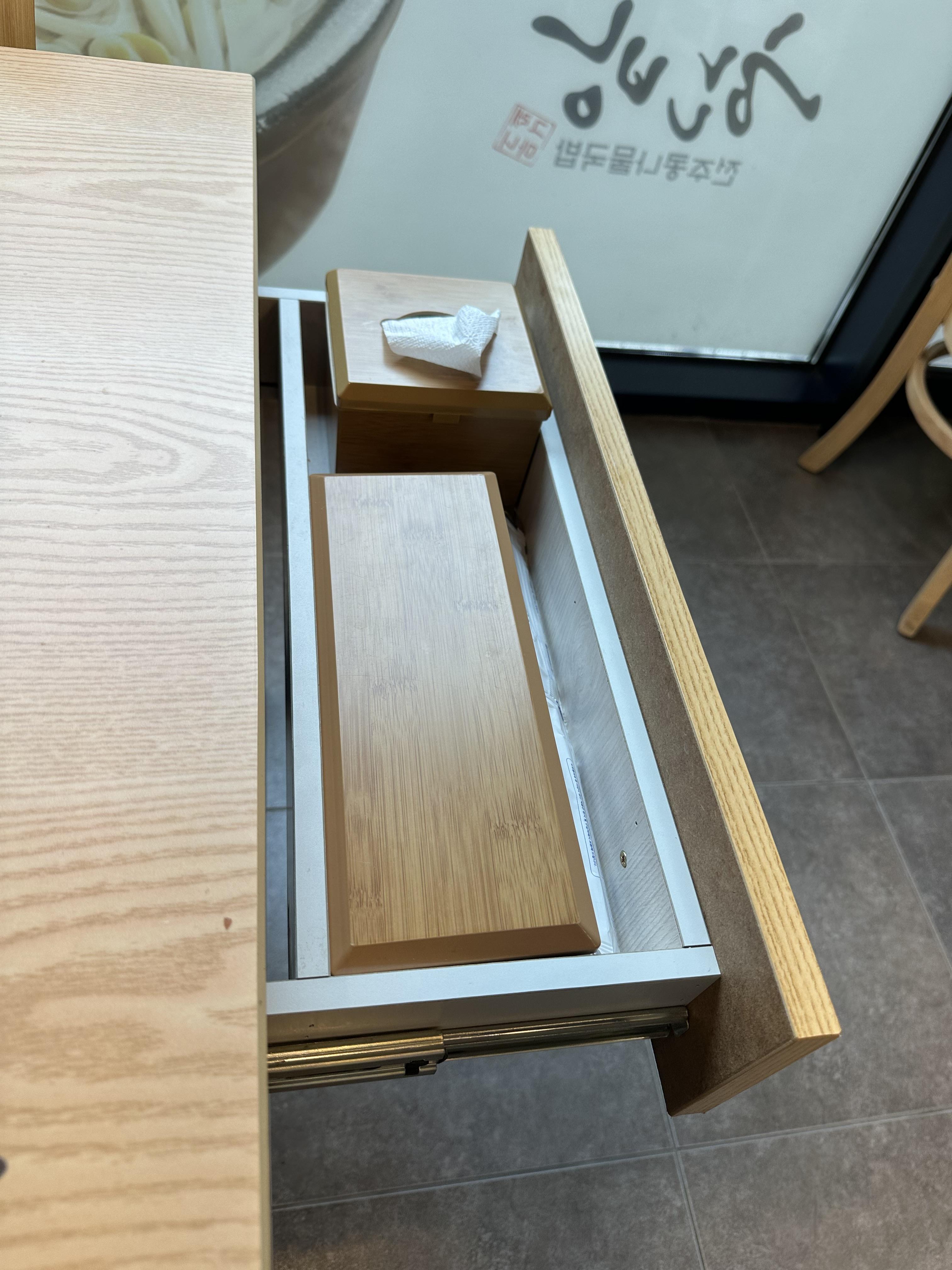 테이블 옆에는 수저와 젓가락, 냅킨 그리고 물티슈가 담겨져 있는 서랍이 있습니다. 밖에 잠시 나간다 하더라도 밥먹기 전에 손을 깨끗히 씻는 습관이 필요한데요. 저는 그래서 식당에 가면 물티슈부터 찾습니다. 마스크를 쓰는것도 좋지만 최소한 물티슈를 통해서 손을 깨끗히만 하더라도 우리 몸에 들어오는 세균을 막을 수 있다고 해요.