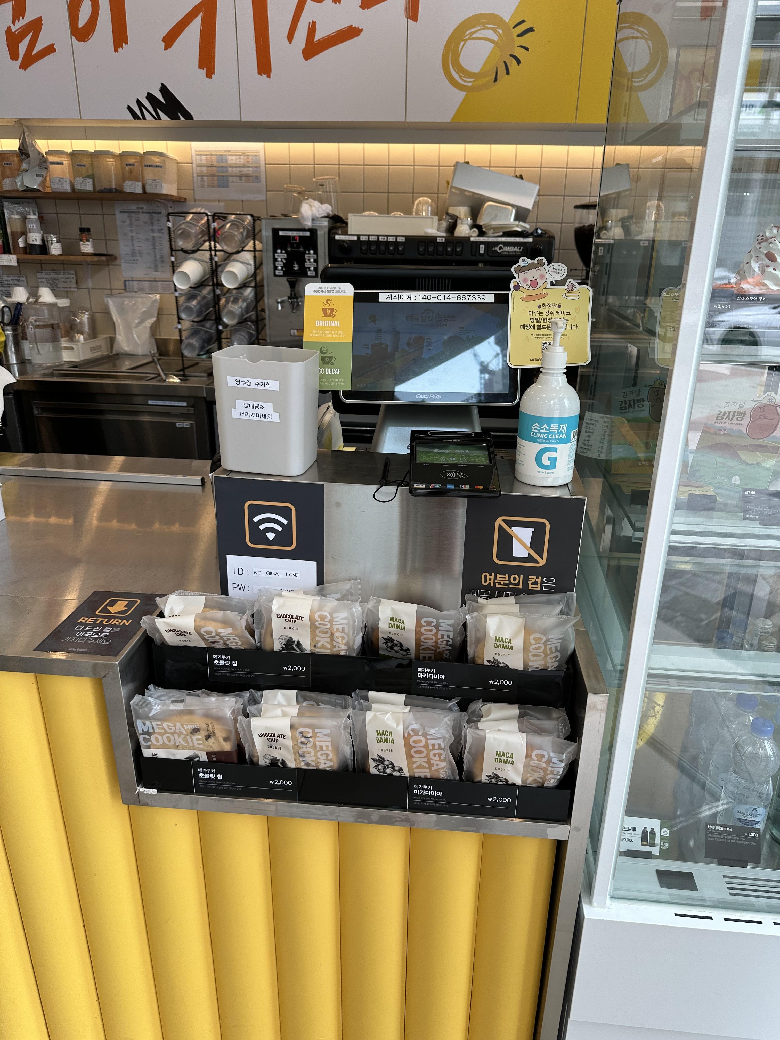 메가커피 반달섬점의 주문과 음료를 수령하는 카운터입니다. 메가커피 반달섬점을 방문한 저는 메가커피 아이스아메리카노 무료 할인쿠폰에 추가 금액을 지불하고 아이스 메가리카노를 주문했습니다.