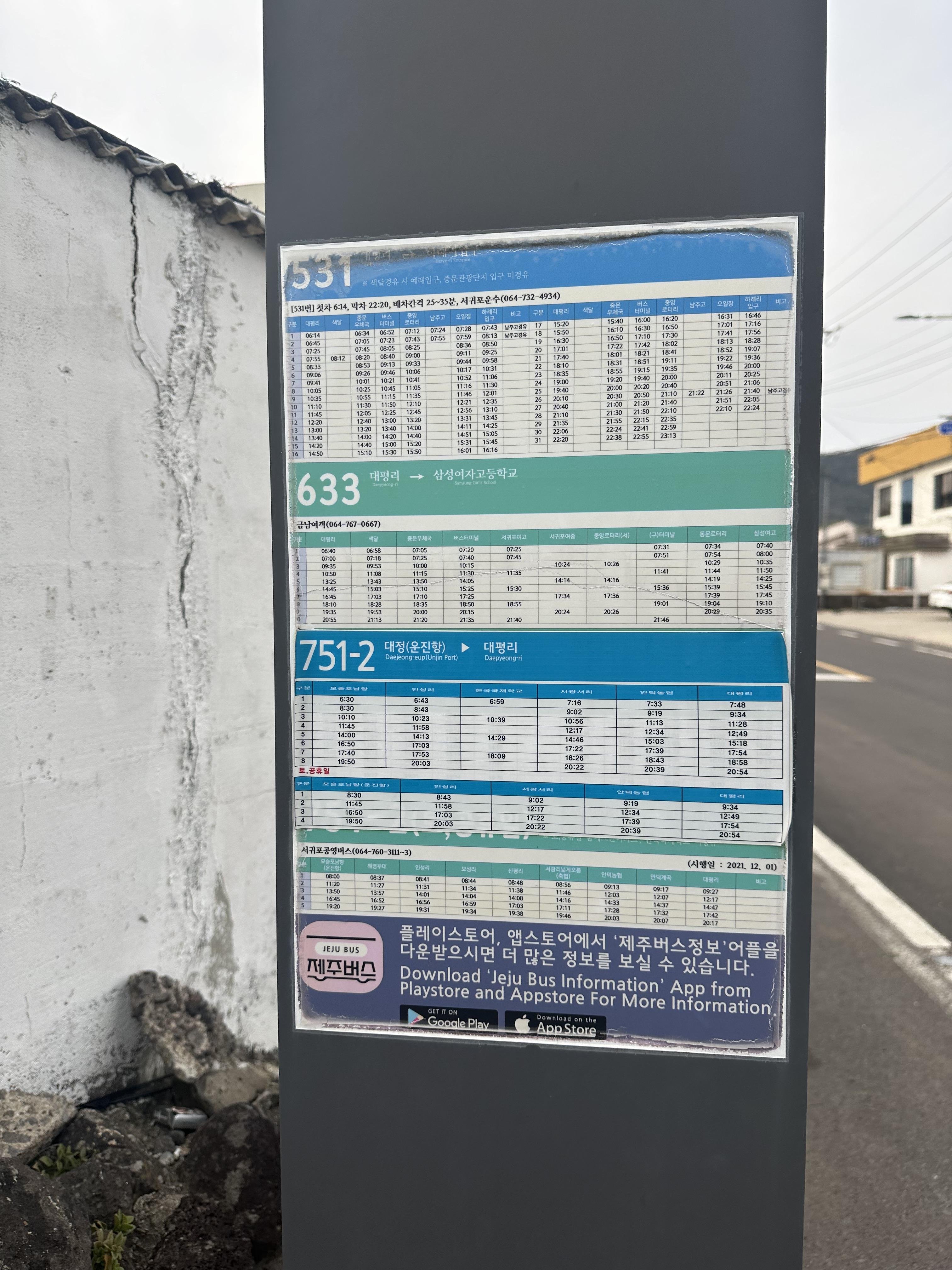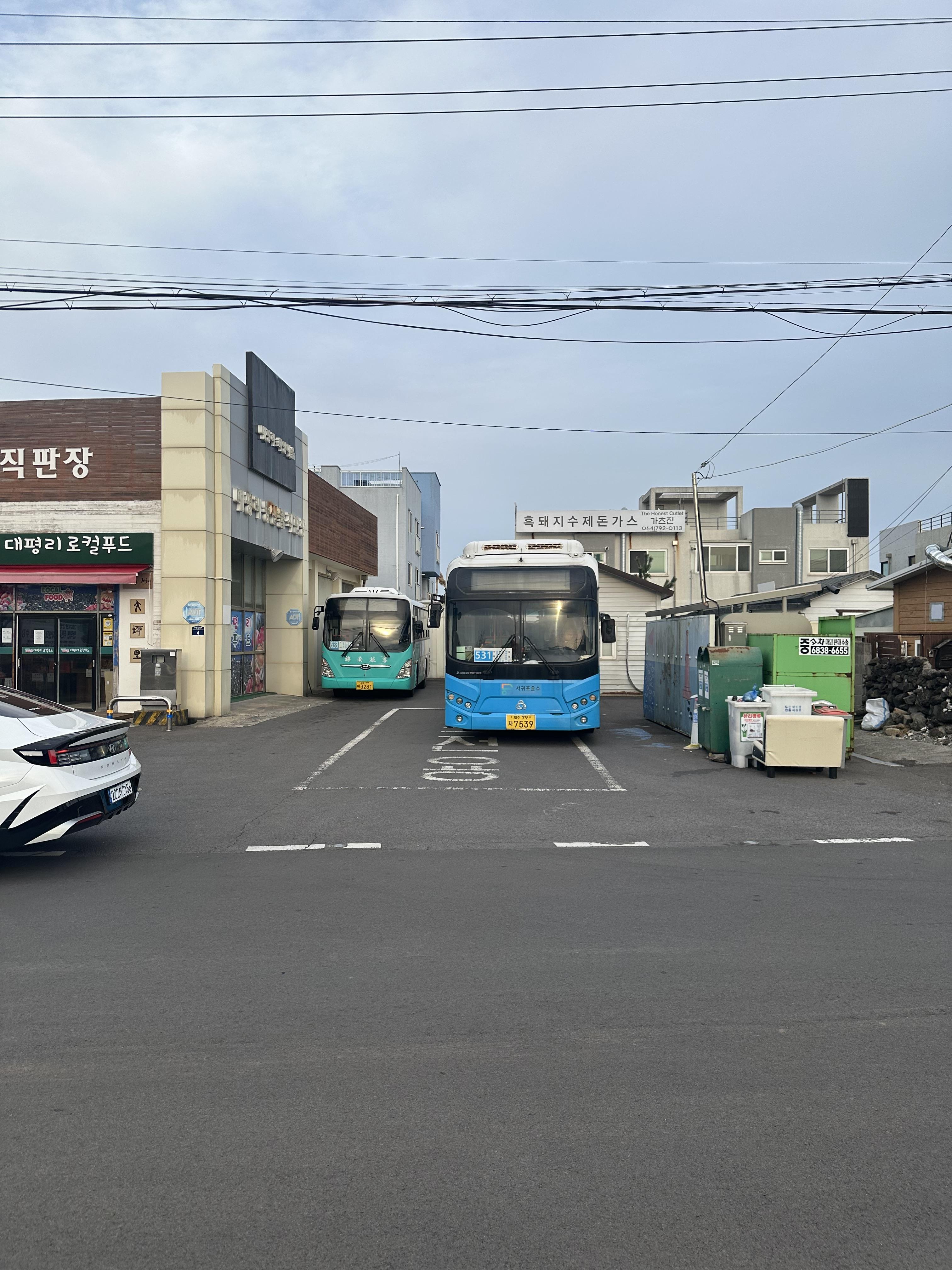 로즈베리 펜션에 체크인 하고 대평리에 유명한 박수기정을 보려고 나왔습니다. 원래 계획대로 타려던 531번 저상버스가 대평리 종점에 도착해있었습니다. 서귀포로 가기위해서는 531번과 633번을 타시면 됩니다. 531번이 배차가 좀 더 자주오니 531번 위주로 타시면 됩니다. 633번은 배차가 길고 약간 돌아서 가기 때문에 가급적이면 531번 타시길 바랍니다. 대평리 종점에서는 751-2번 노선도 있습니다. 대정(운진항)에서 대평리까지 운행한다고 하는데요. 이 노선이 유일하게 대평리에서 대정리를 거쳐모슬포까지 가는 노선입니다. 그러나 노선이 많지 않기 때문에 모슬포나 송악산 가신다면 제주공항에서 모슬포 방향으로 가는 급행버스를 타고 인근에서 서일주 노선 시내버스를 타시는 것을 추천합니다.