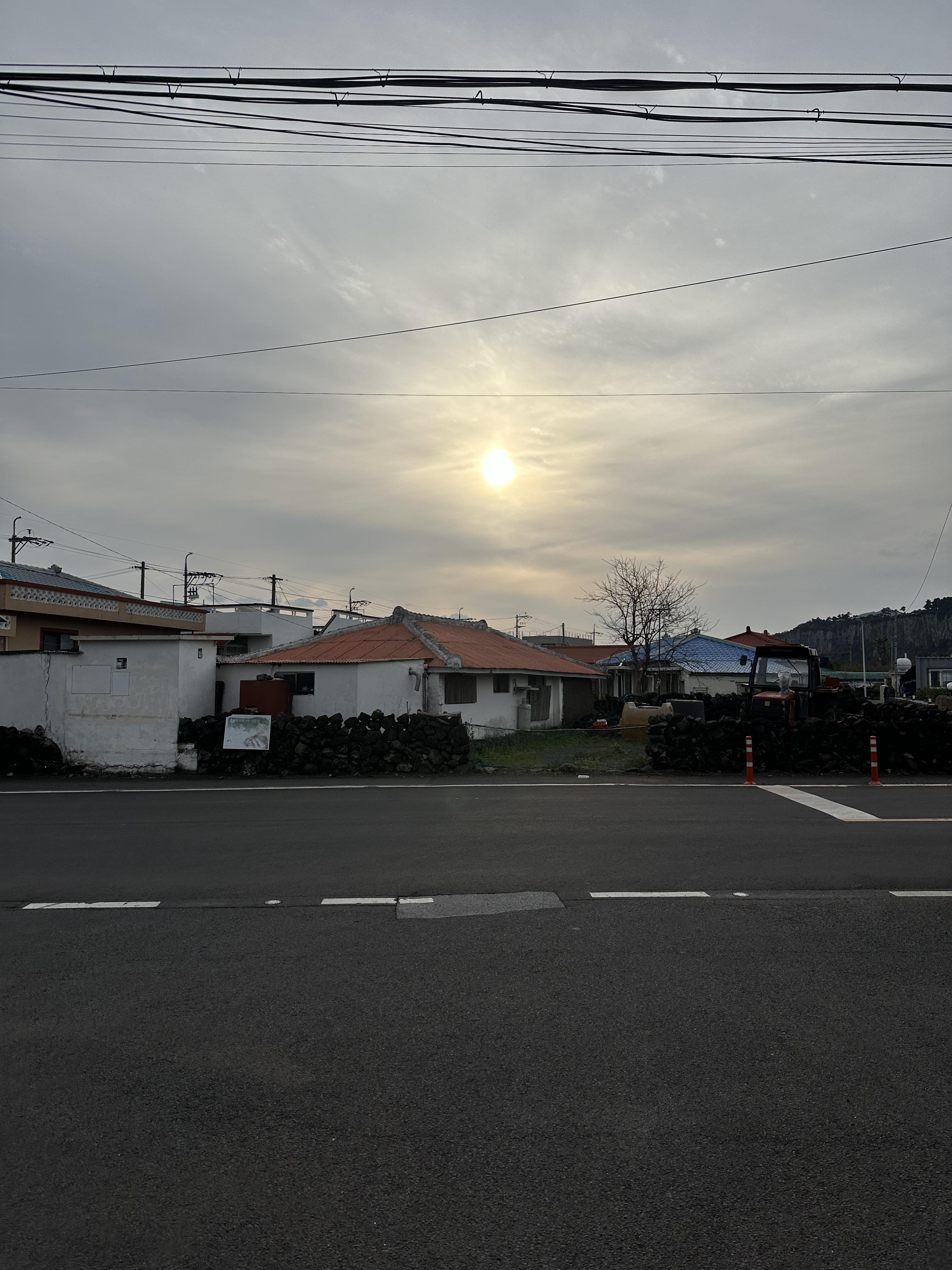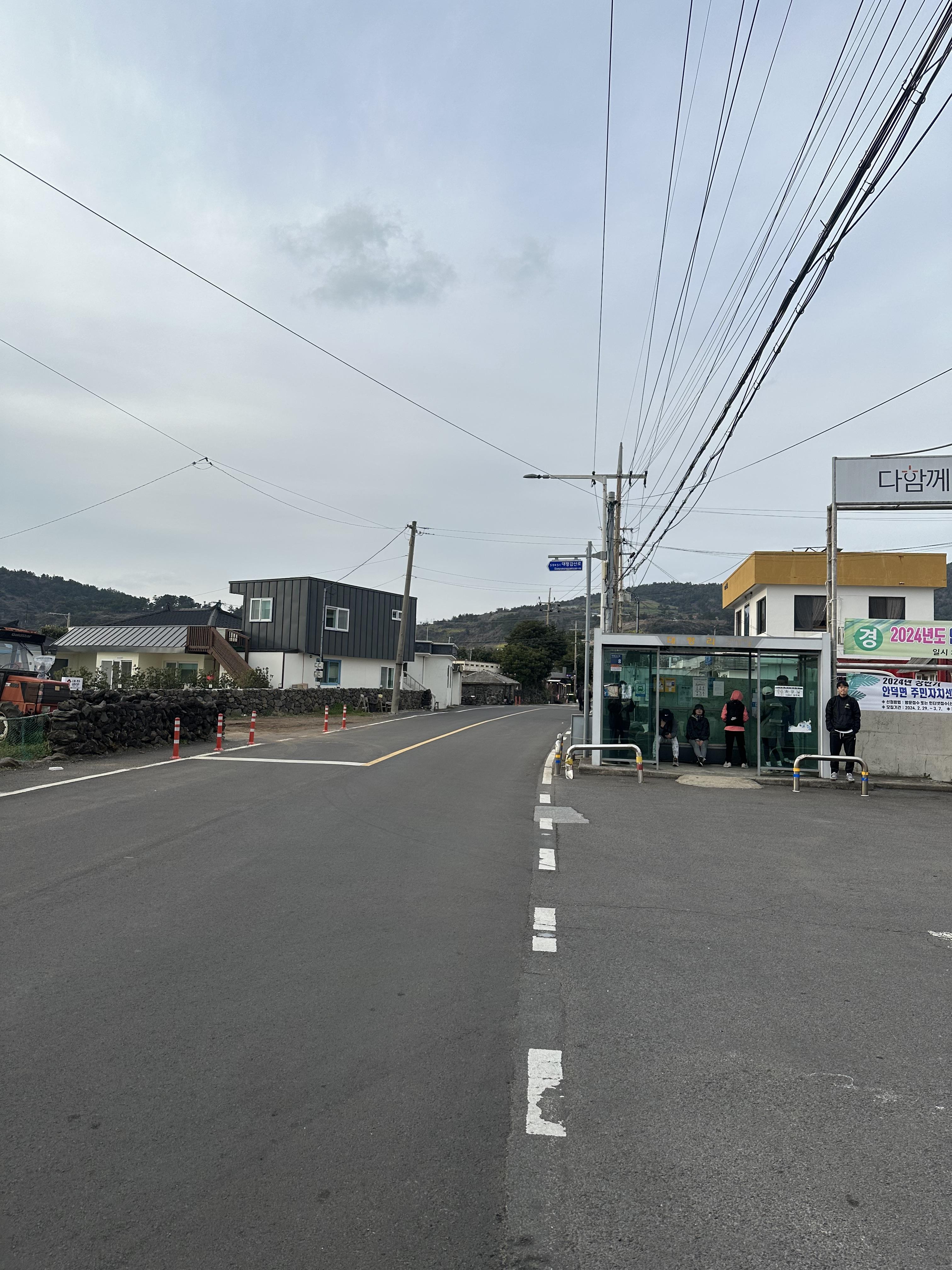 제주공항에 두시 넘었습니다 수하물을 찾고 점심을 먹다보니까 3시가 넘었습니다. 공항에서 서귀포 중문우체국까지 급행버스로 1시간이 넘는 시간이 소요되었습니다. 대평리까지 가는 버스가 바로 오지 않아 기다리다가 도착하니 5시가 안되는 시간이었습니단. 당시에는 3월이기는 하지만 5시가 넘으니 슬슬 해가 지고 있었습니다. 제주공항 근처 시내에서는 서울이나 경기도처럼 높은 건물과 아파트가 있는데요. 그 외에는 거의 낮은 건물과 함께 작은 마을이었습니다. 대평리 역시 마찬가지였습니다.