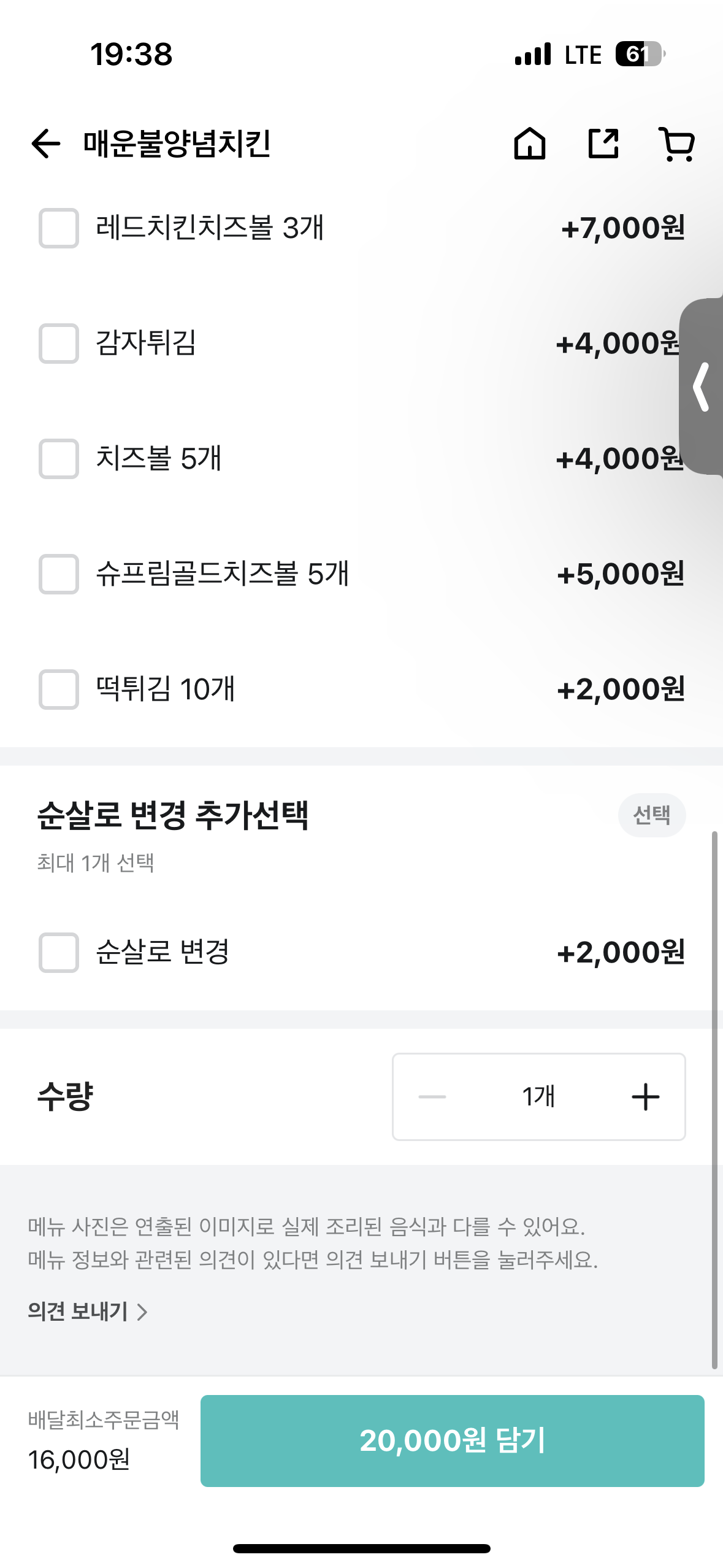 반달섬에 새로 입점한 처갓집양념치킨에서 매운불양념치킨을 선택하고 장바구니에 담았습니다.그리고 결제 하기 위해서 주문하기 버튼을 클릭했습니다. 제가 몇일전 포스팅에서도 언급했는데요. 지금처럼 모바일이 활성화 되기전에는 치킨집과 중국집에서는 직접 가게 사장님들이 쿠폰과 메뉴판을 집집마다 돌아다니며 날렸습니다. 물론 요즘에도 일부 사장님들이 배민에서도 홍보를 하지만 직접 아파트와 오피스텔을 통해 전단지를 날리고 있는 것을 볼 수있습니다. 또한 과거에는 음식을 주문 하면 배달과 함께 스티커를 주고 스티커를 모으거나 전달받은 쿠폰을 통해 직접 거래하며 이용했지만 요즘에는 배민에서 모바일 쿠폰 등을 통해 금액 할인등을 받을 수 있습니다. 처갓집 양념치킨에서 파는 매운불양념치킨은 2만원입니다. 순살로 변경시 2천원이 추가가 됩니다. 그리고 최근에 오픈한 가게라 그런지 4천원 할인쿠폰도 제공되고 있습니다. 배민에서 주문 시 꼭 할인 받을 수 있는 쿠폰이 있는지 미리 확인 후 저렴하면 고물가 고금리 시대에 조금이나마 도움이 됩니다.
