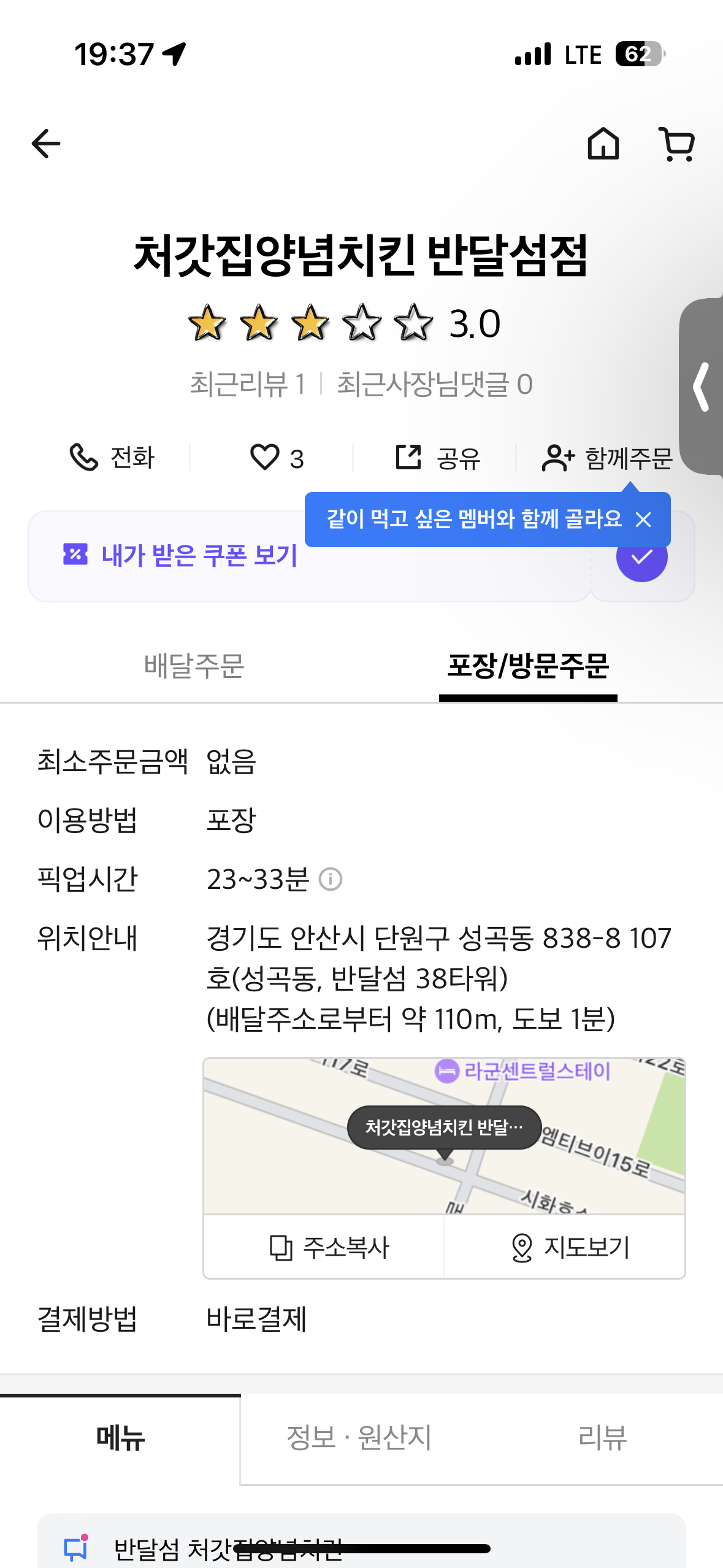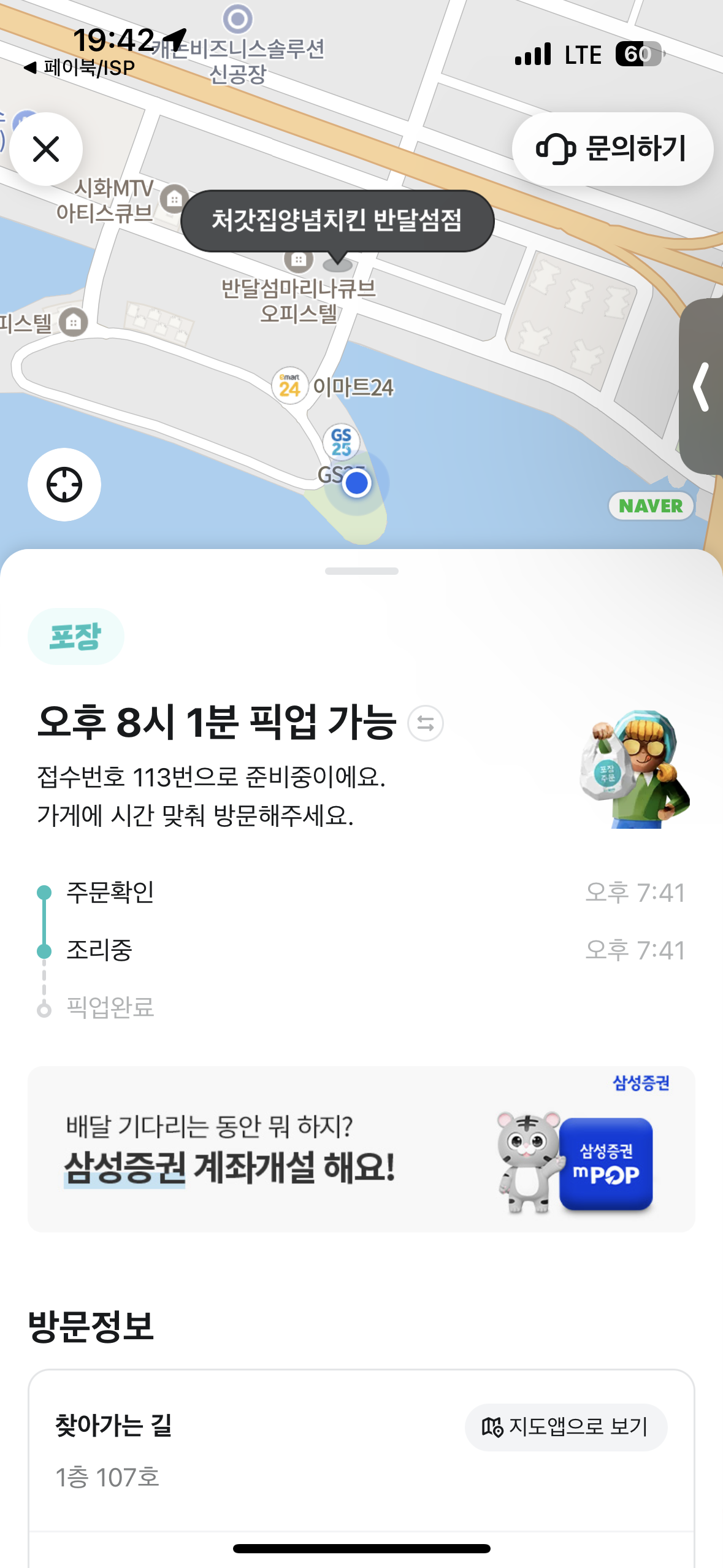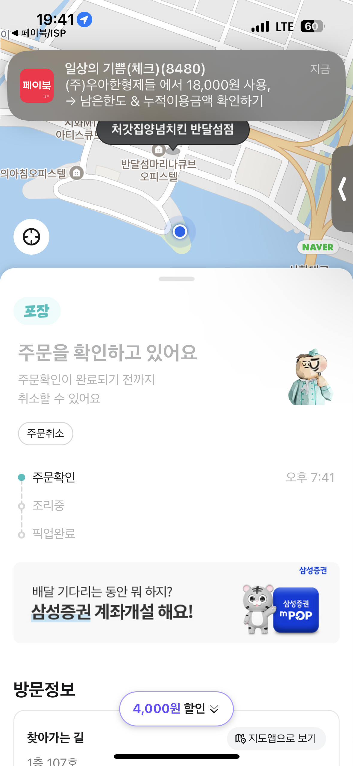 쿠폰을 적용해서 큰 어려움없이 포장 주문을 완료 했습니다. 7시 41분에 주문 했고 얼마 지나지 않아 주문 후 20분 후에 찾아오라는 포장 정보를 확인 할 수 있었습니다.