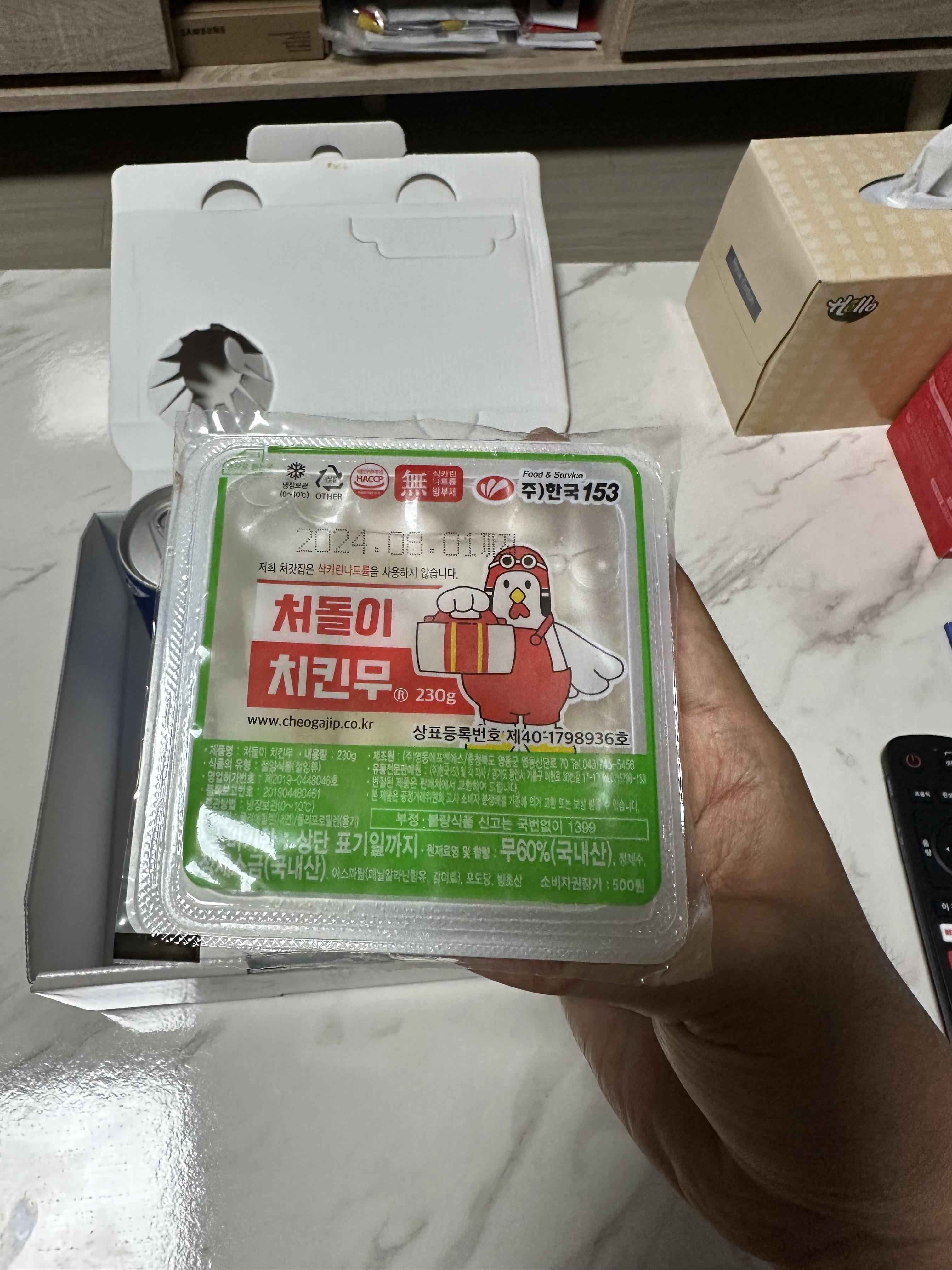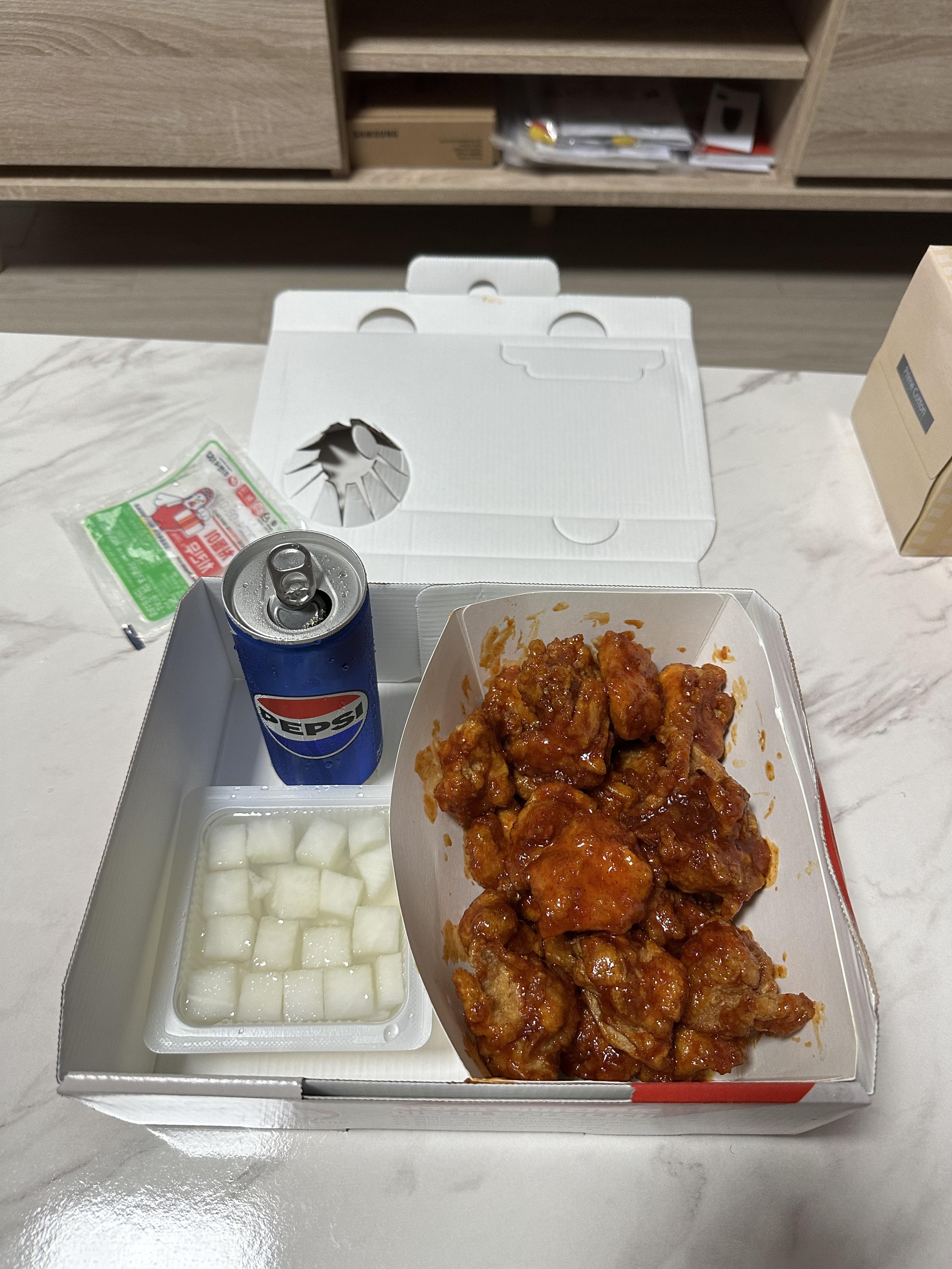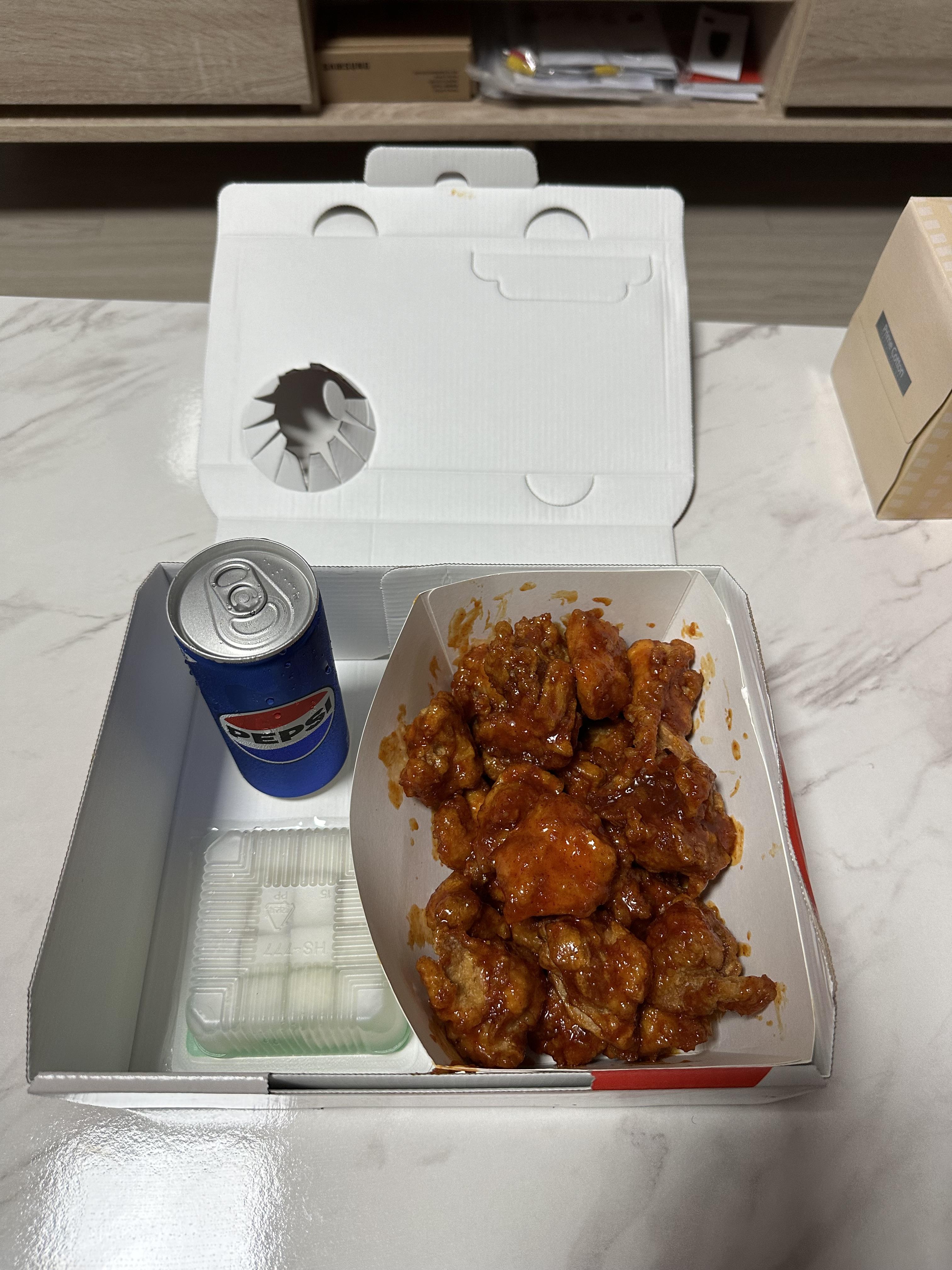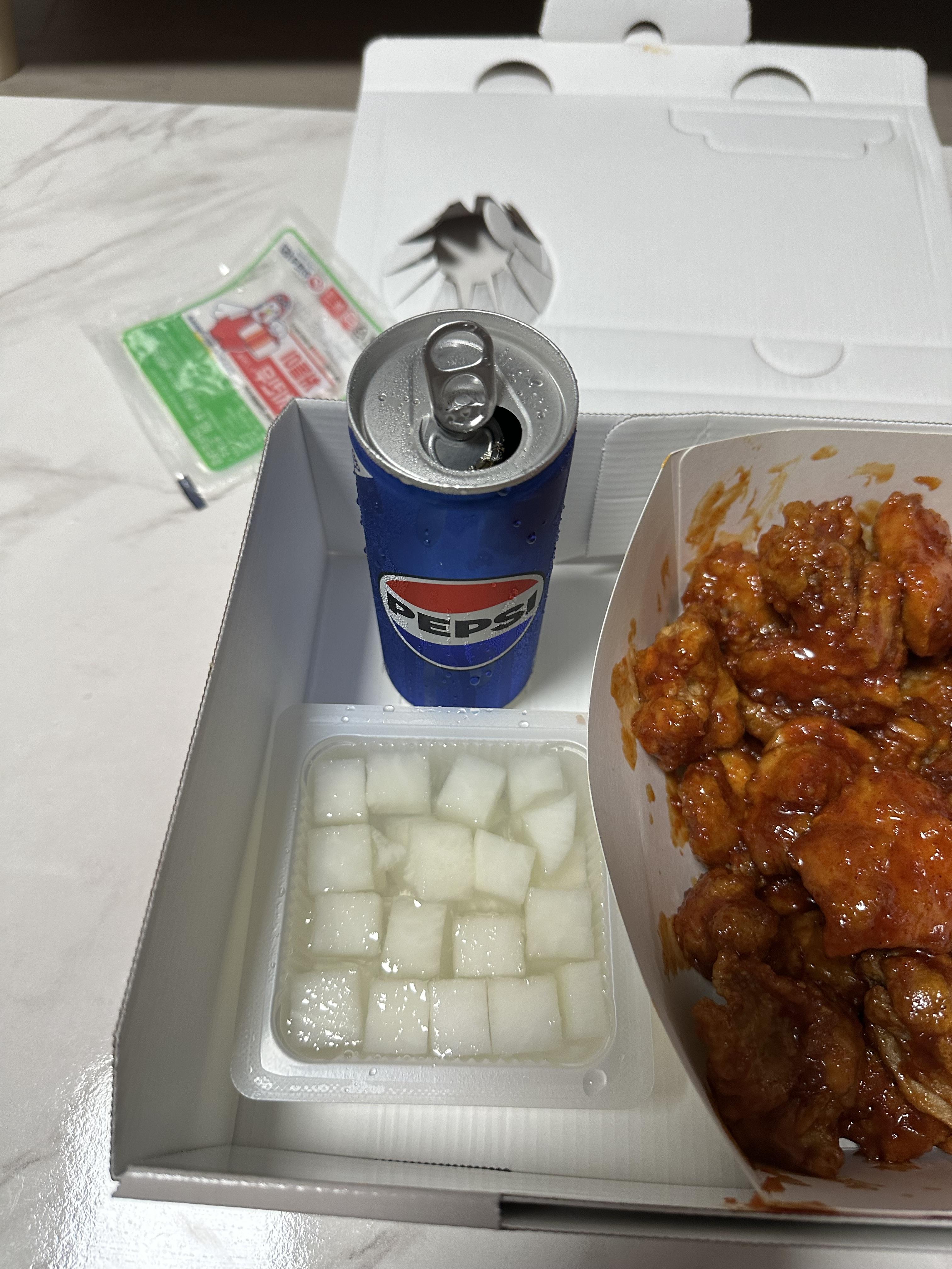 - 치킨과 무, 콜라 245ml가 제공되어요.