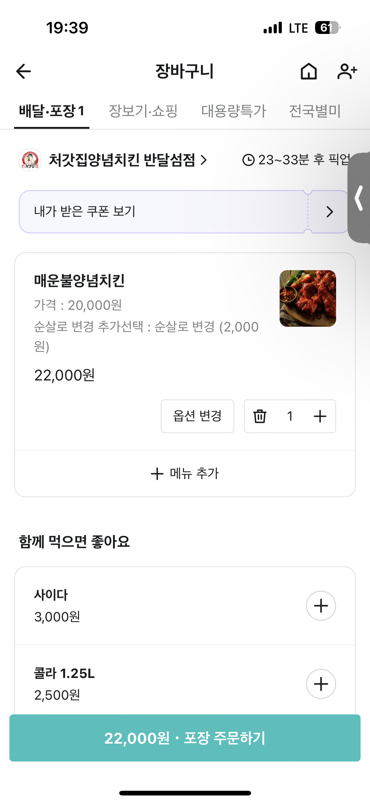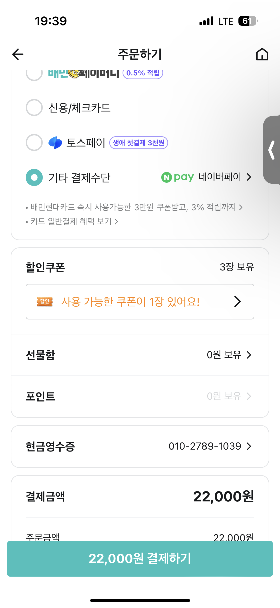 - 주문 하기 버튼을 클릭하고 결제 하기 위해 정보 확인 하는 화면에서 할인 쿠폰 있어요.
