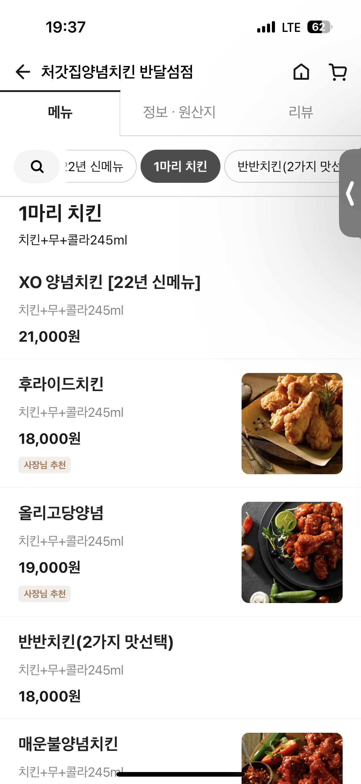 - 1마리 치킨, 반반치킨, 1마리 순살치킨 등 있습니다. 순살이 좋으면 순살치킨으로, 후라이드와 양념 모두 모두 먹고 싶다면 반반치킨 추천드려요