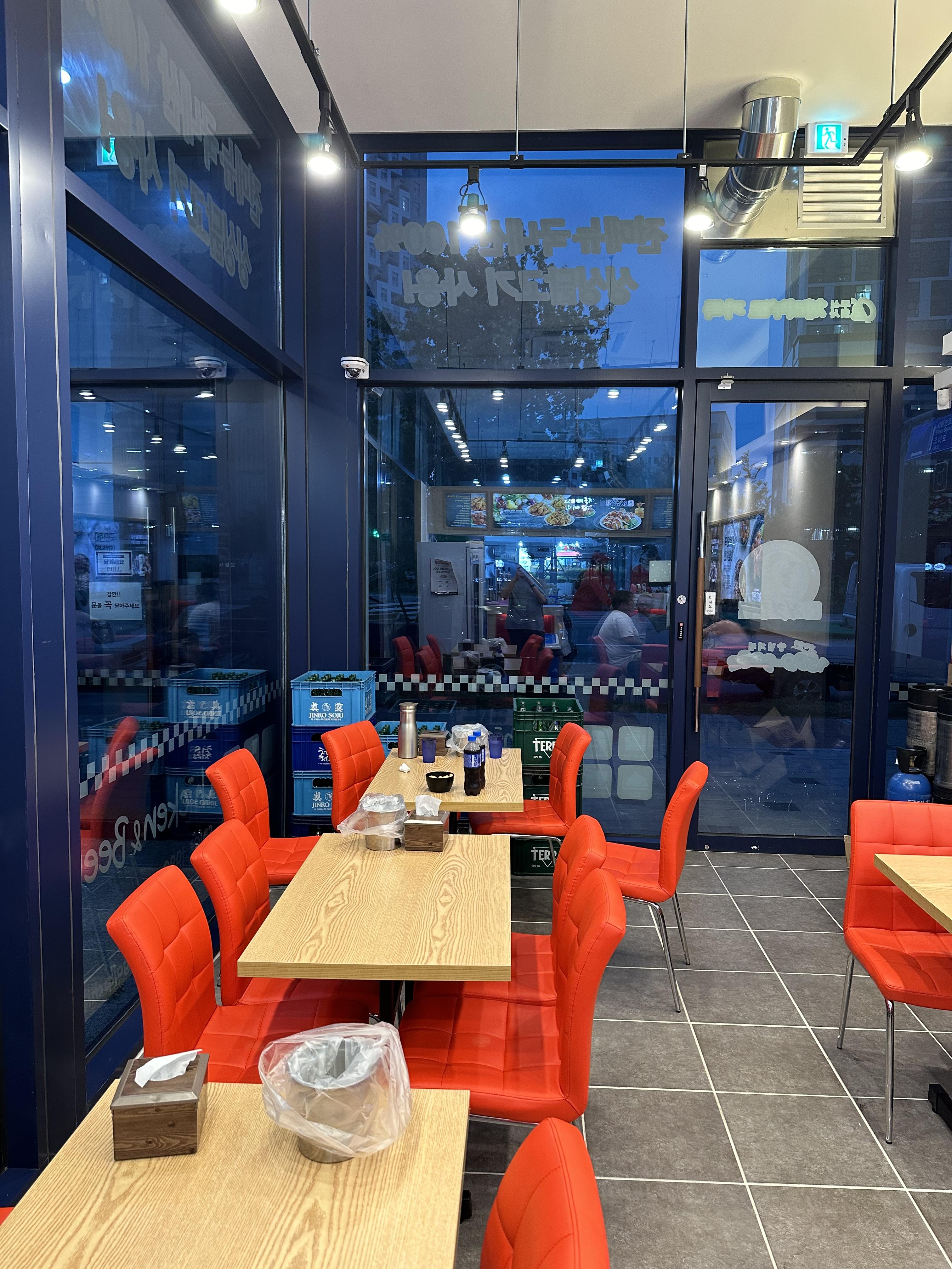 처갓집치킨 반달섬점 매장 내부입니다. 그렇게 넓지는 않아 많은 손님들을 받기에는 한계가 있어 보이기는 하는데요 전체적인 매장길이는 길어서 충분한 테이블과 의자들이 비치 되어있어요. 반달섬내에 있는 상가 대부분이 넓이보다는 길이가 길다는 것을 확인 할 수 있는데요.