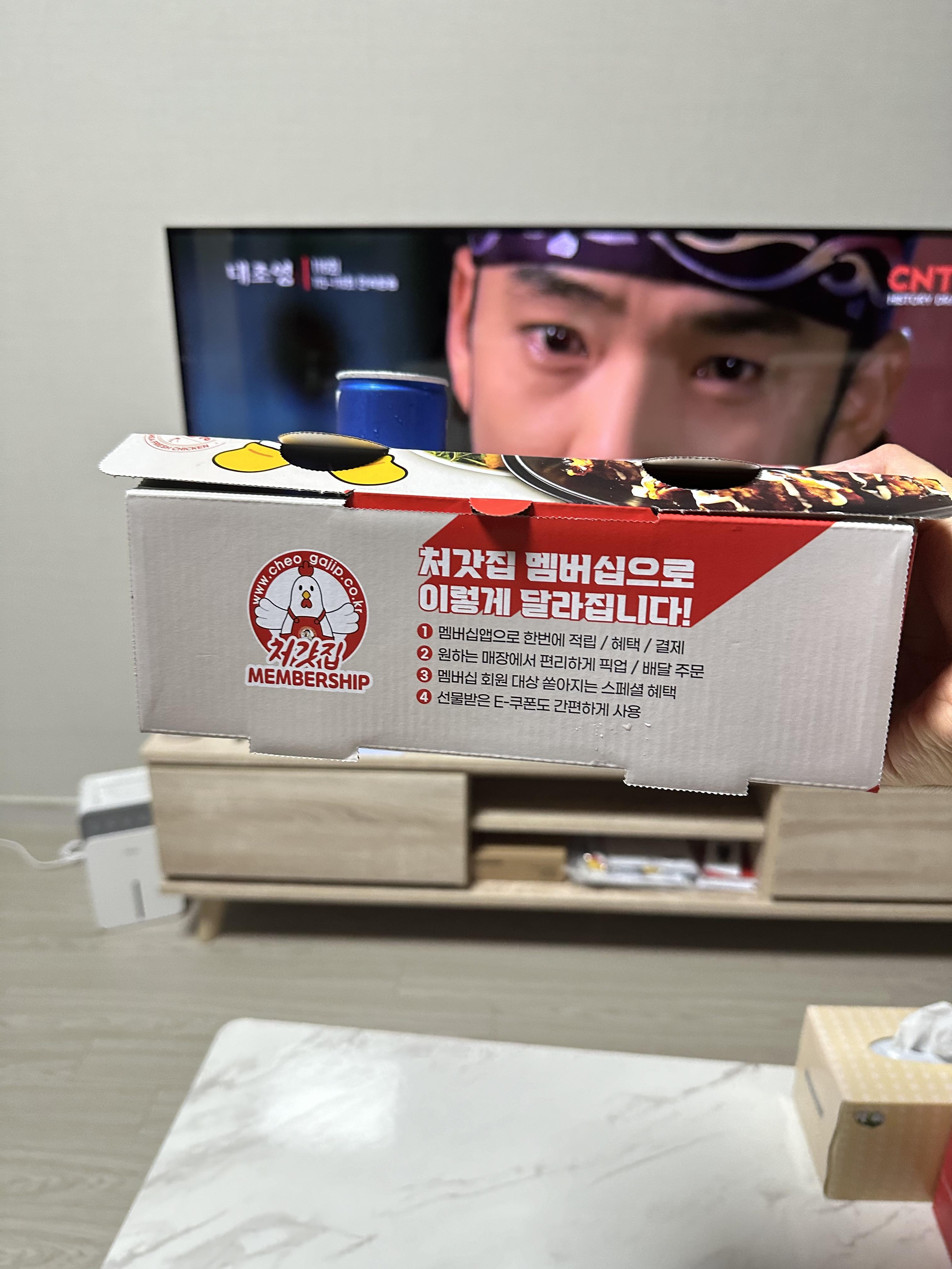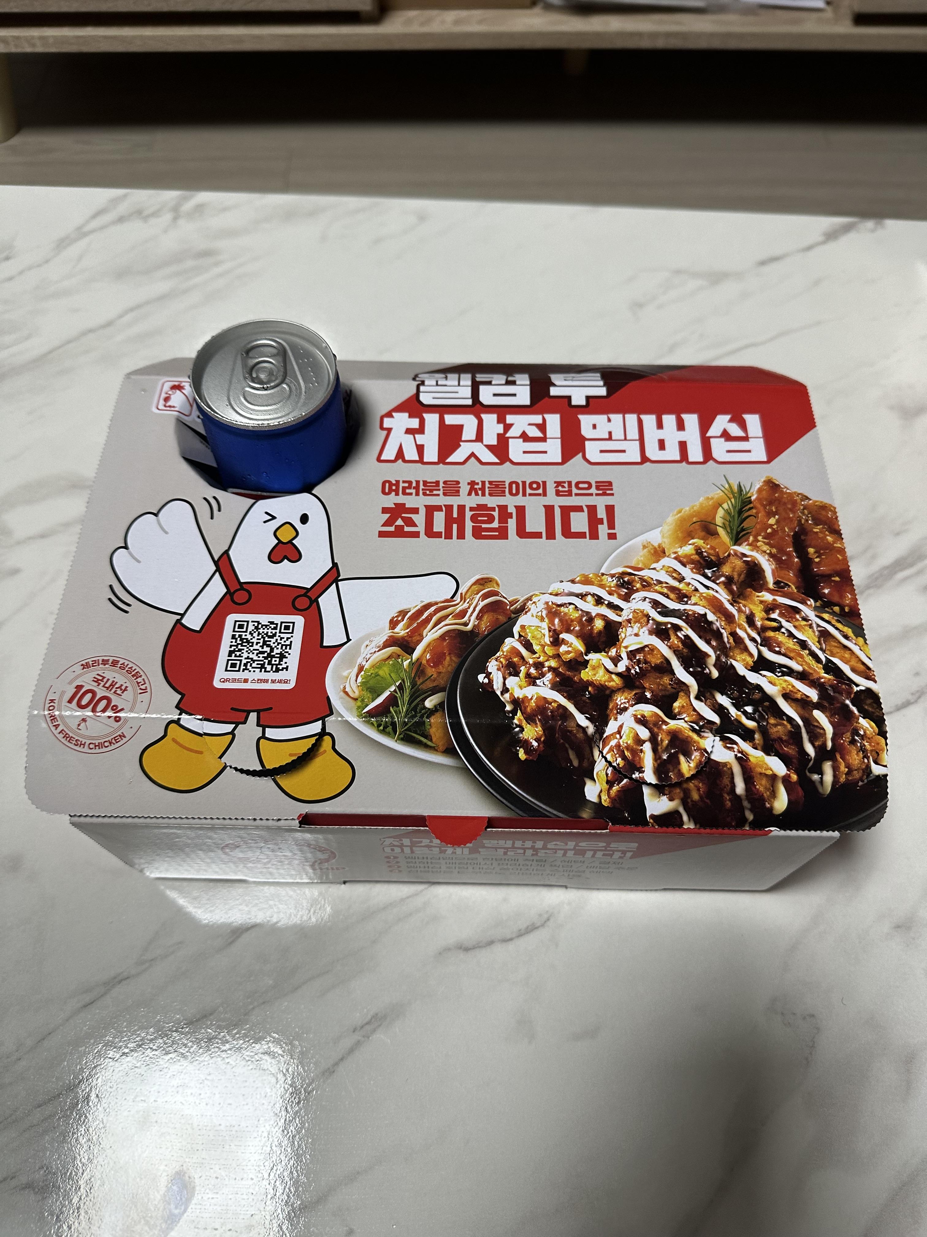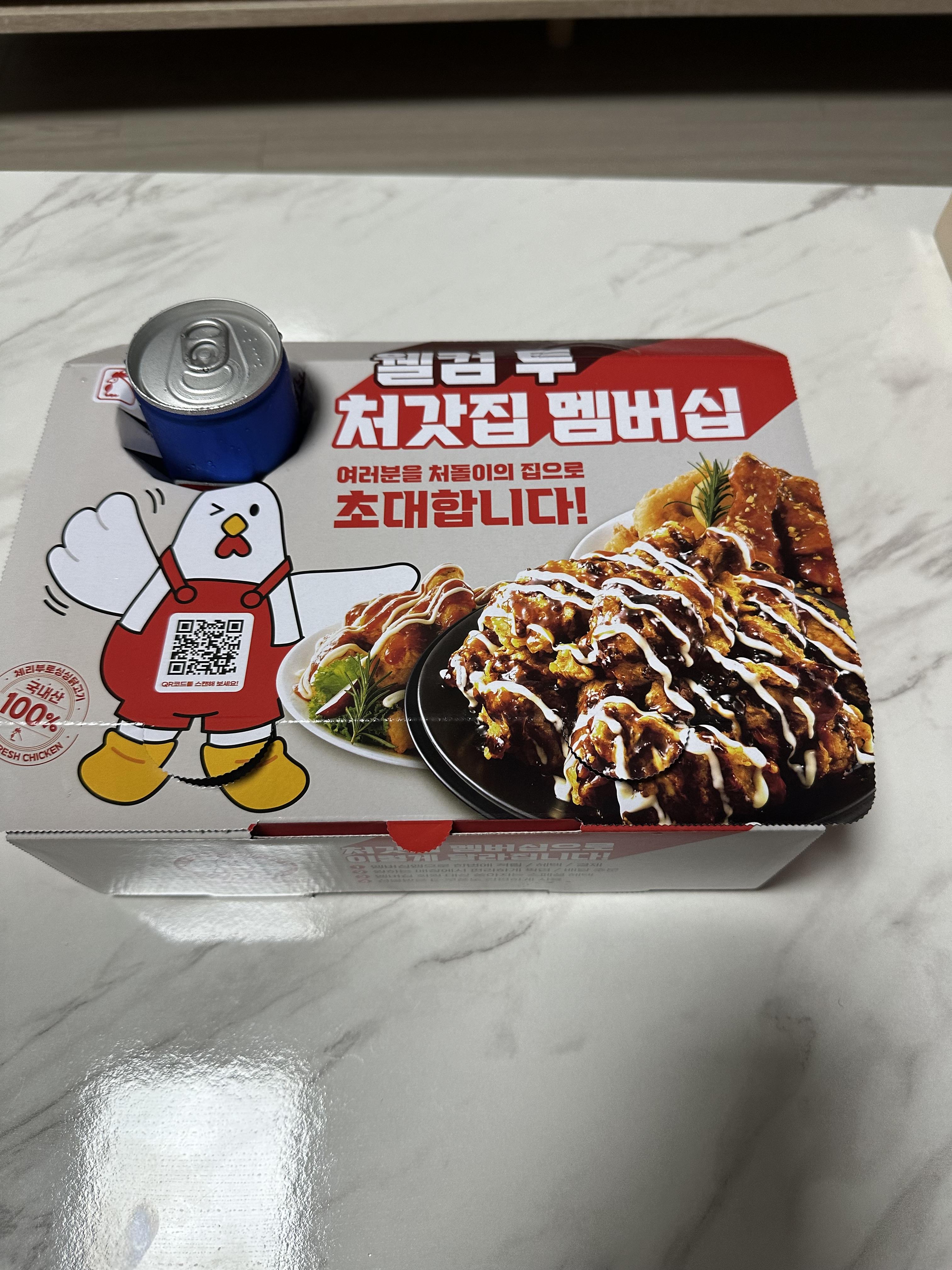 집에 도착 후 픽업해온 처갓집양념치킨 매운불양념치킨을 포장 비밀봉지에서 꺼내었습니다. 박스가 좀 특이하게 생겼습니다. 보통 음료와 치킨 박스는 분리되었는데요. 처갓집양념치킨의 포장박스 한쪽에는 음료를 고정시켜서 치킨과 음료가 마치 한박스에 들어갈 수 있도록 구성되어있었습니다. 또한 처갓집양념치킨의 경우에도 우리가 흔히 보는 카페처럼 멤버십제도가 있었고 멤버십으로도 혜택을 이용 할 수있다고 합니다.